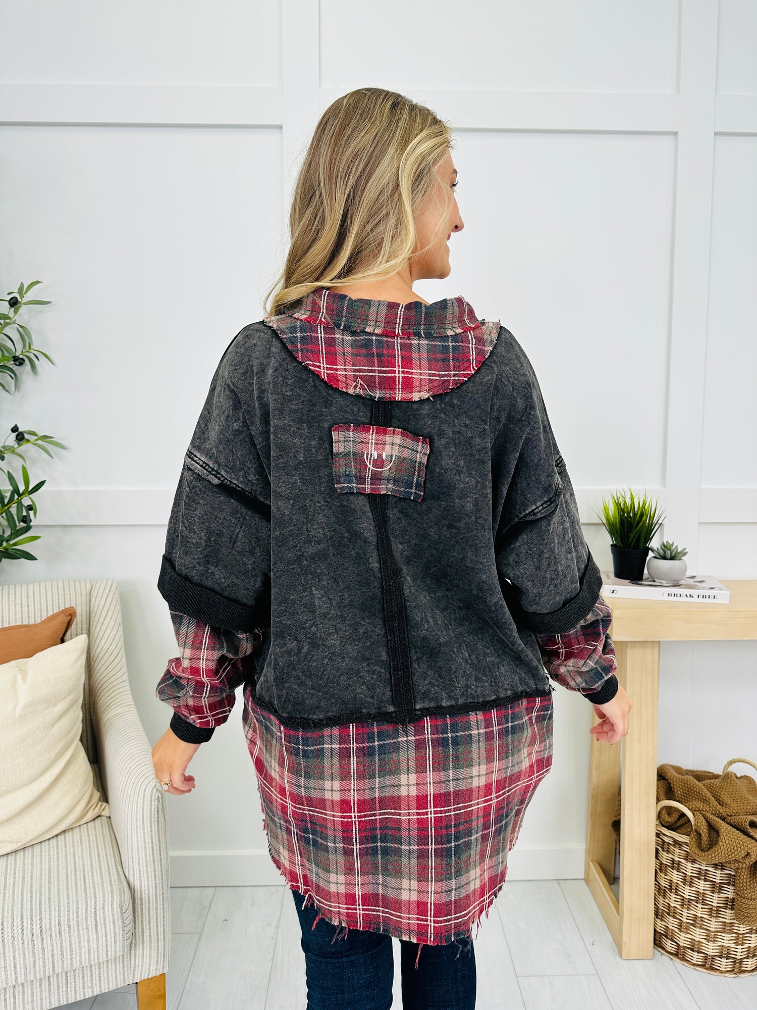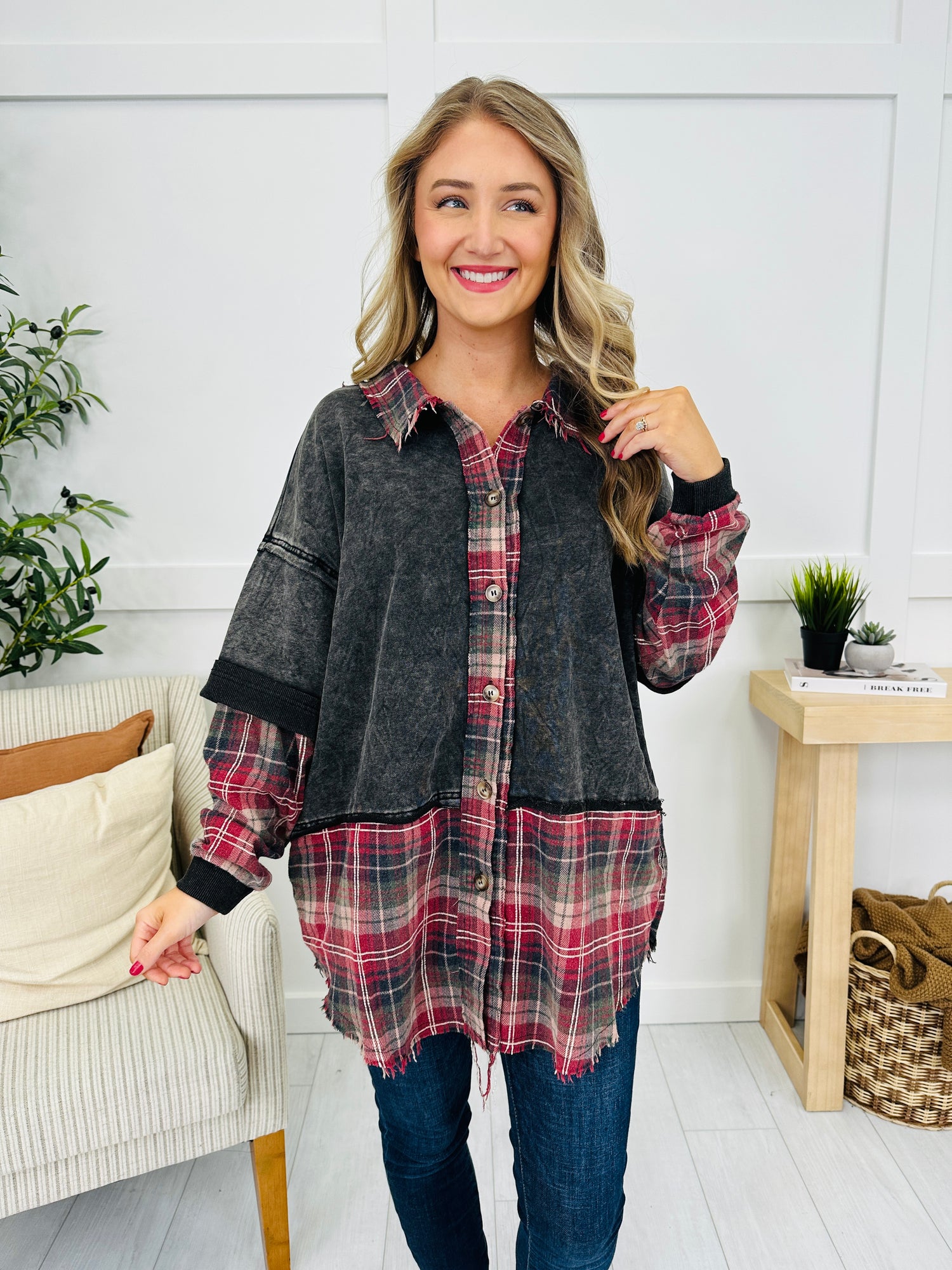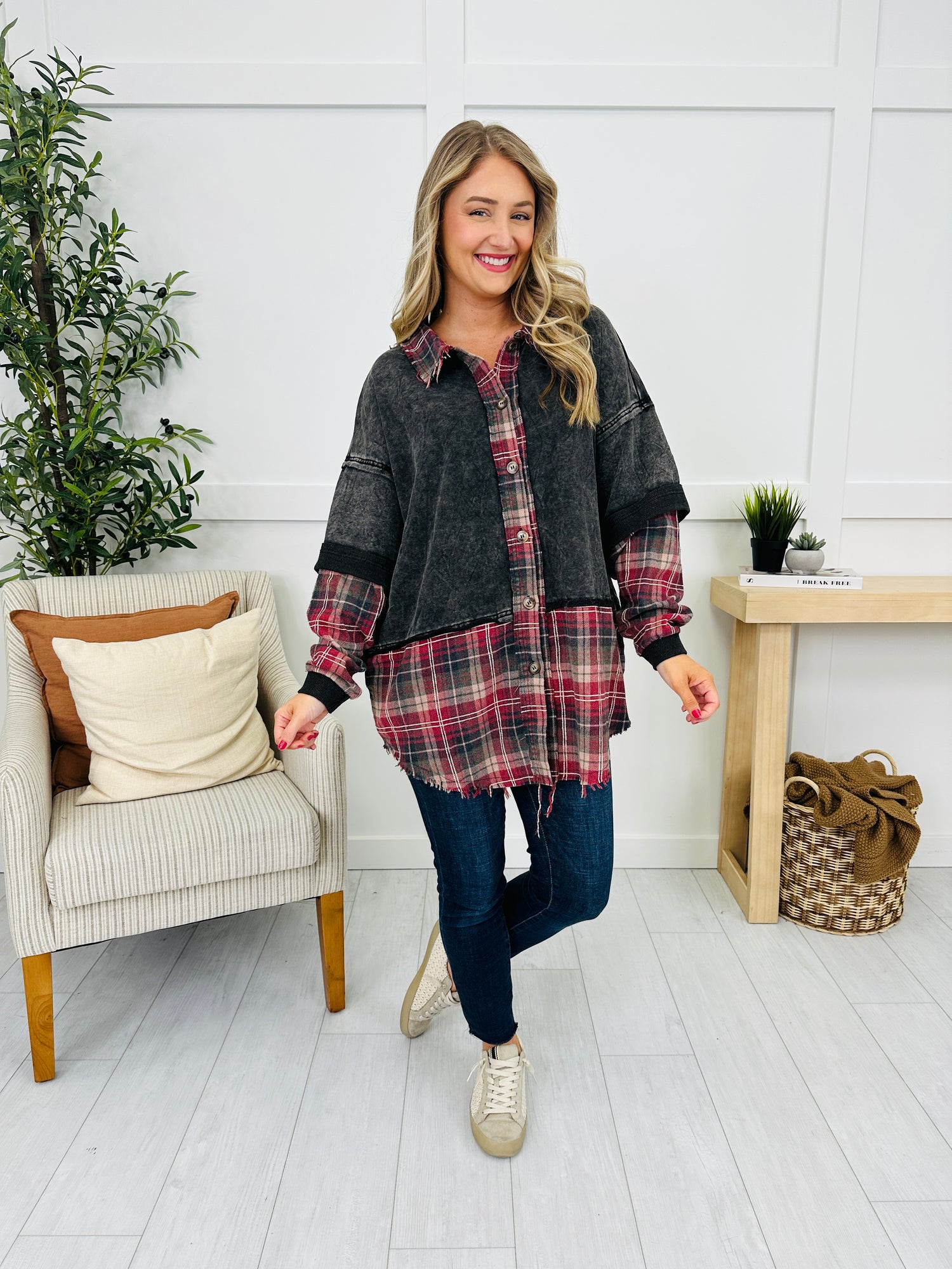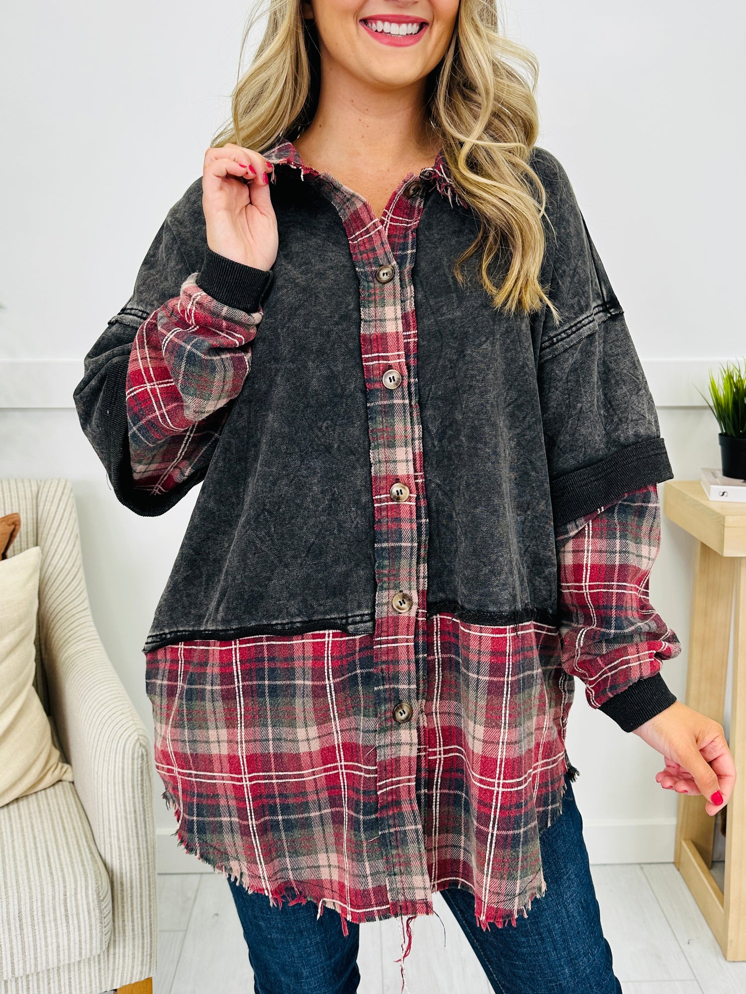 This plaid shacket brings an edgy twist to a cozy classic. The mixed plaid contrast adds depth and texture, while the frayed hem and reverse stitch details give it that perfectly lived-in look. Finished with a button front design and soft color blocking, it’s the ultimate layering piece for an effortlessly cool vibe.