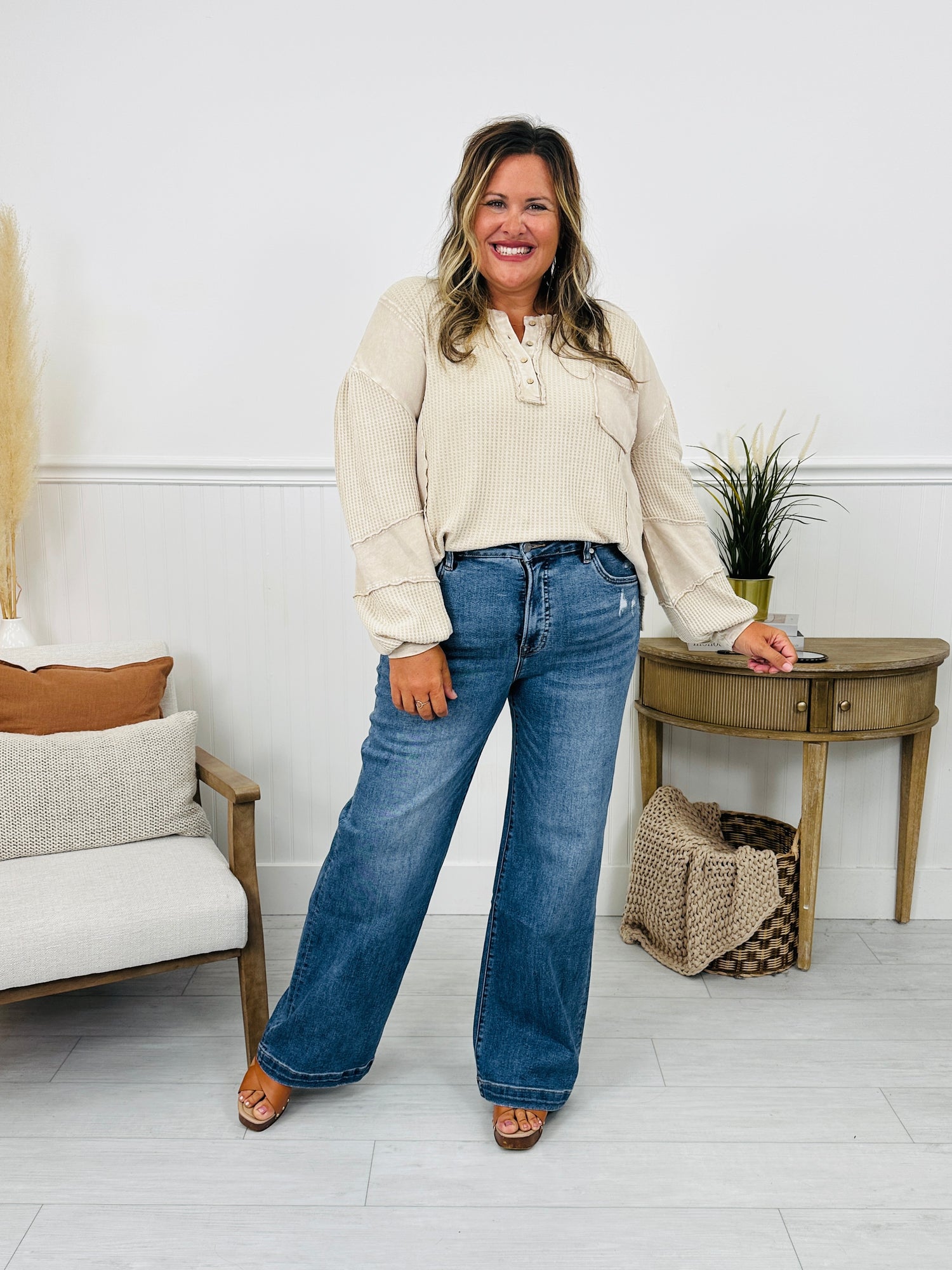 Fall into trend this season with these brand new wide leg trouser jeans. These jeans feature our viral tummy control panel that is going to suck you in and slim you out for a confidence boost that you didn't know could exist. The high rise adds an extra touch of flattering to these jeans and they look amazing on every single body type.