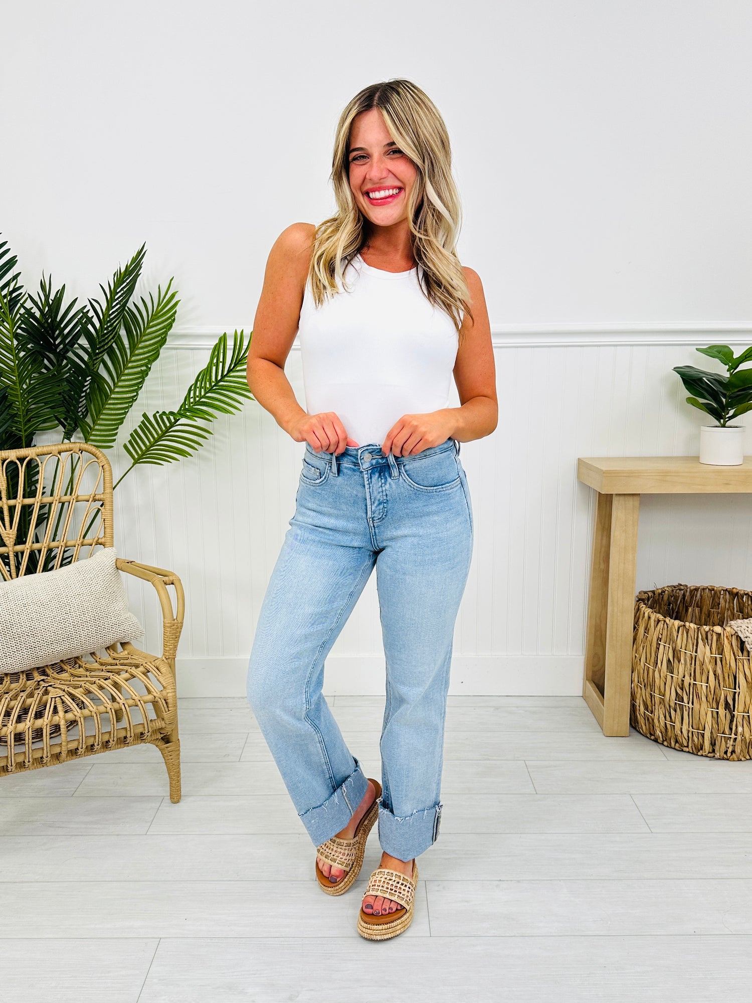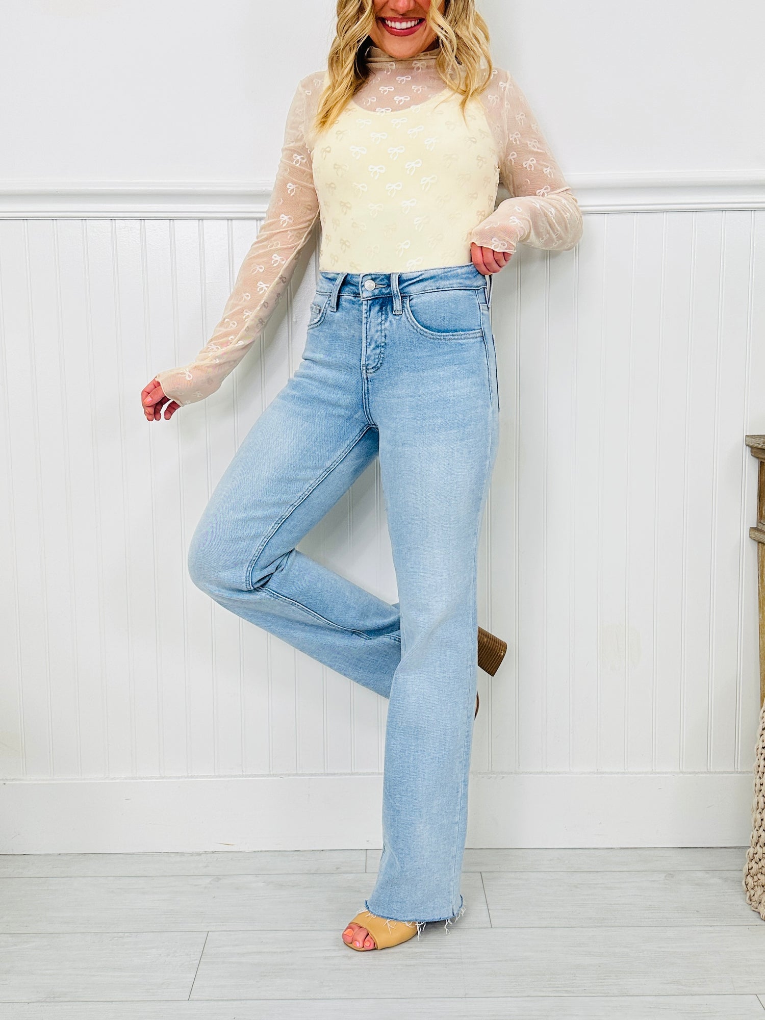 These jeans will have you feeling brand new! ;) Slim wide leg jeans are our new best selling style of jeans! These jeans give you the trendy appearance of a wide leg jean but have a slimmer leg opening, making them flattering on every single body type. These jeans also have a tummy control panel, which is going to suck you in and slim you out in all the right places!