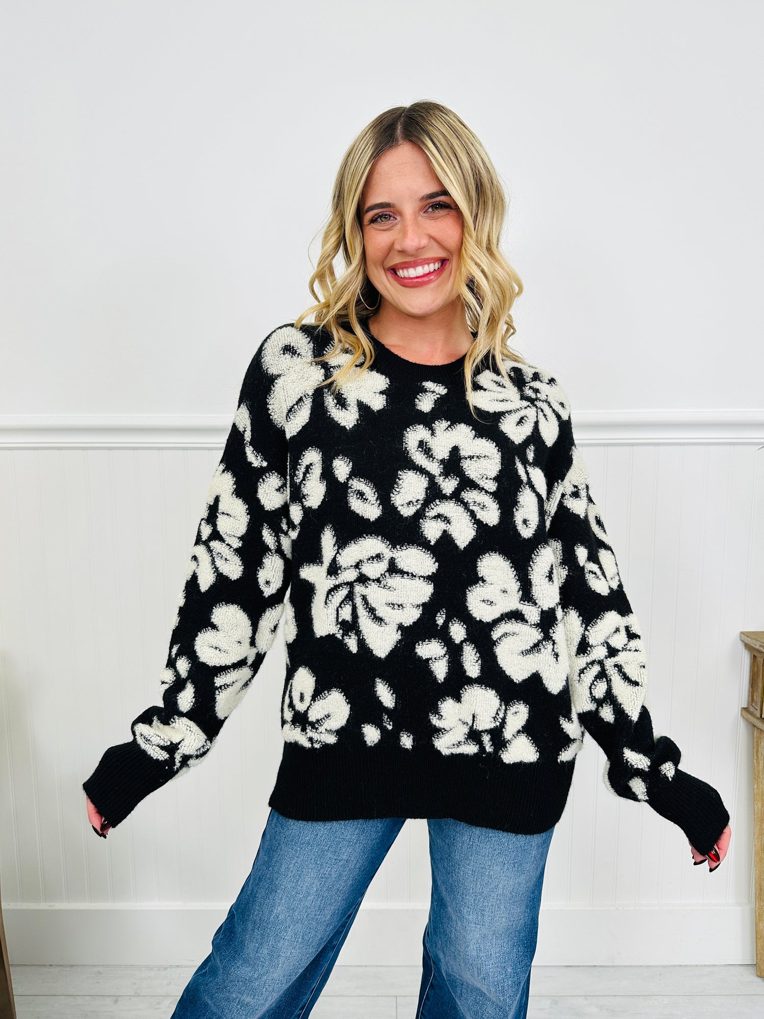 The floral design adds a touch of charm and femininity, making it an easy choice for both casual and dressier fall looks. Available in three beautiful colors, the Feeling Floral Sweater is a must-have piece that brings warmth, texture, and style to your fall wardrobe this season.