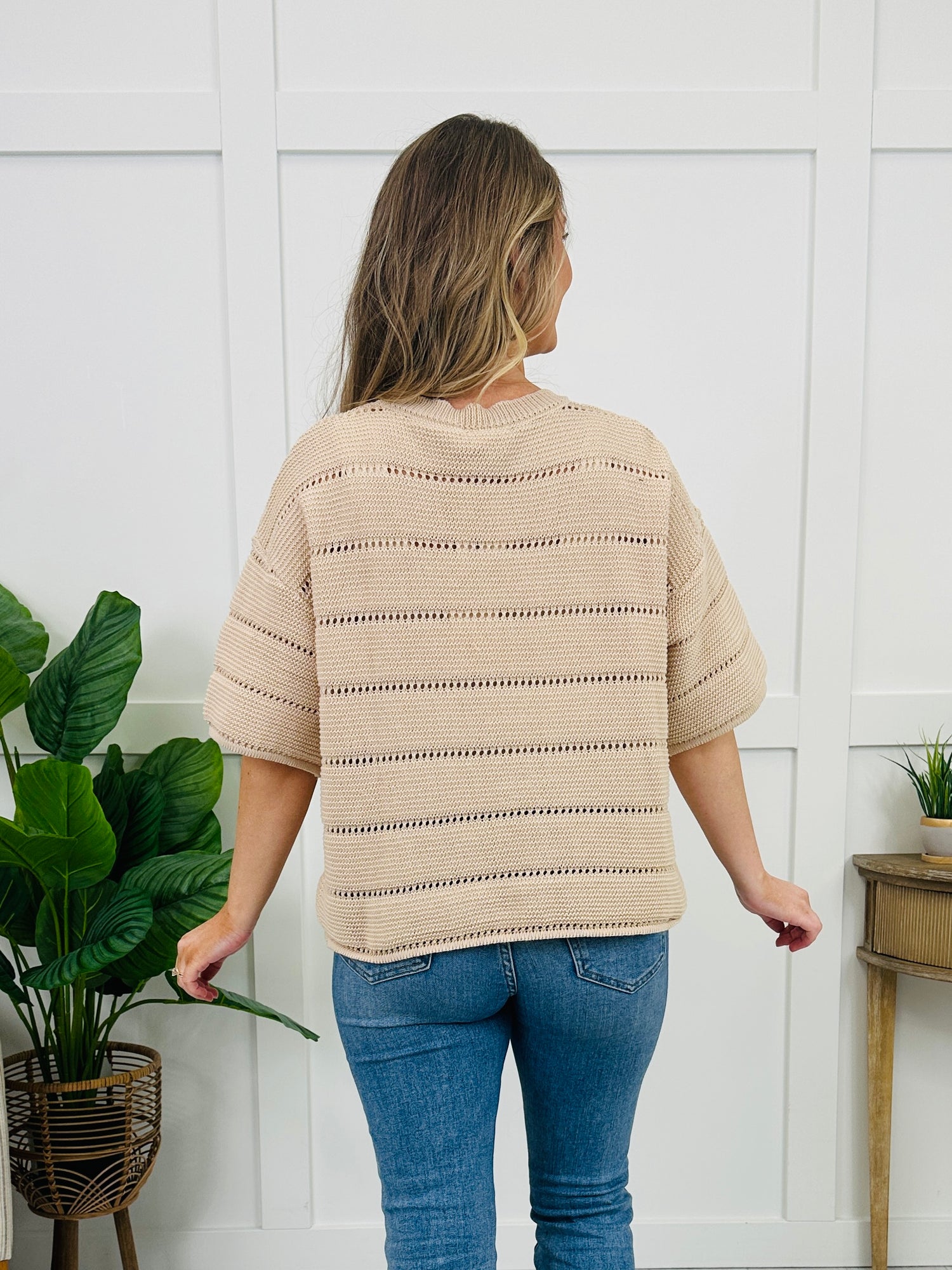 This sweater top features a classic crew neckline with an oversized crochet flower front and center for a sweet, standout touch. The airy open-knit striping gives it a lighter feel, while the relaxed shape keeps it comfortable and easy to wear. With its short sleeves and effortless drape, it’s one of those pieces that looks a little extra without trying too hard. Pair it with denim for a simple, pulled-together look that still feels fun and fresh.