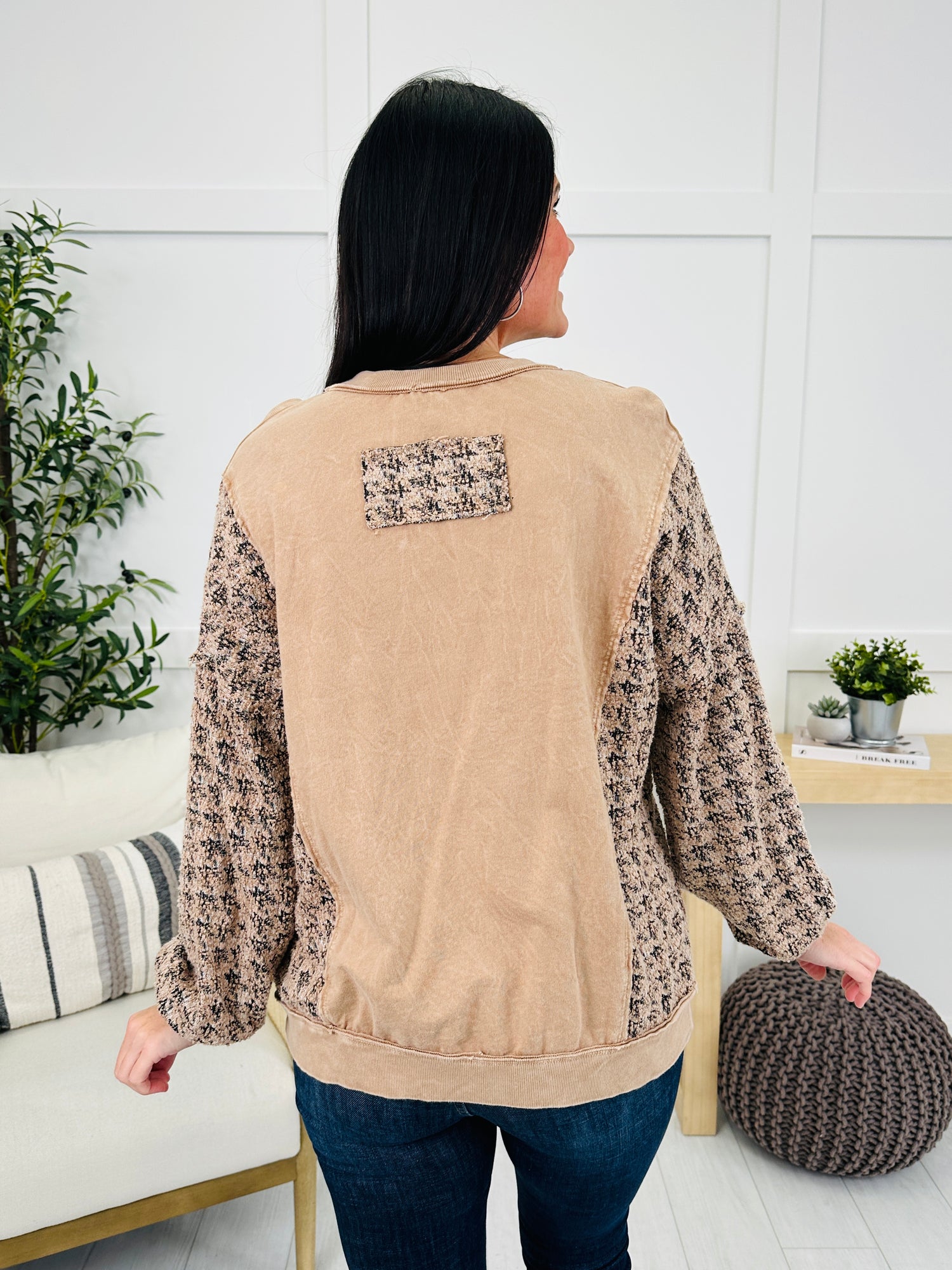 This top blends casual comfort with a touch of texture for a look that’s effortlessly chic. The solid front pairs beautifully with the textured houndstooth sleeves, creating a stylish mixed-fabric contrast. Finished with exposed seam details that add a trendy edge, this piece is perfect for cozy days with a fashionable twist.