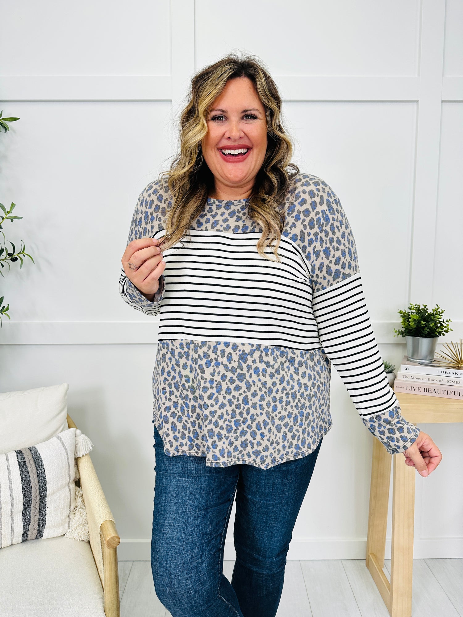 This top blends two bold prints into one playful design, featuring a striped center framed by leopard detailing along the upper bodice, sleeves, and hem. The mixed-print look adds personality without overwhelming the silhouette, making it an easy standout piece for everyday wear. Long sleeves and a relaxed shape keep it casual and comfortable — just toss it on with denim and let the pattern do the work.