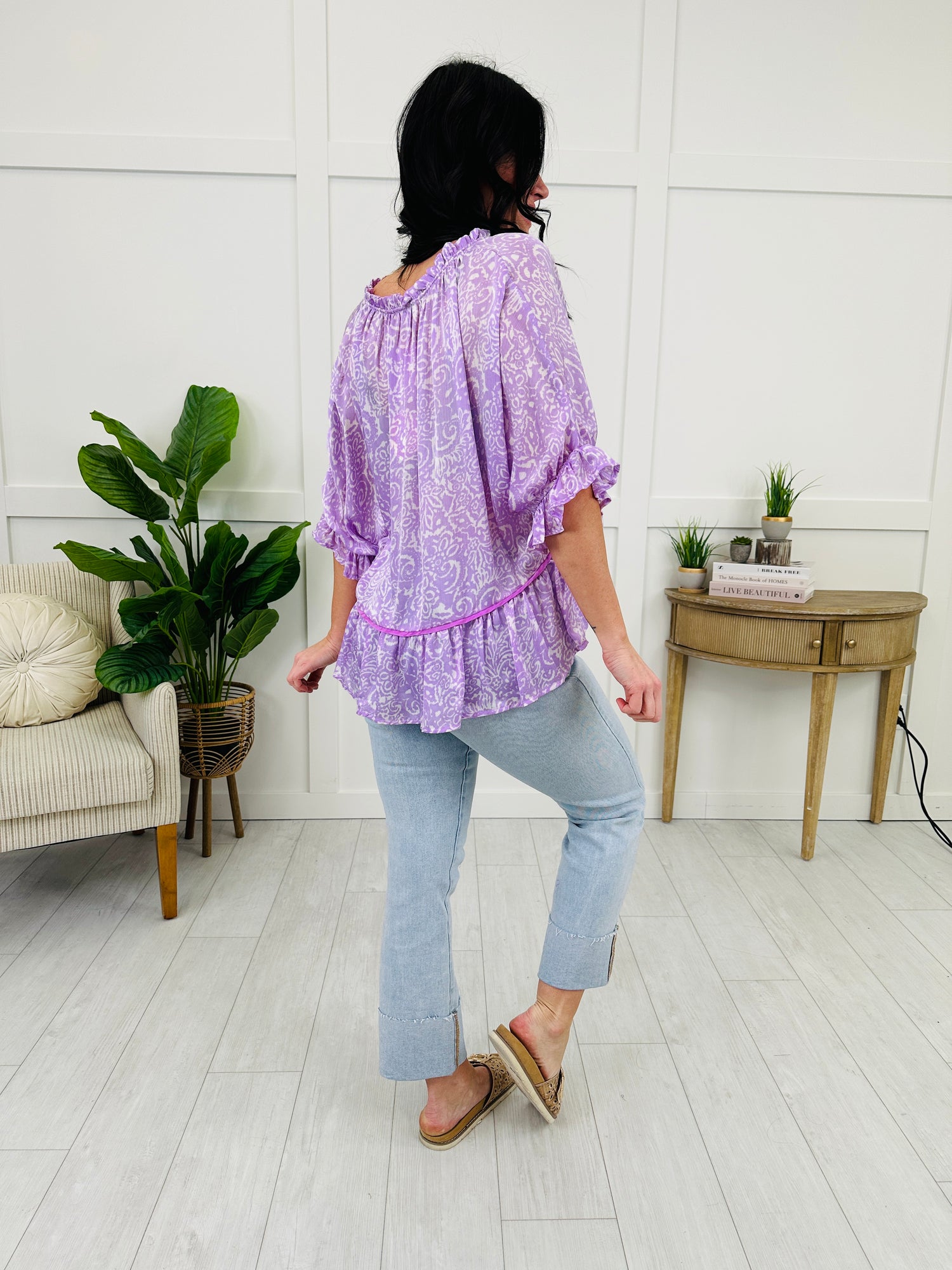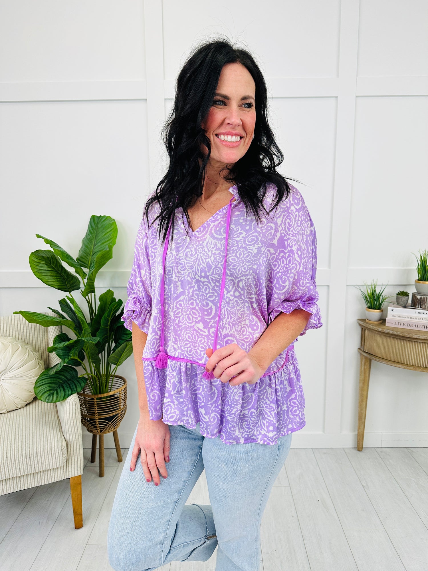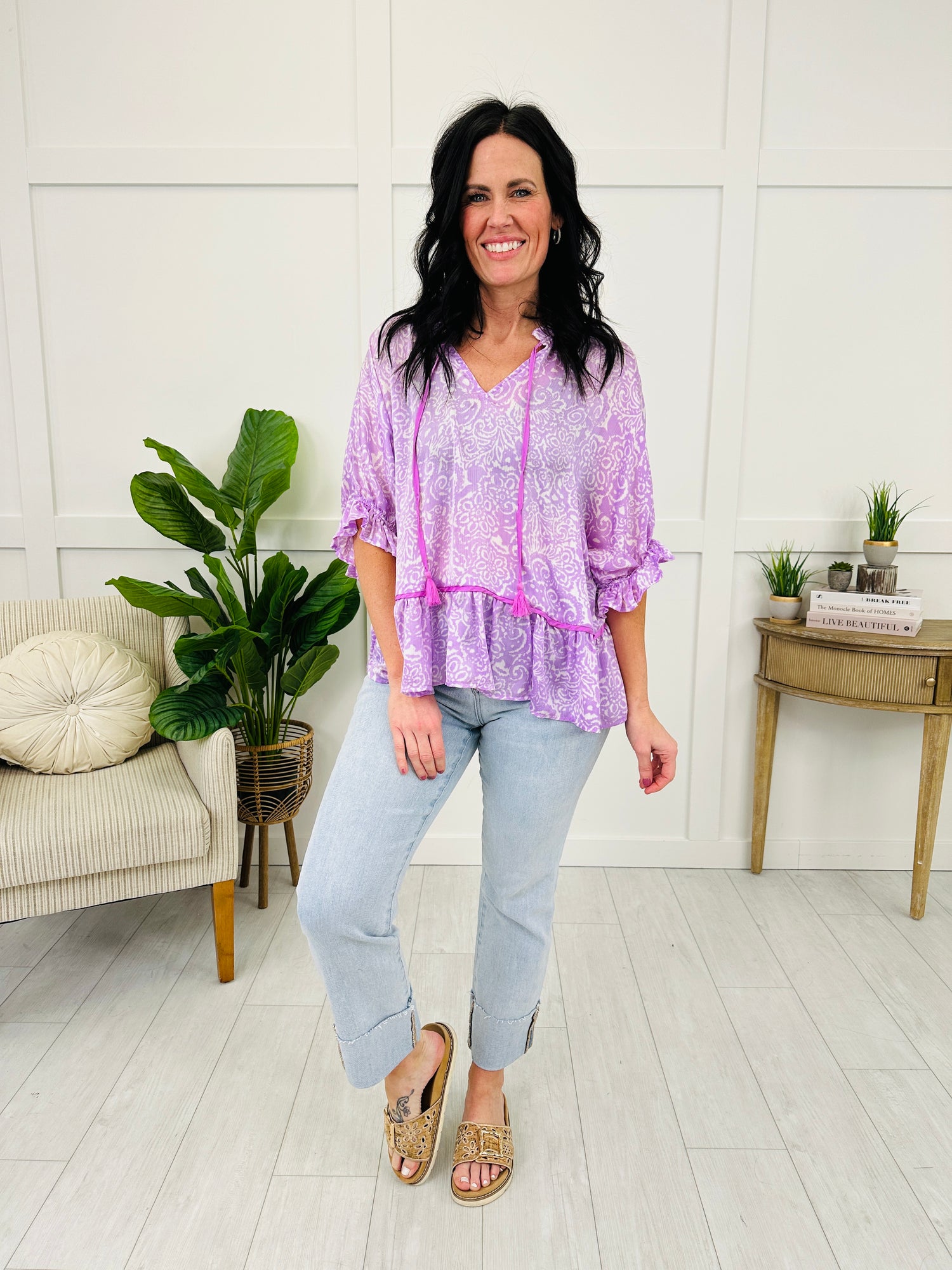 This top is pure easy-breezy charm with its tassel tie neckline, pretty contrast trim, and a softly tiered hem that moves with you. The ruffled sleeve cuffs add just the right amount of sweetness, while the allover print keeps the look polished and fun with denim.