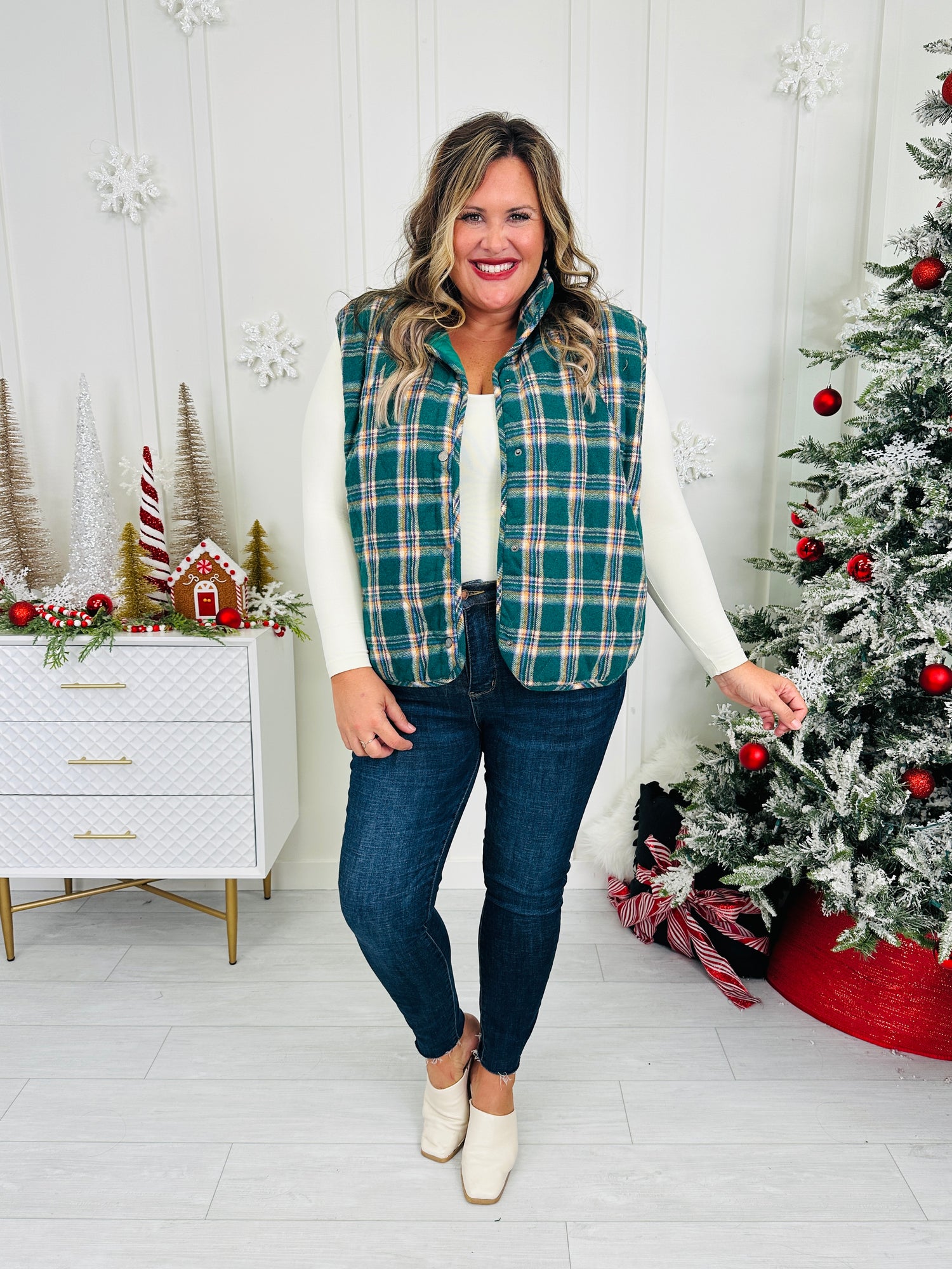 This plaid vest is the perfect blend of charm and comfort for the season! The classic green plaid pattern brings a timeless feel, while the snap button front makes it easy to style open or closed. Layer it over your favorite long sleeve tee or lightweight sweater for a look that’s effortlessly cozy and festive.