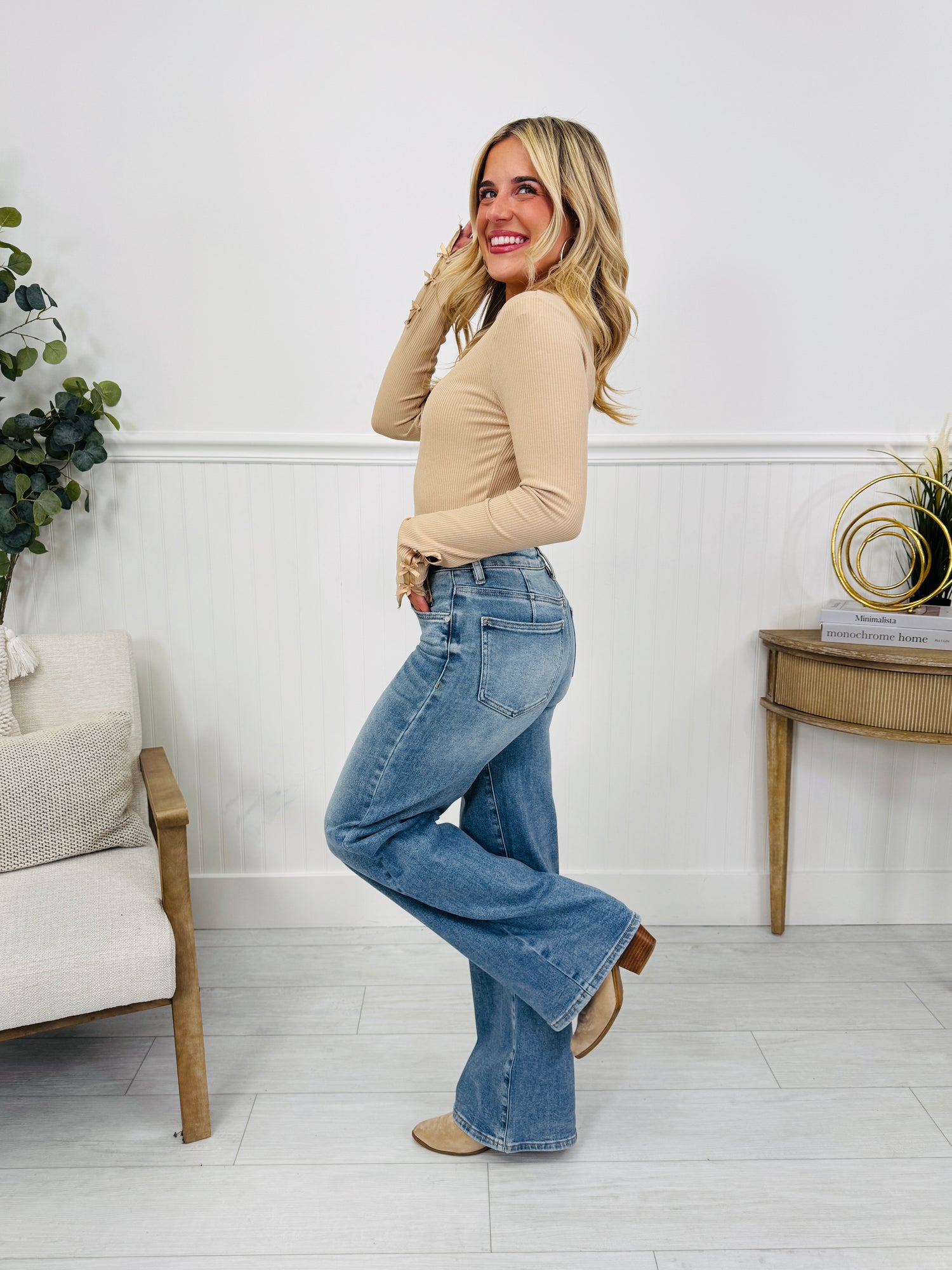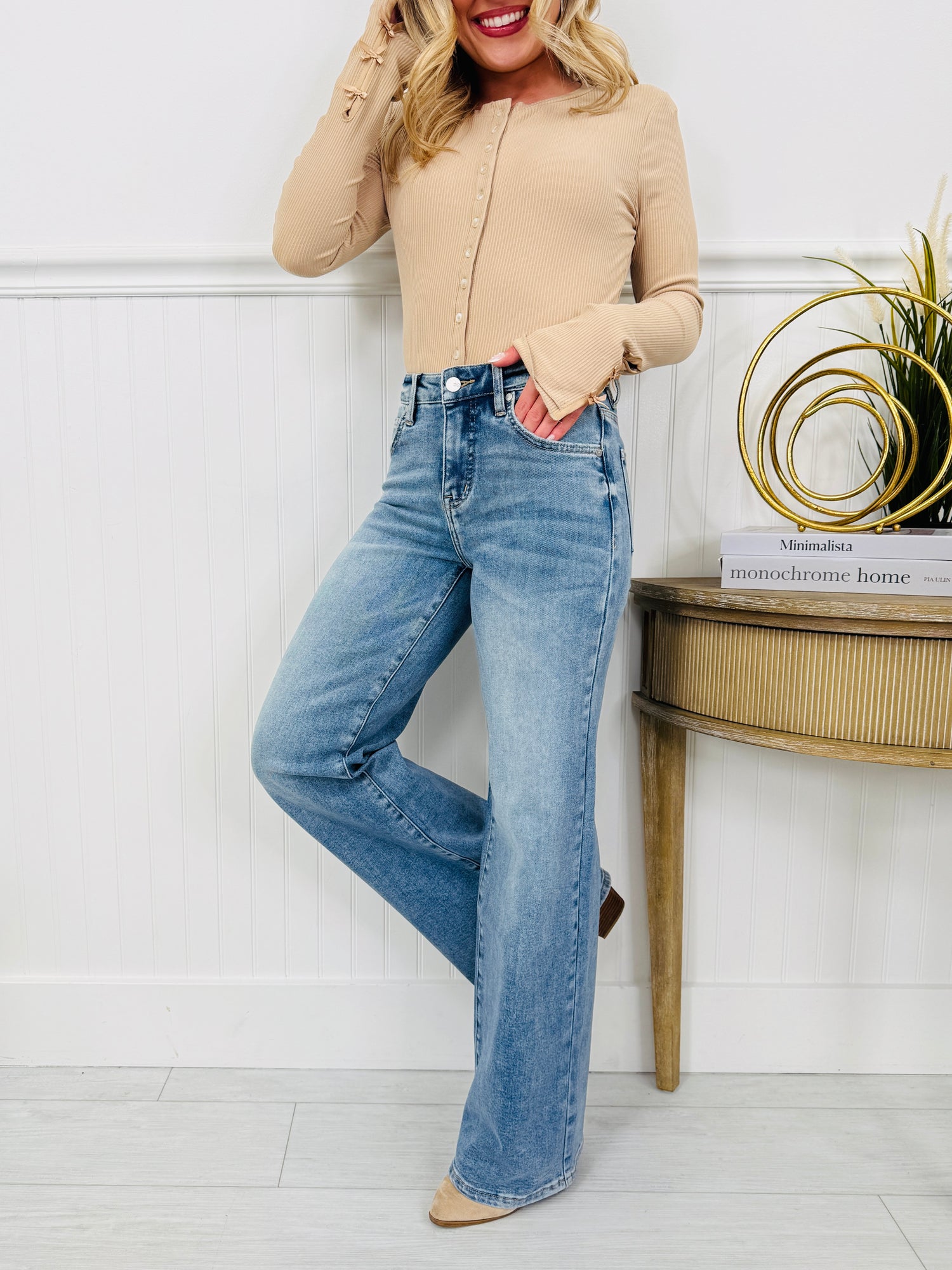 Finally! A pair of trendy and comfortable wide leg jeans available in four different inseam options, making them fit "just right!" These trendy wide leg jeans feature a high rise and tummy control panel that is going to suck you in and hold you in in all the right places without sacrificing stretch or comfort. These jeans also have butt lifting pockets for an extra boost on confidence! You will feel so good about yourself in these jeans!