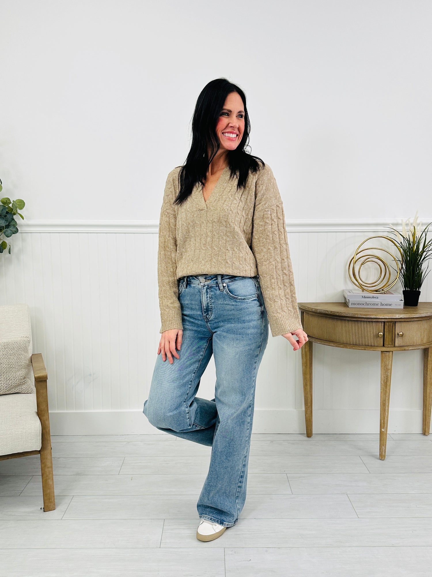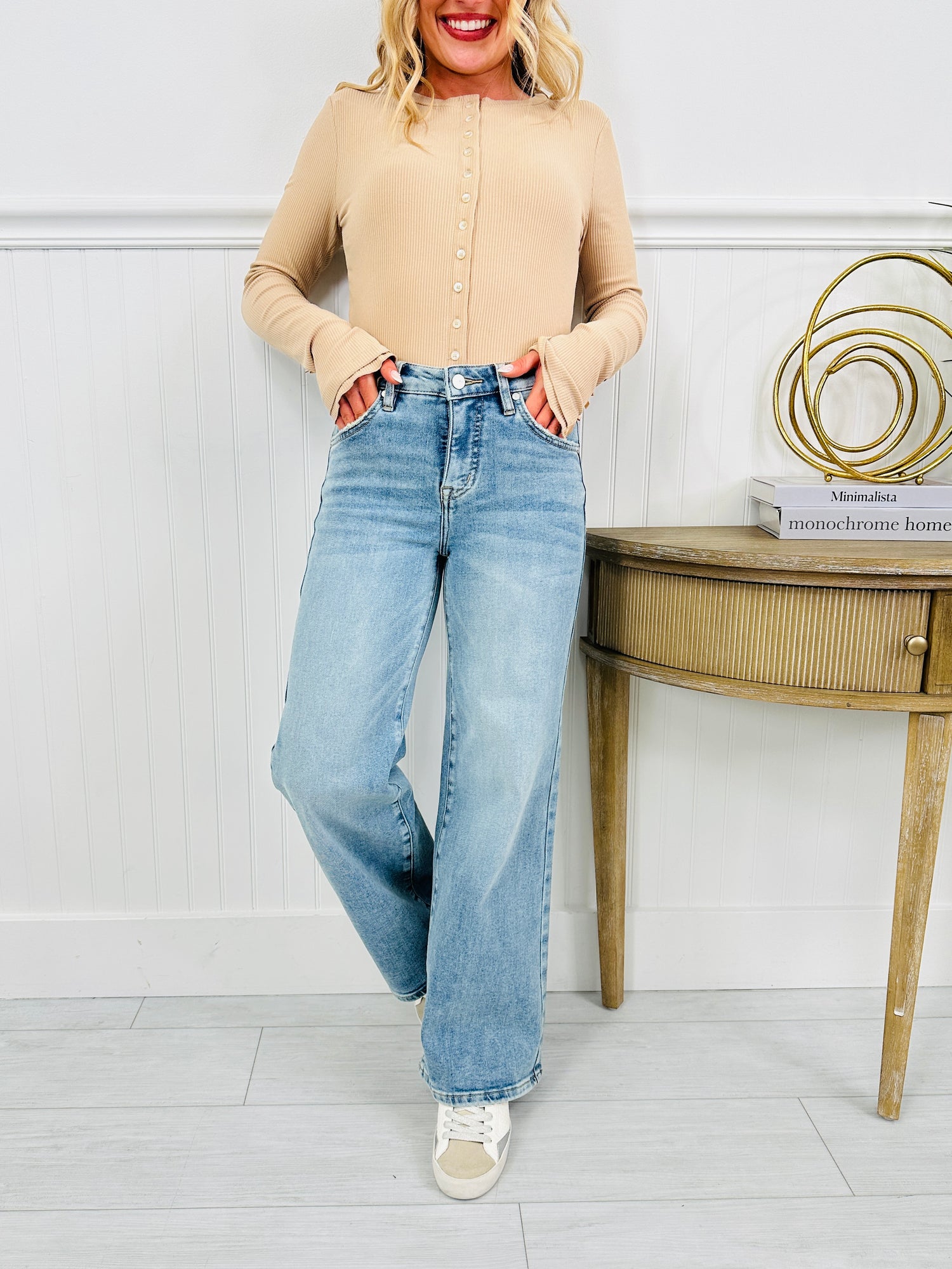 Finally! A pair of trendy and comfortable wide leg jeans available in four different inseam options, making them fit "just right!" These trendy wide leg jeans feature a high rise and tummy control panel that is going to suck you in and hold you in in all the right places without sacrificing stretch or comfort. These jeans also have butt lifting pockets for an extra boost on confidence! You will feel so good about yourself in these jeans!
