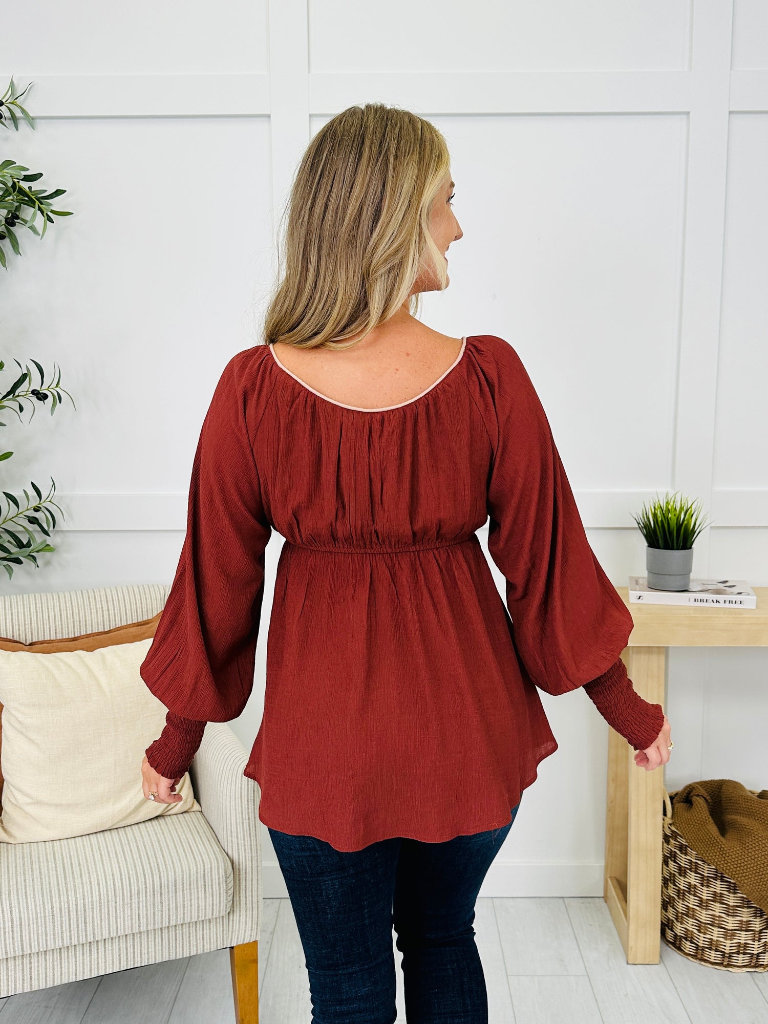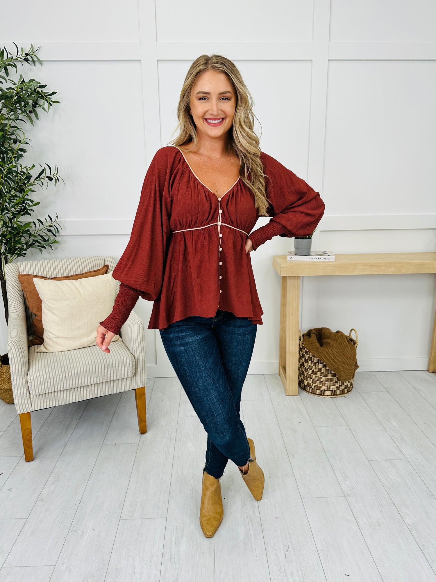 Romantic and effortlessly feminine, this top brings all the sweet details you didn’t know you needed. The fabric-covered buttons and dainty trim add a touch of vintage charm, while the smocked sleeves and flared shape keep it comfy and flattering. Whether you dress it up with denim or keep it casual, this piece makes styling feel easy and pretty.
