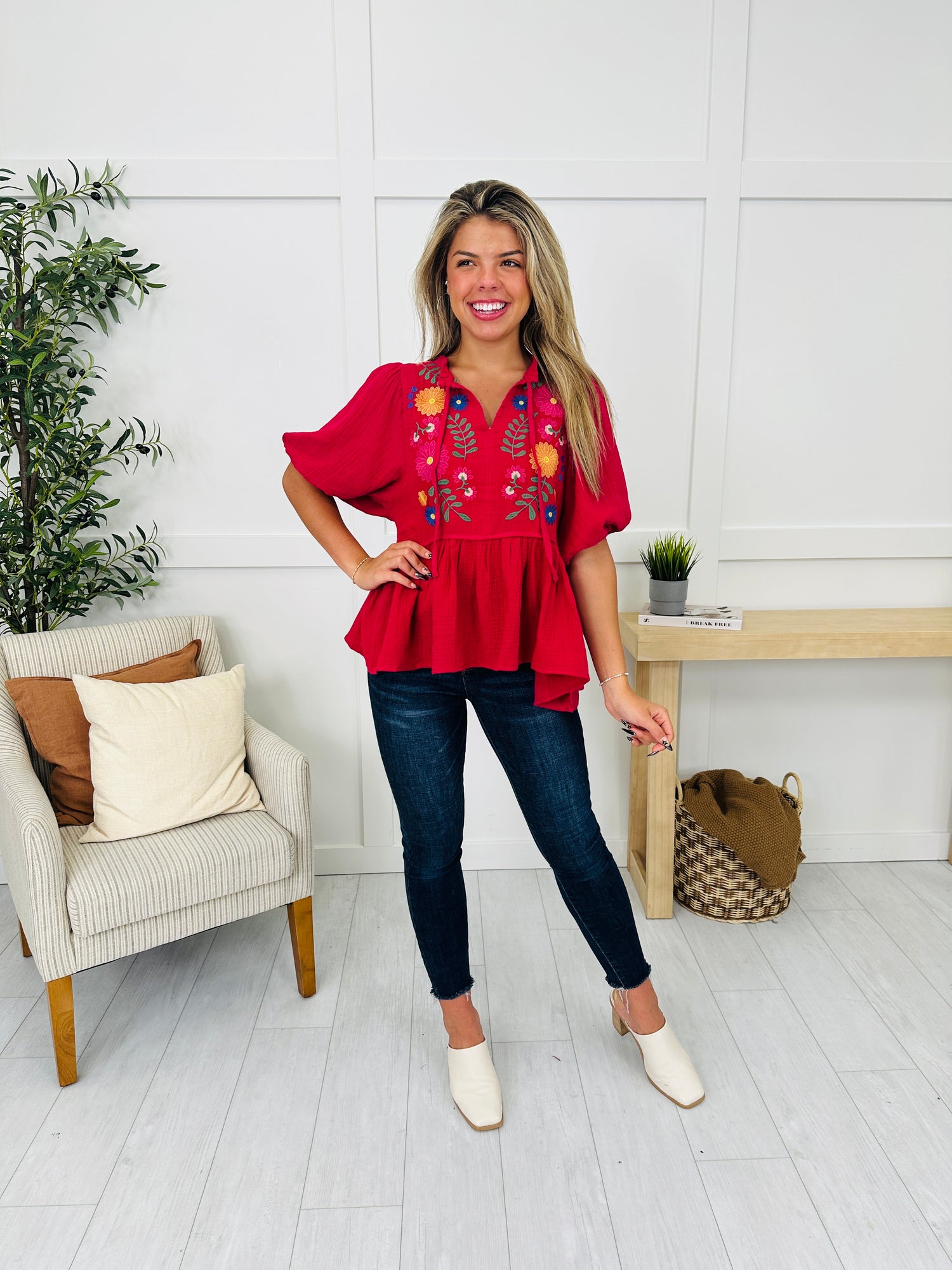 This darling top is bursting with charm from every angle! The bright floral embroidery pops beautifully against the bold base, while the crinkled gauze texture adds breezy softness. Finished with adorable puff sleeves and a flattering tiered fit, this beauty is ready to brighten up your closet in the most cheerful way.