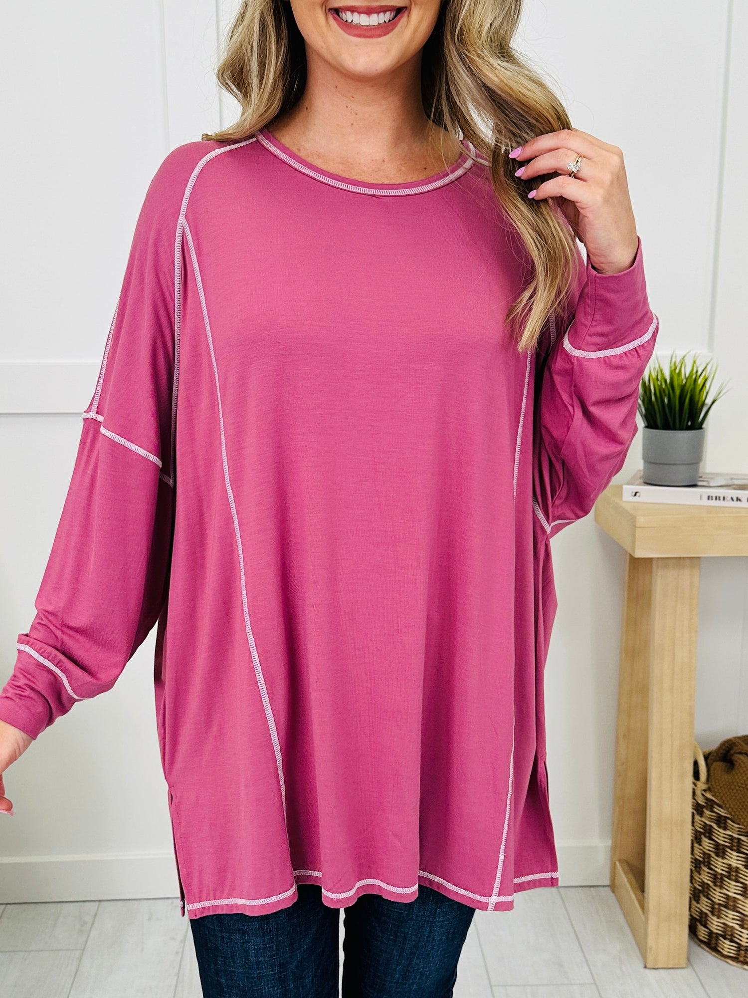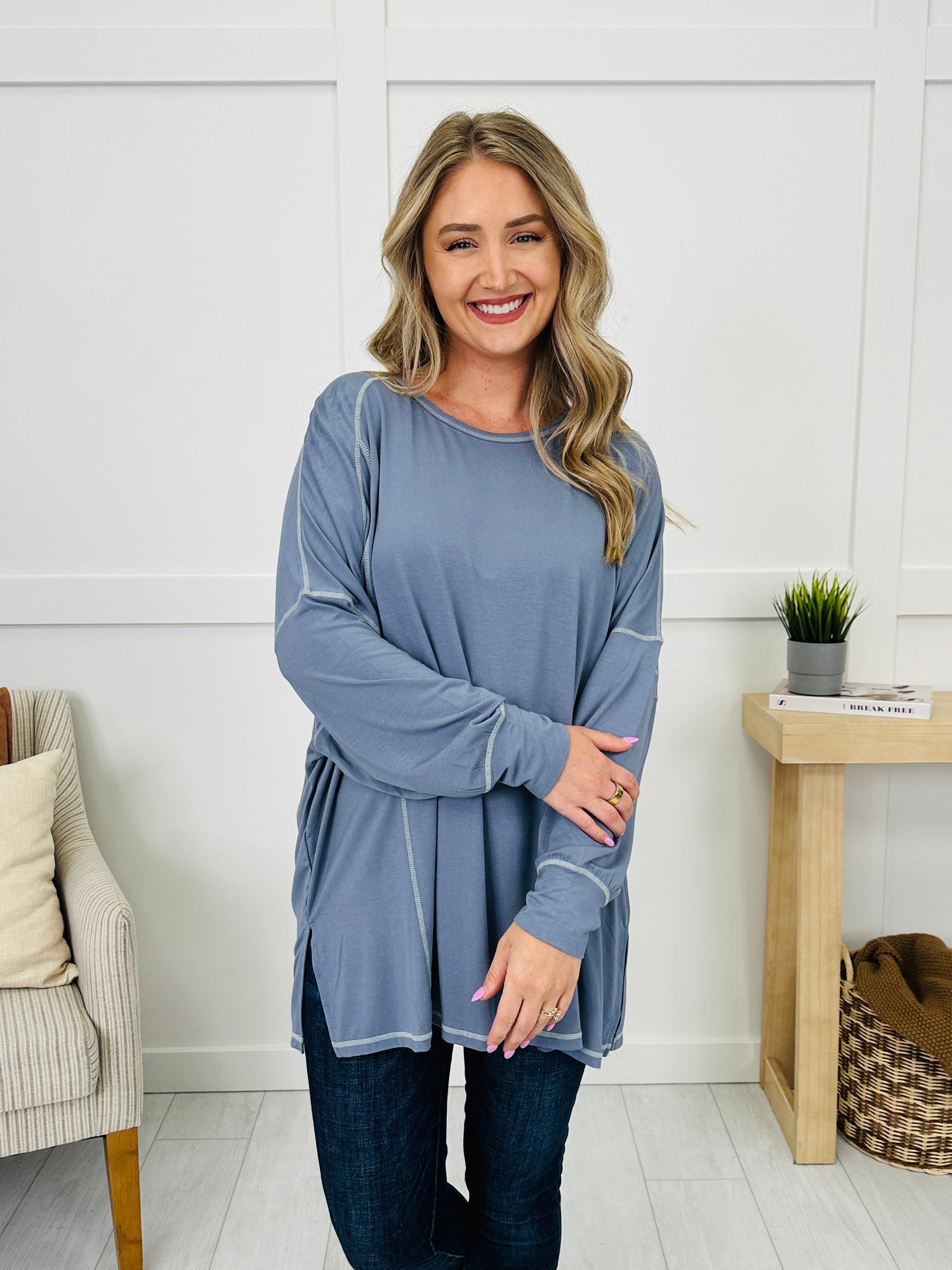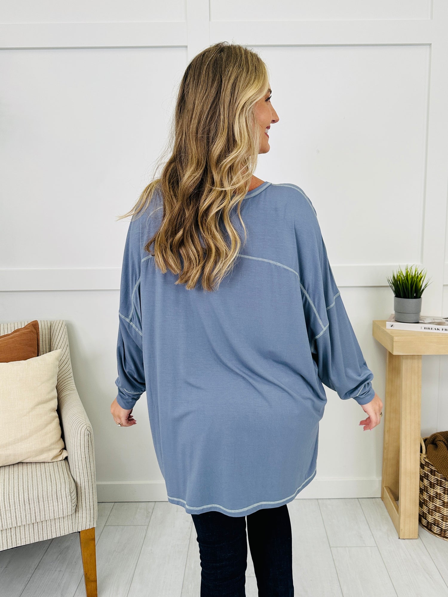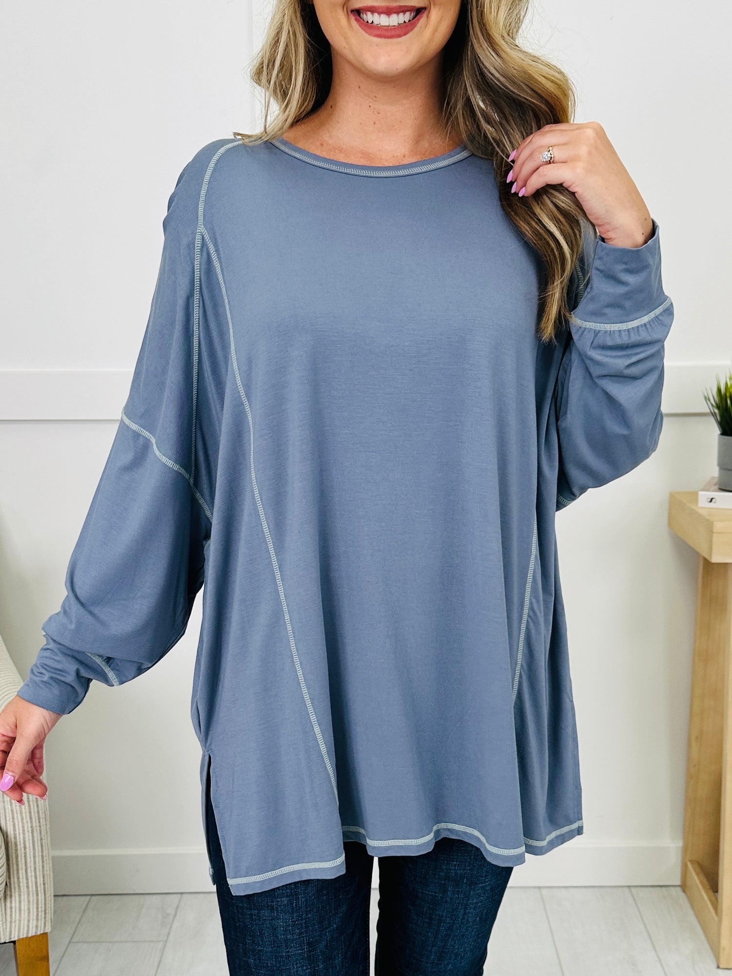 Laid-back style meets everyday comfort in this effortlessly cool top. The exposed seam detailing adds a casual, lived-in vibe, while the oversized fit drapes beautifully for a relaxed look. Finished with lantern sleeves, side slits, and a classic rounded neckline, it’s an easy choice for pairing with leggings, jeans, or shorts for year-round wear.