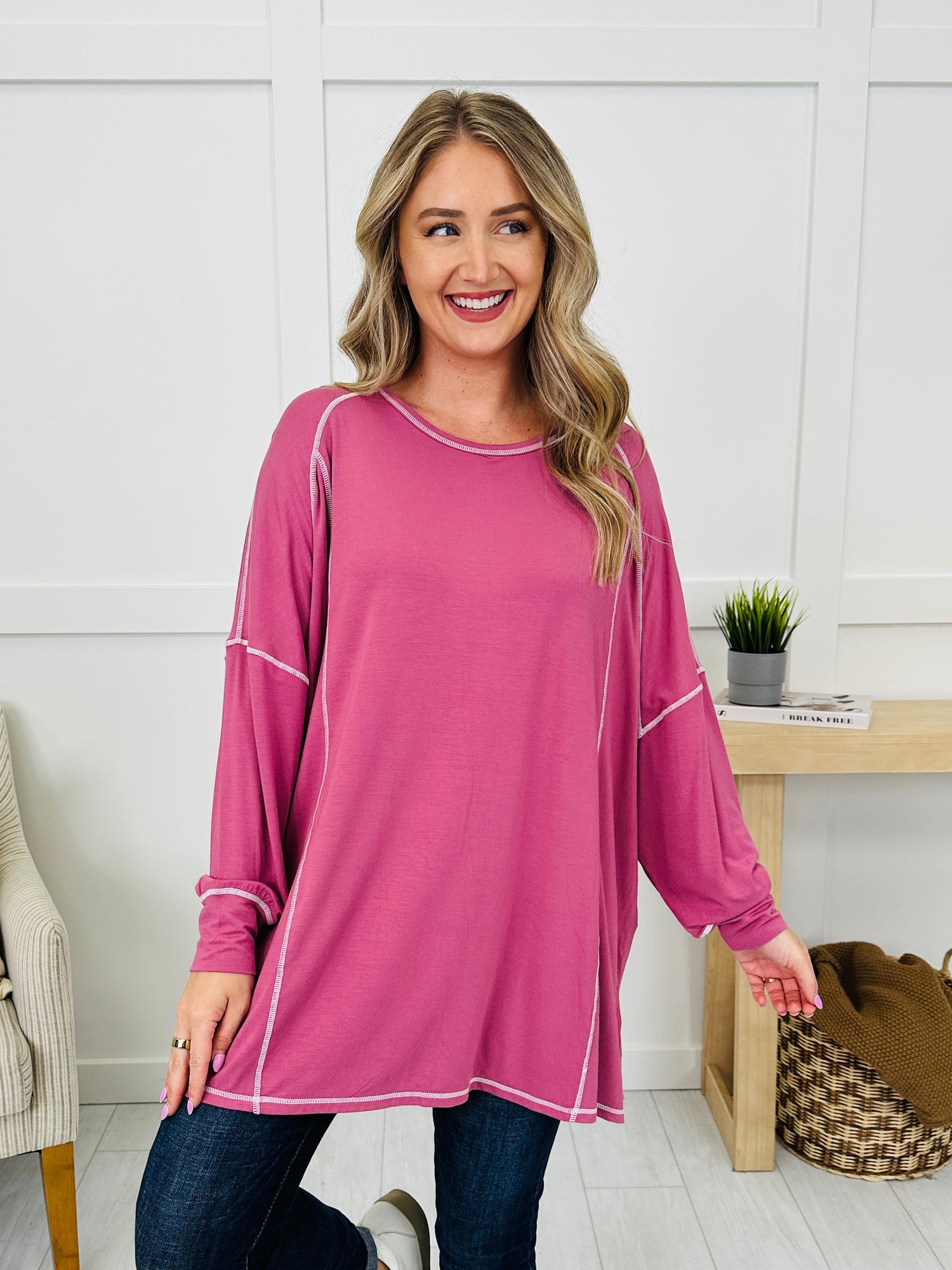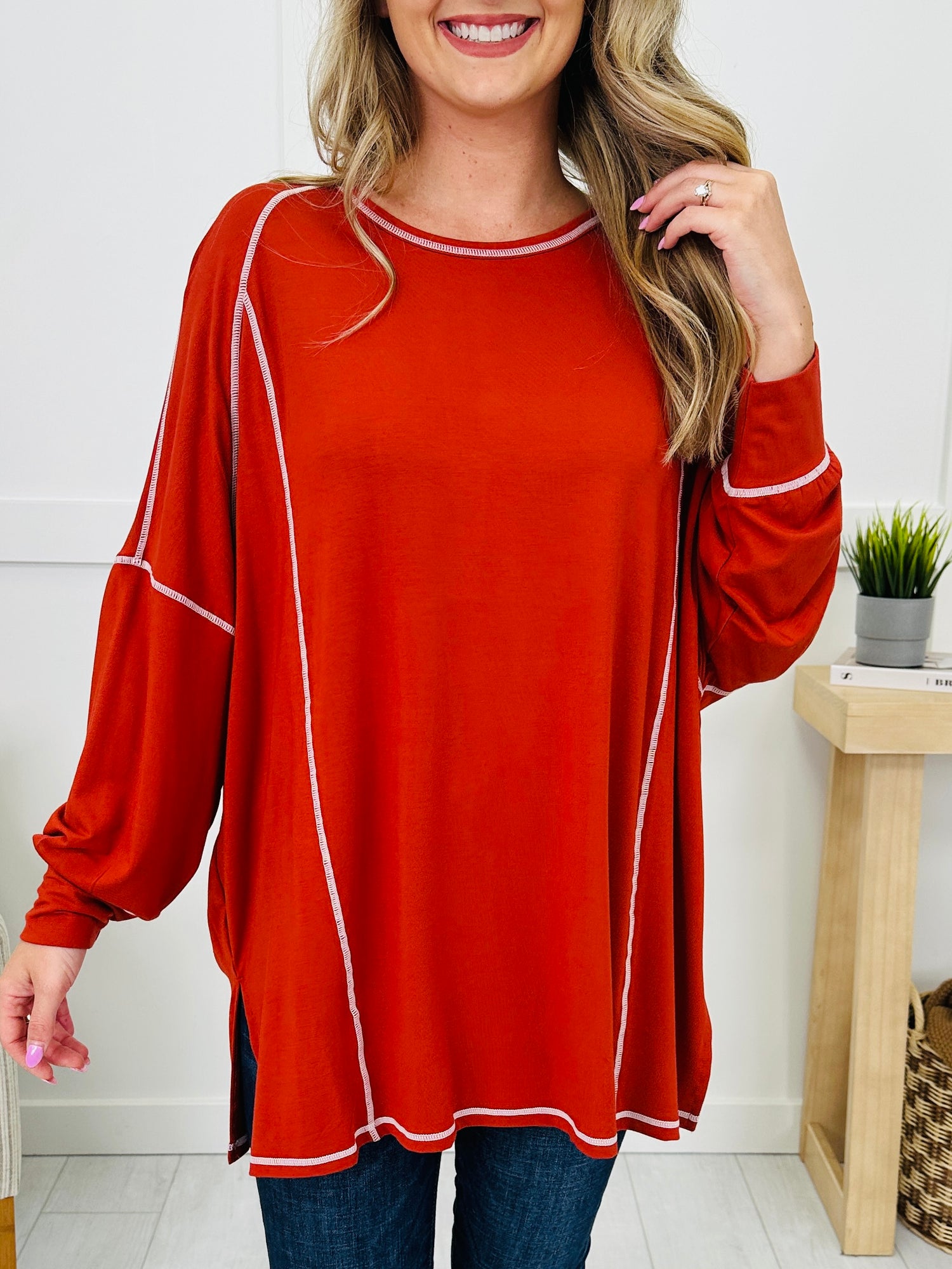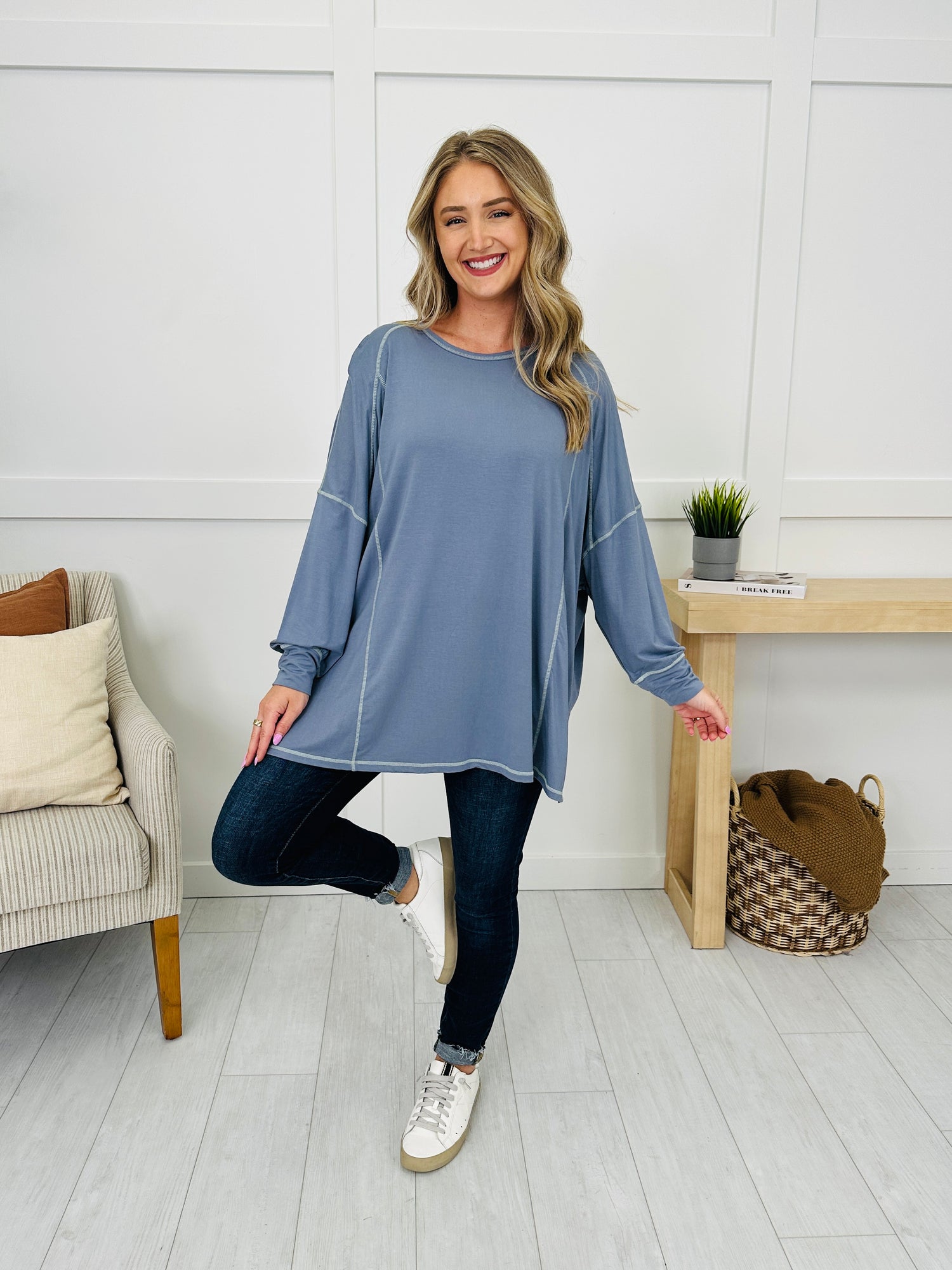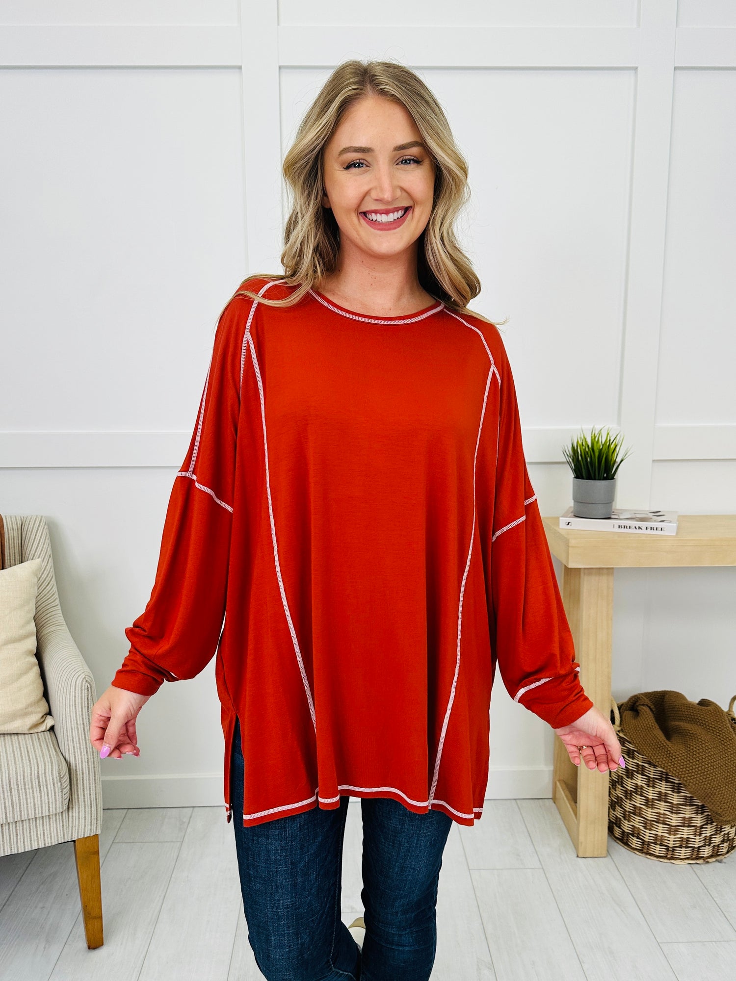 Laid-back style meets everyday comfort in this effortlessly cool top. The exposed seam detailing adds a casual, lived-in vibe, while the oversized fit drapes beautifully for a relaxed look. Finished with lantern sleeves, side slits, and a classic rounded neckline, it’s an easy choice for pairing with leggings, jeans, or shorts for year-round wear.