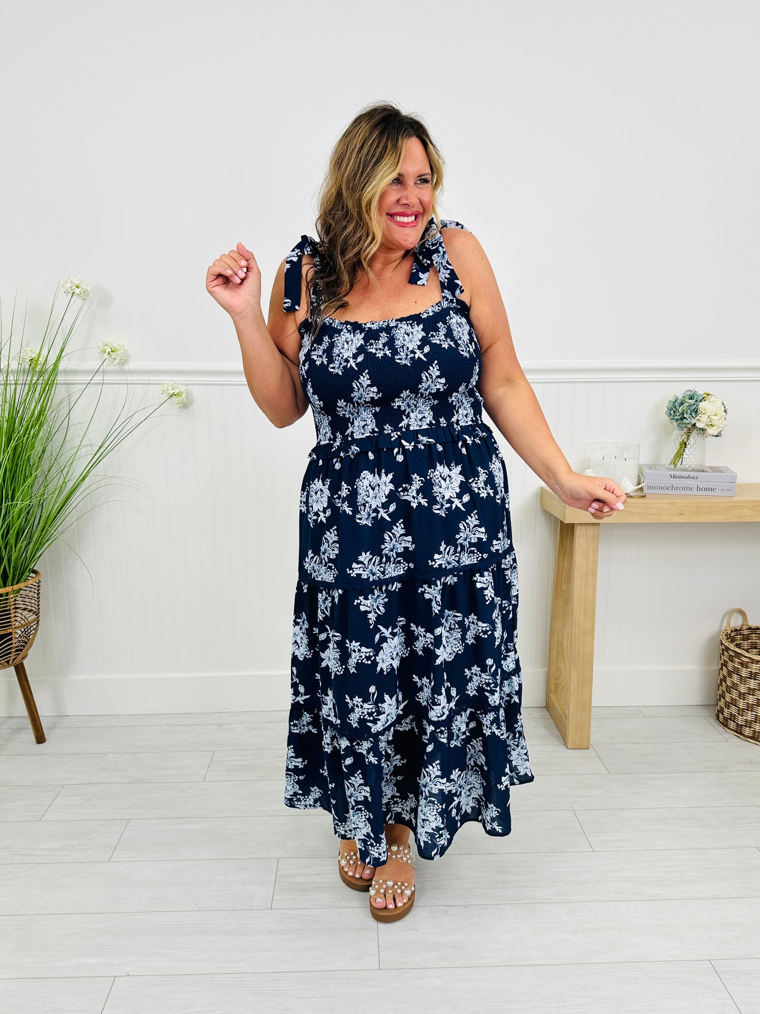 It's officially dress season and this new arrival is effortlessly feminine and endlessly charming. Featuring a timeless navy backdrop adorned with white florals, this dreamy maxi brings a classic look with a modern, flattering fit that's perfect for the warm days ahead.