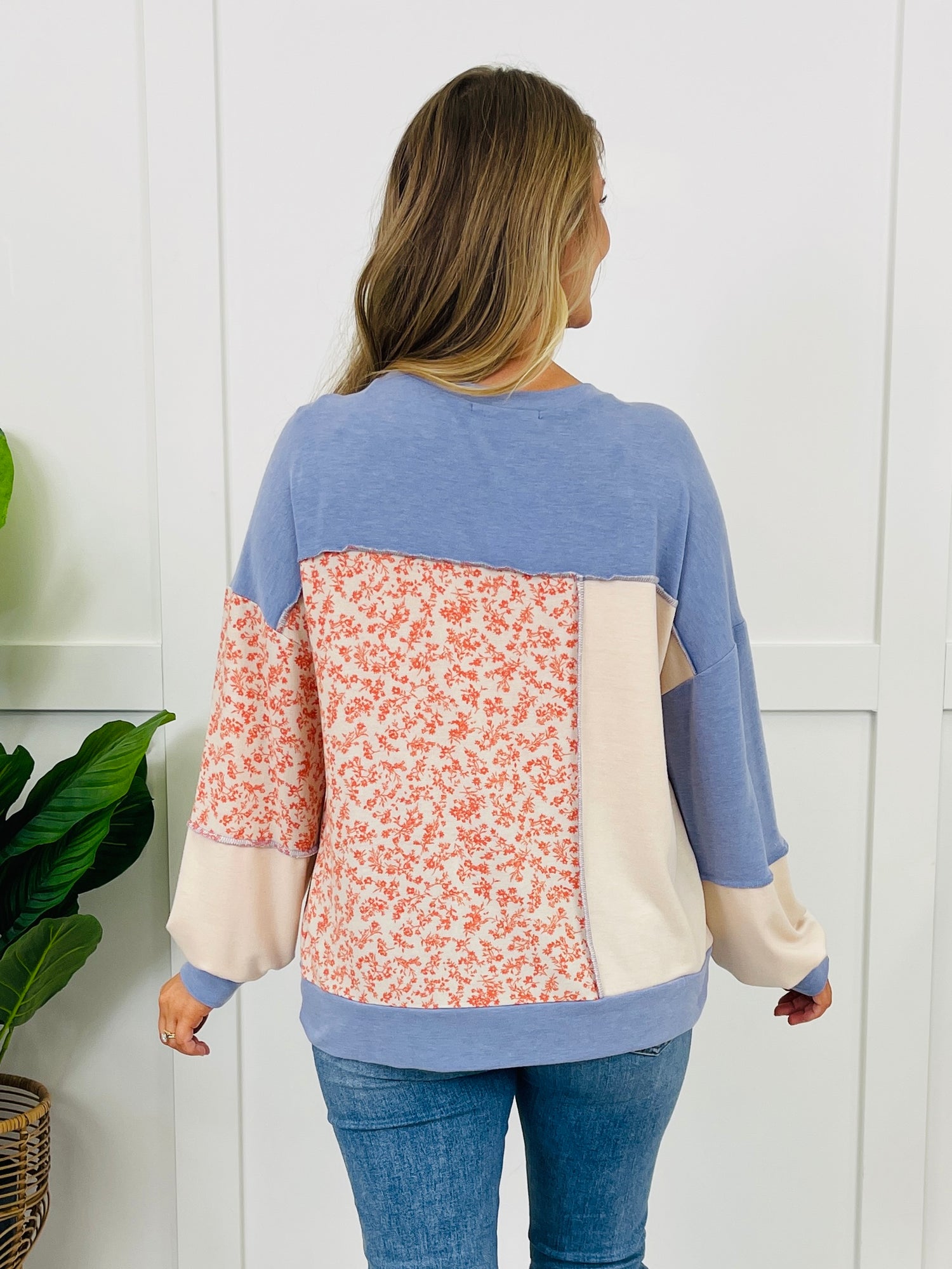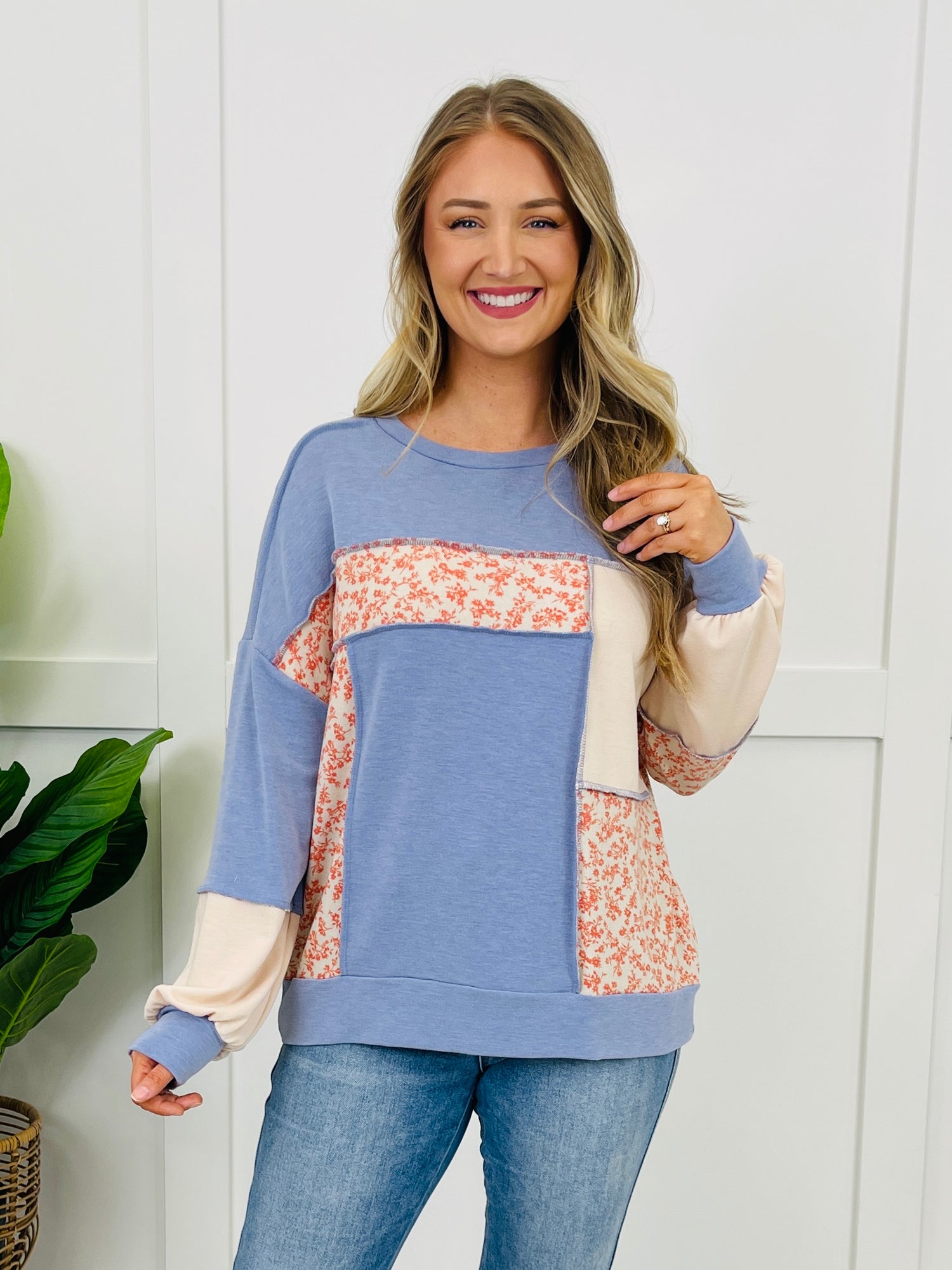 This top is such an easy grab-and-go piece, but the patchwork colorblock design makes it feel extra special. The pop of floral across the front and sleeves adds the prettiest touch, and those exposed seam finishes give it that cool, lived-in look without being too much. Finished with a comfy crew neckline, relaxed shape, and banded hem, it’s the kind of throw-on-and-feel-cute top you’ll wear on repeat.