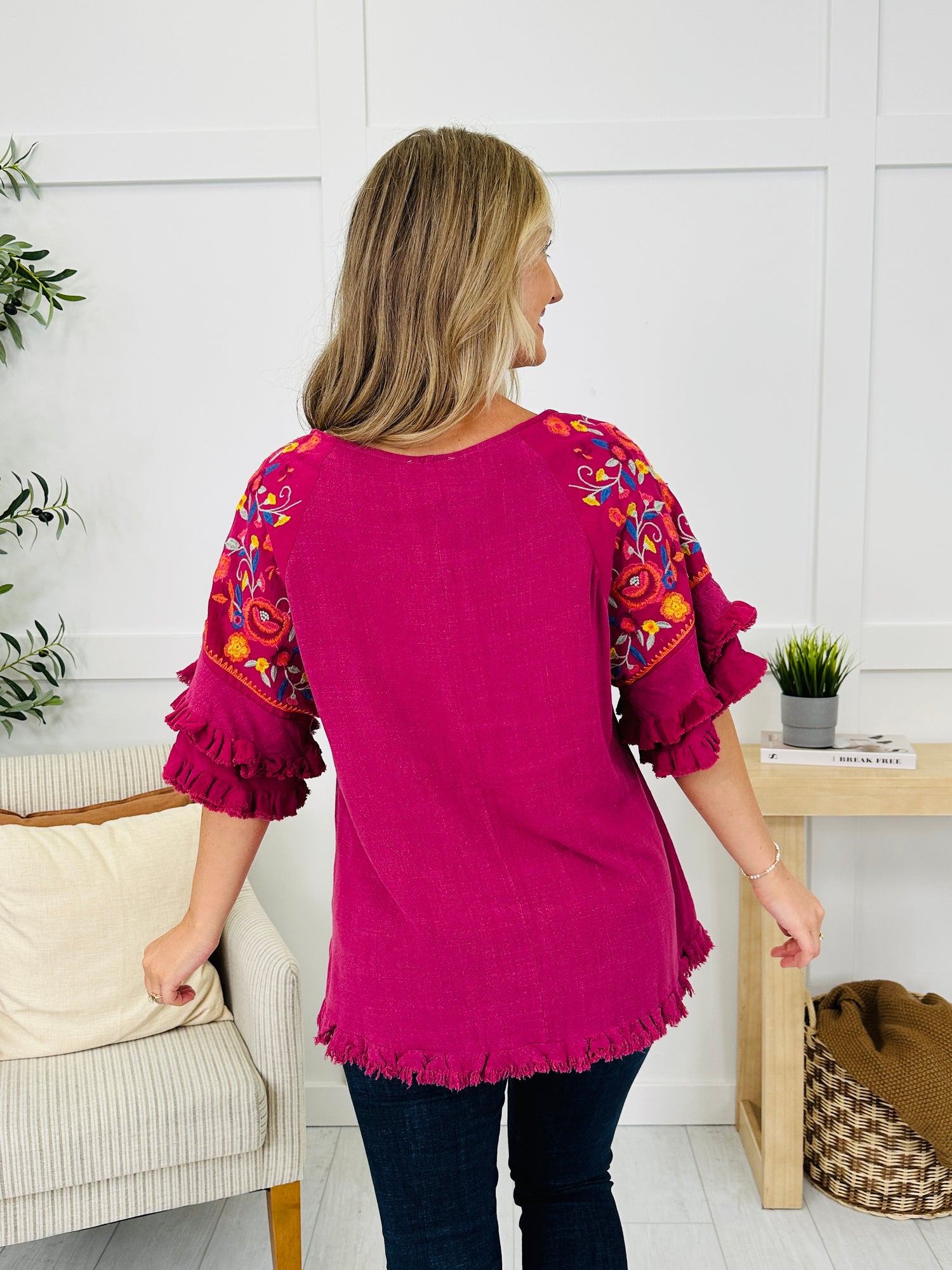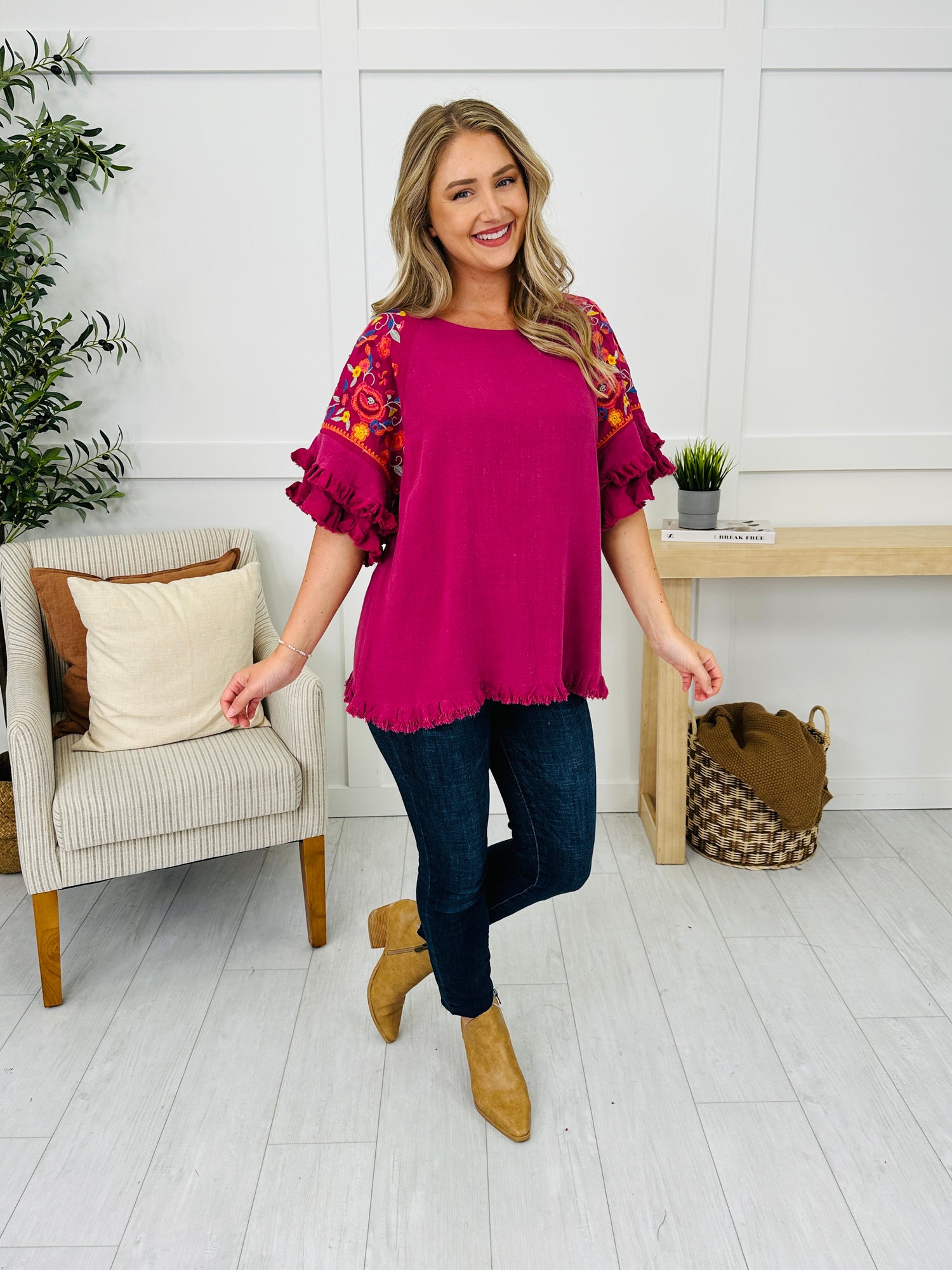 This eye-catching top brings all the playful charm with bold floral embroidery and statement-making ruffle details along the sleeves and hem. The relaxed fit and lightweight fabric make it just as comfy as it is colorful. Finished with a fringed hem for extra flair, this piece is ready to brighten up any day!