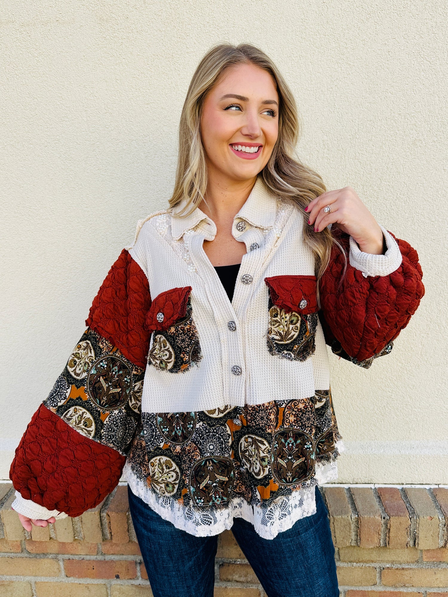 This statement jacket features a striking patchwork design that blends warm colors with intricate patterns, creating a unique and eye-catching look. The textured puff sleeves and button-up front offer both comfort and style. With its bold detailing, this jacket is perfect for adding a stylish twist to your fall wardrobe.