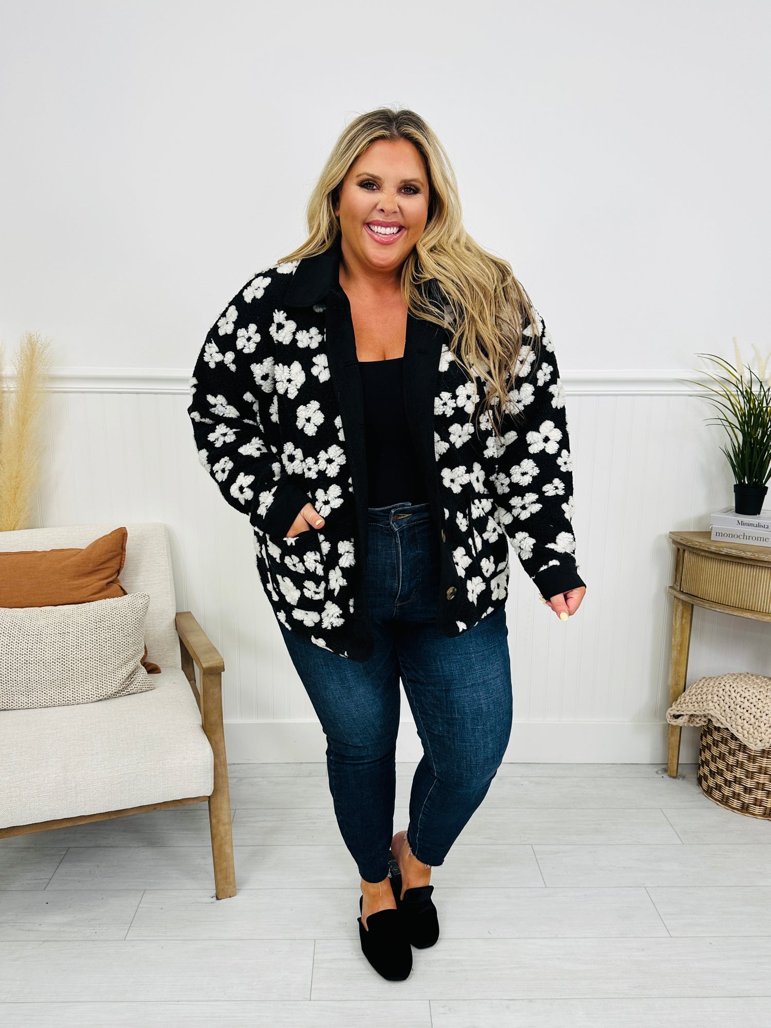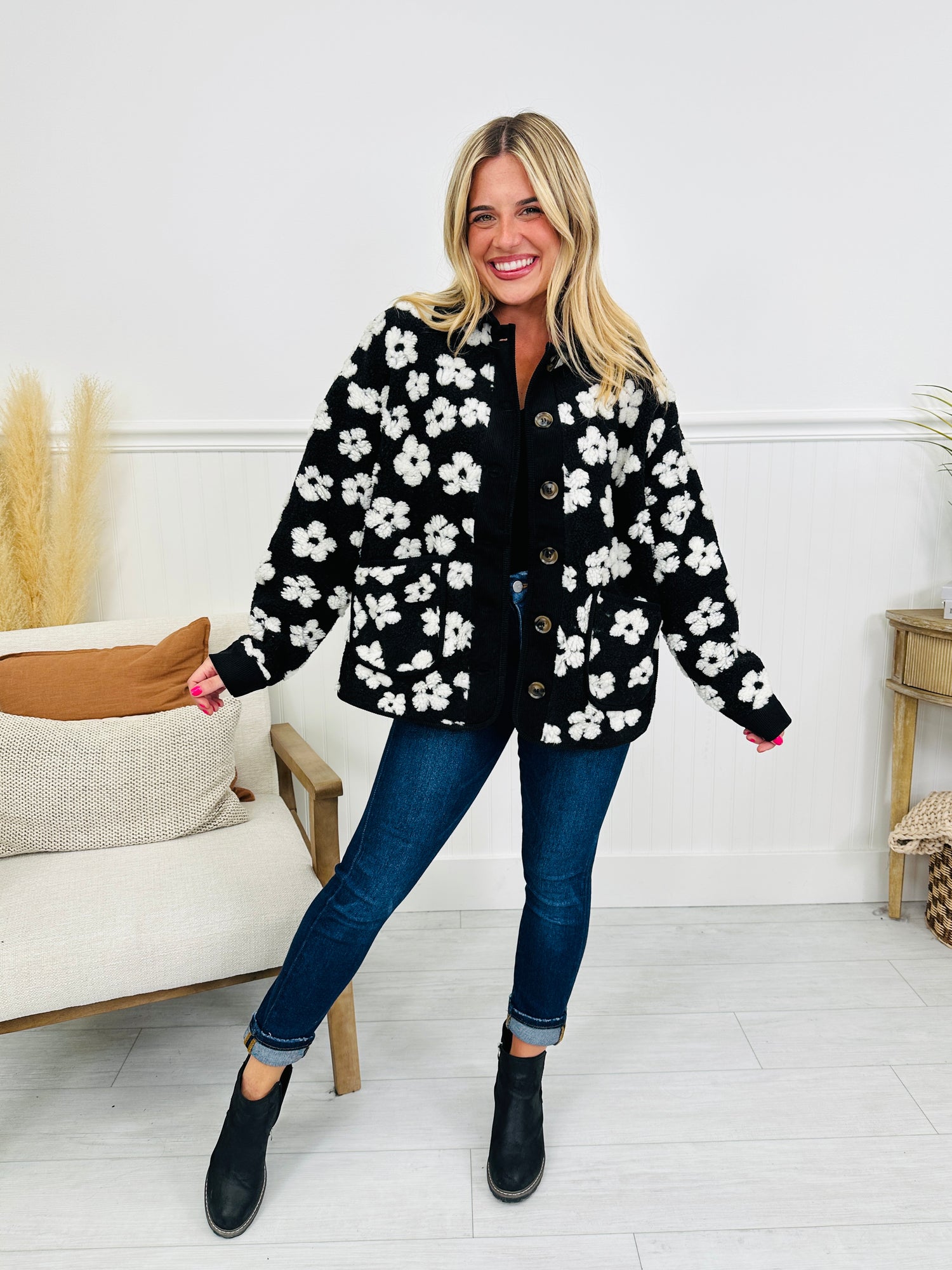 Embrace crisp, chilly days in style with the Frost Florals Fleece Jacket. Made from ultra-soft fleece, this jacket wraps you in warmth while keeping your look effortlessly chic. The textured bold floral design pops against the cozy black background, giving it the perfect mix of cozy comfort and standout style.