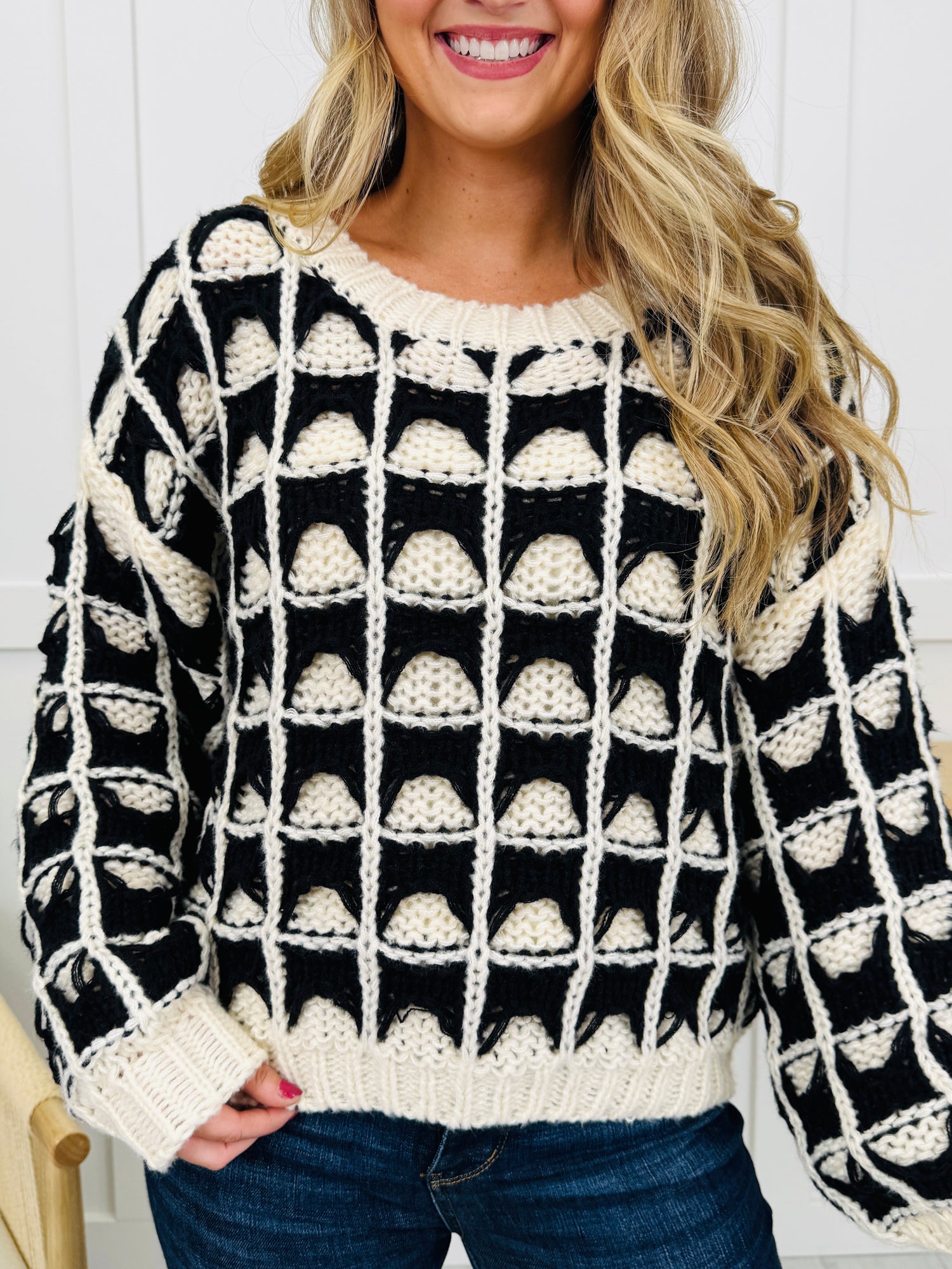 This cozy sweater showcases a bold grid pattern with a combination of classic black and cream tones, giving it a stylish and eye-catching look. The relaxed fit and wide banded cuffs offer comfort and a laid-back vibe, making it an ideal piece to pair with your favorite jeans or leggings. Perfect for everyday occasions, this sweater brings warmth and charm to any wardrobe.