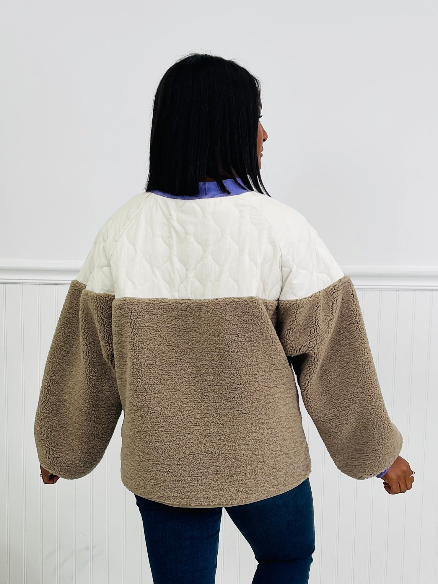 This soft and stylish pullover pairs a quilted upper detail with a cozy, plush texture through the body and sleeves for the perfect mix of comfort and personality. The two-tone design stands out beautifully, while the relaxed silhouette keeps it easy to wear and effortlessly comfy. Finished with contrasting cuffs and a simple hemline, it’s a go-to layer for chilly days when you want something warm with a little extra charm.