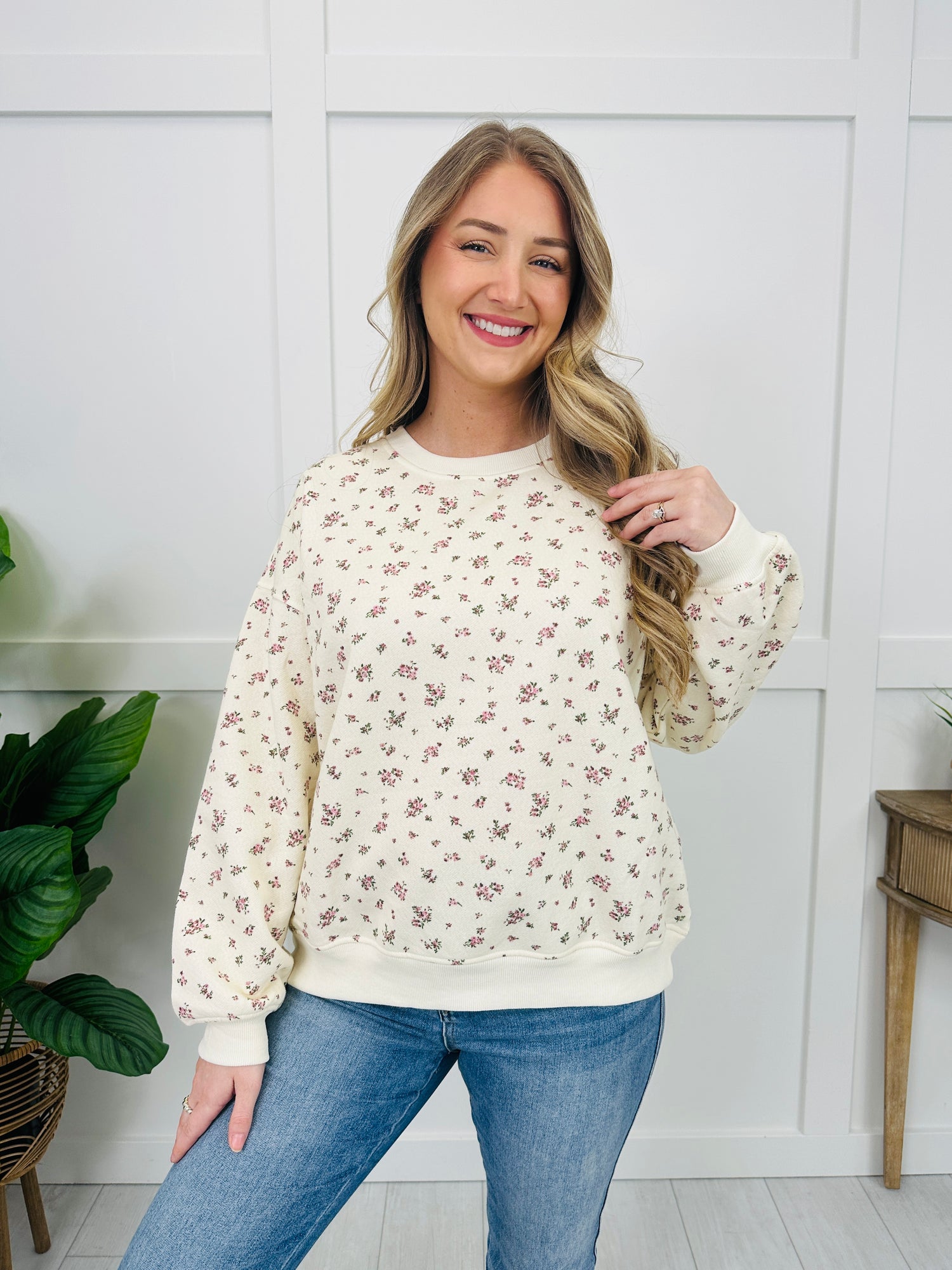 Sweet and simple with the prettiest little details, this floral sweatshirt is one you’ll reach for on repeat. The allover dainty print gives it that soft, feminine feel, while the classic crew neckline and banded trim keep it timeless and easy to style. Designed in a relaxed, comfy fit, it pairs perfectly with your favorite denim for an effortless everyday look that still feels put together. Cozy, charming, and just the right amount of girly.