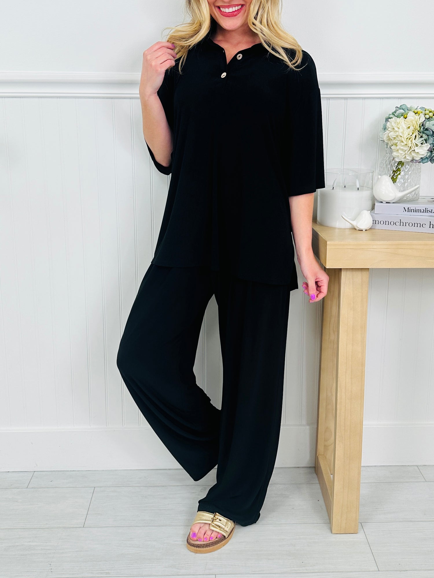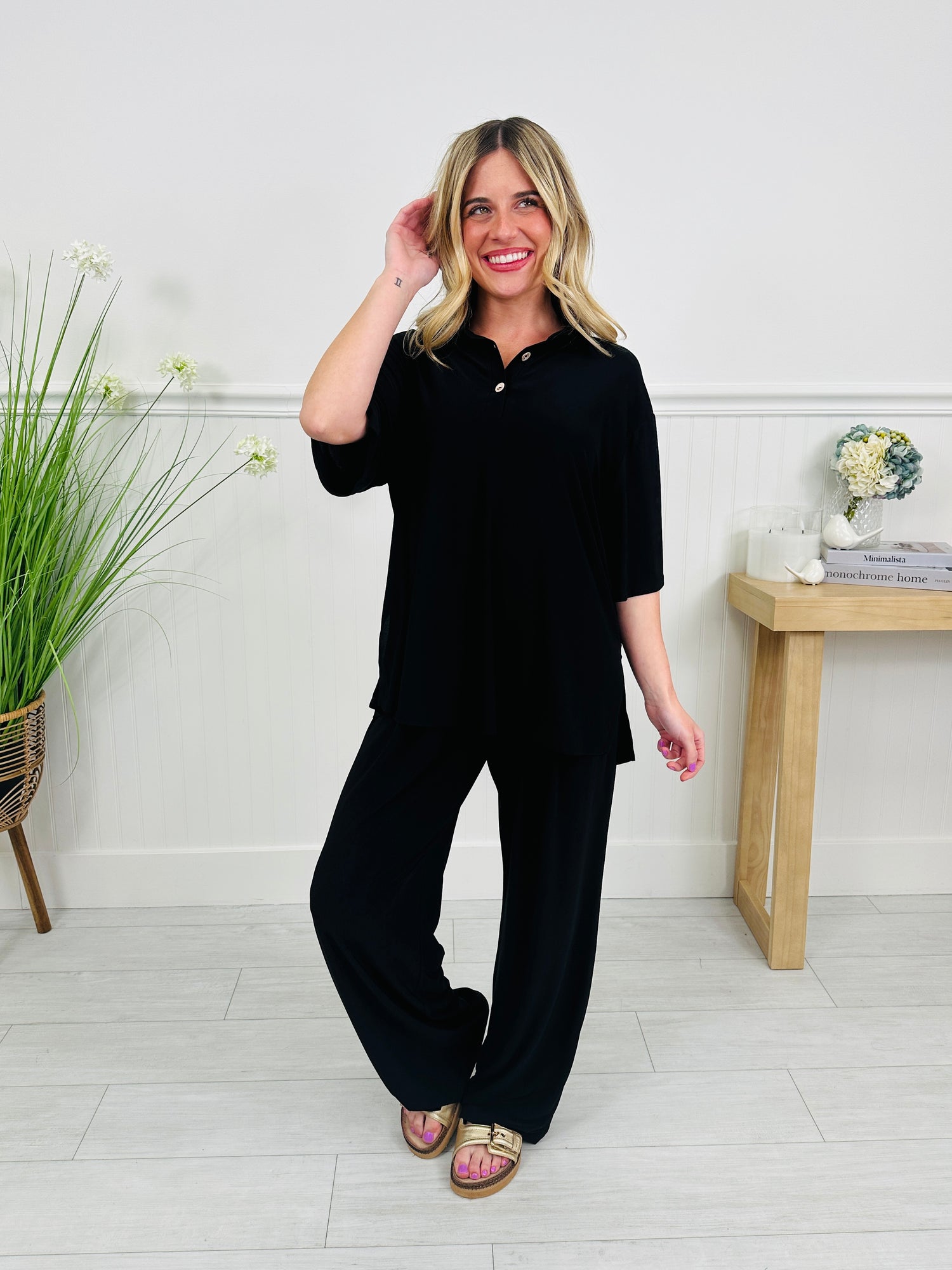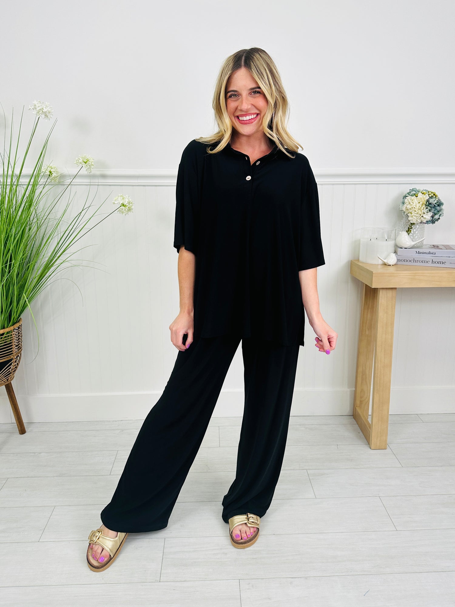 Designed in a wrinkle-free, cool-to-the-touch fabric, this set keeps you looking put together without the fuss. The relaxed fit drapes beautifully without clinging, giving you that easy, confident feel from morning to night.