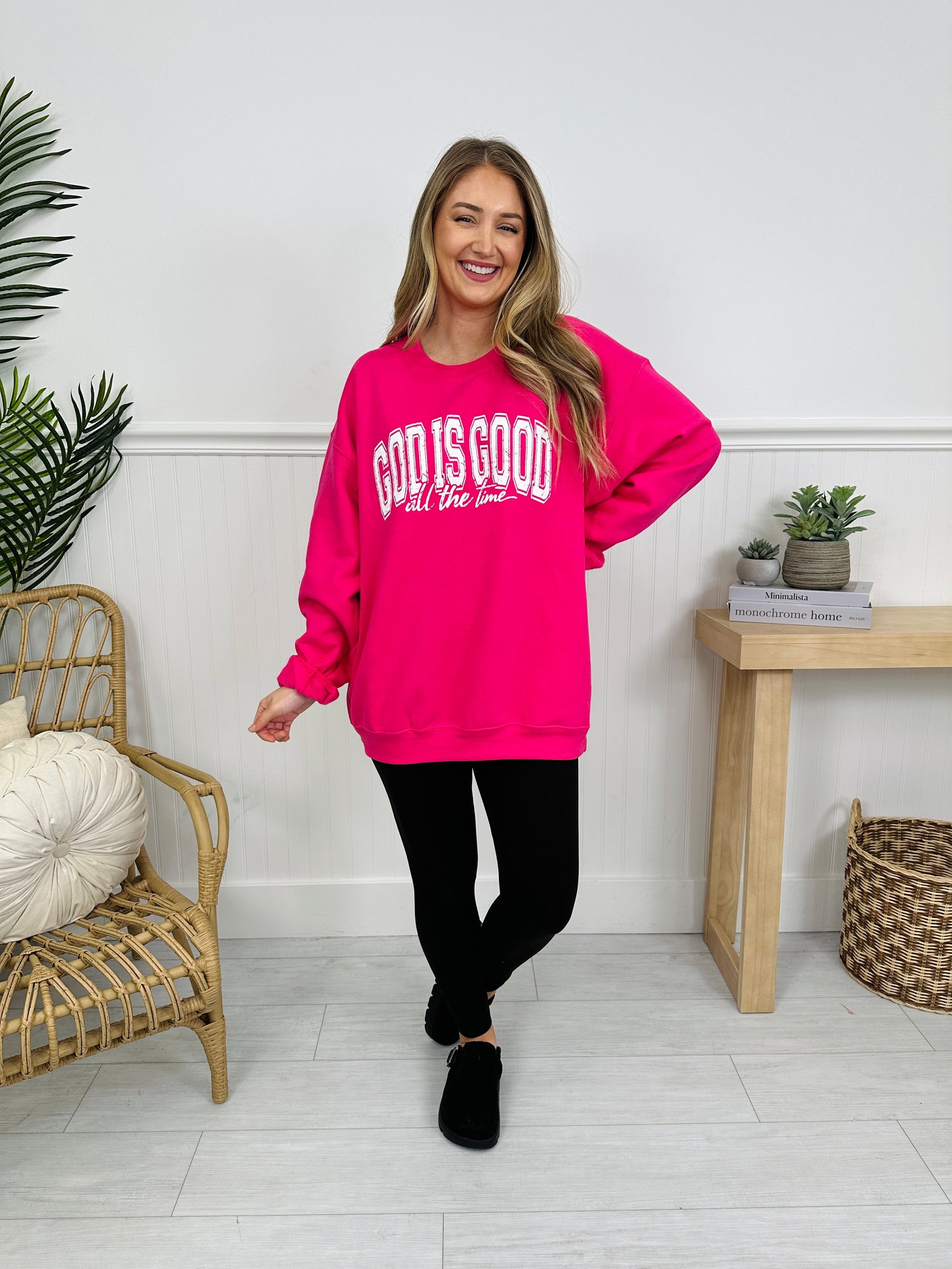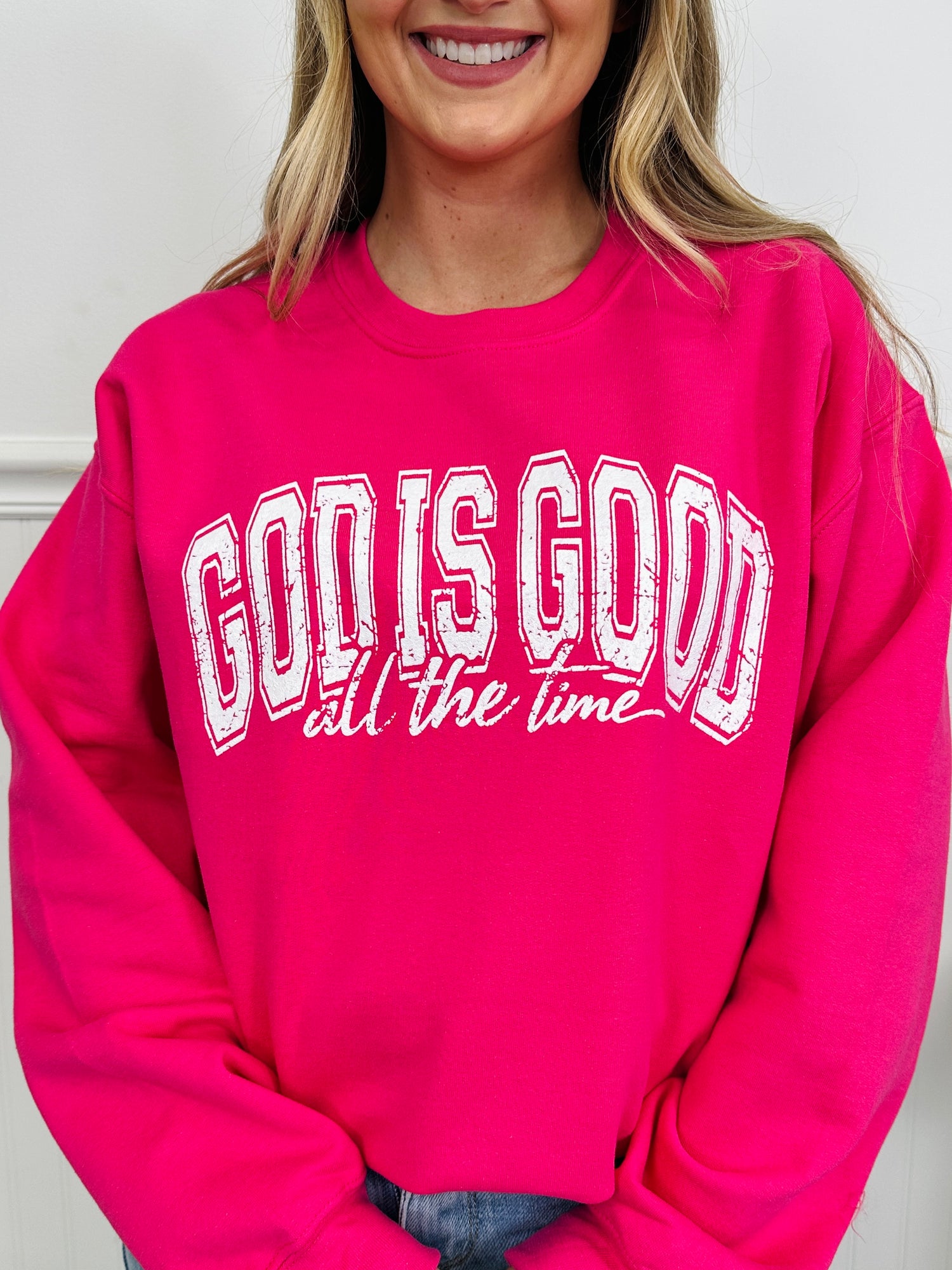 Start your day wrapped in faith and encouragement with the God Is Good sweatshirt — a bold yet comforting reminder that never goes out of season. The collegiate-style lettering paired with the softer script detail creates a timeless look that feels both uplifting and effortlessly cool.