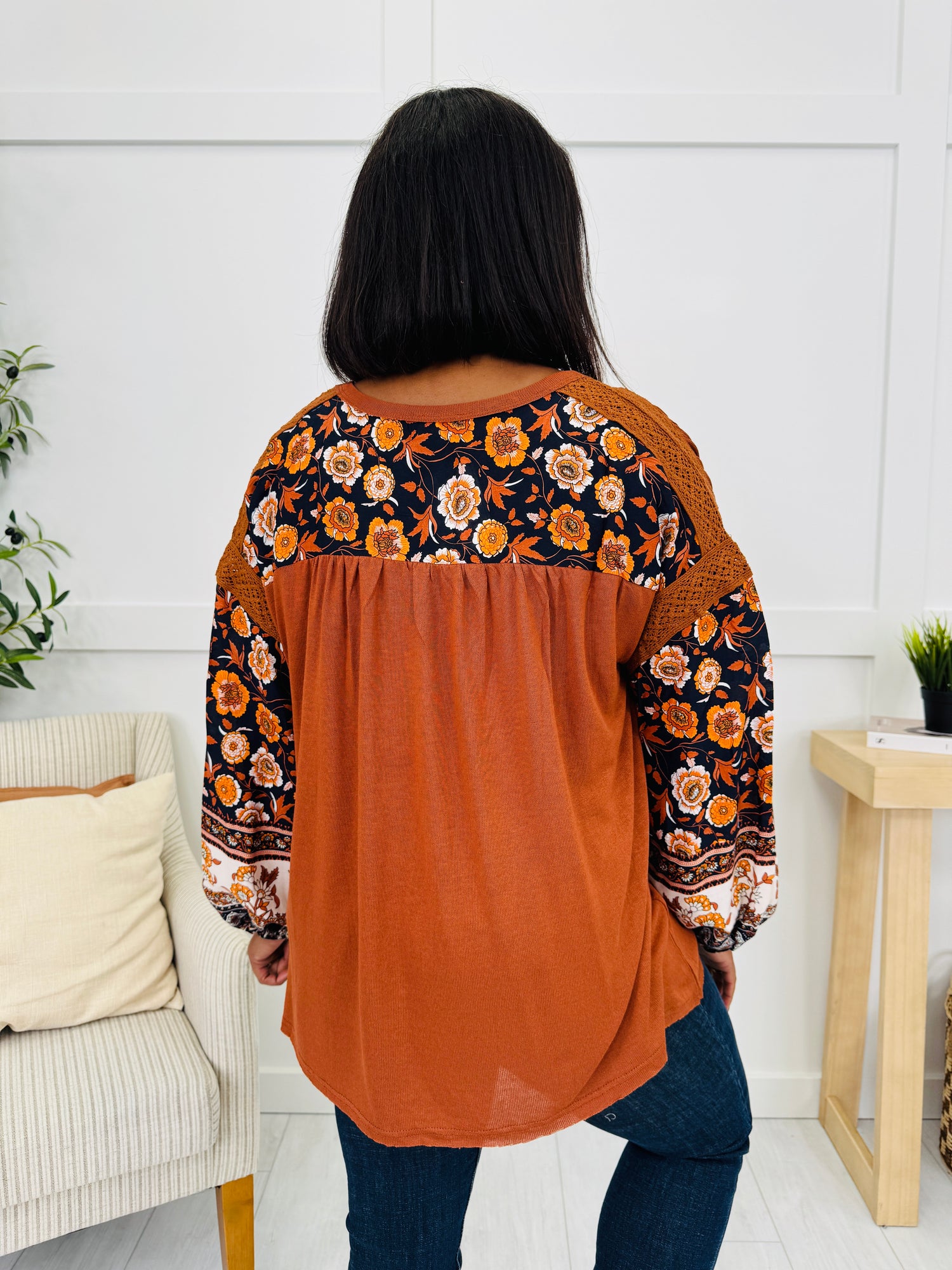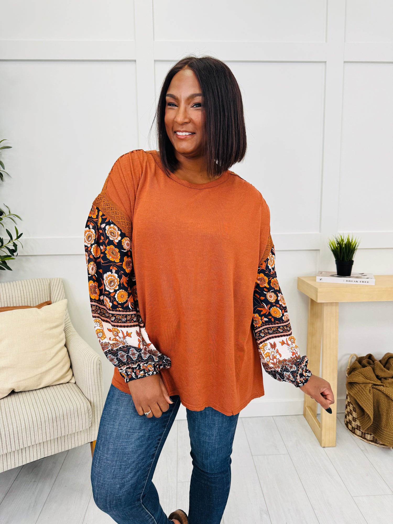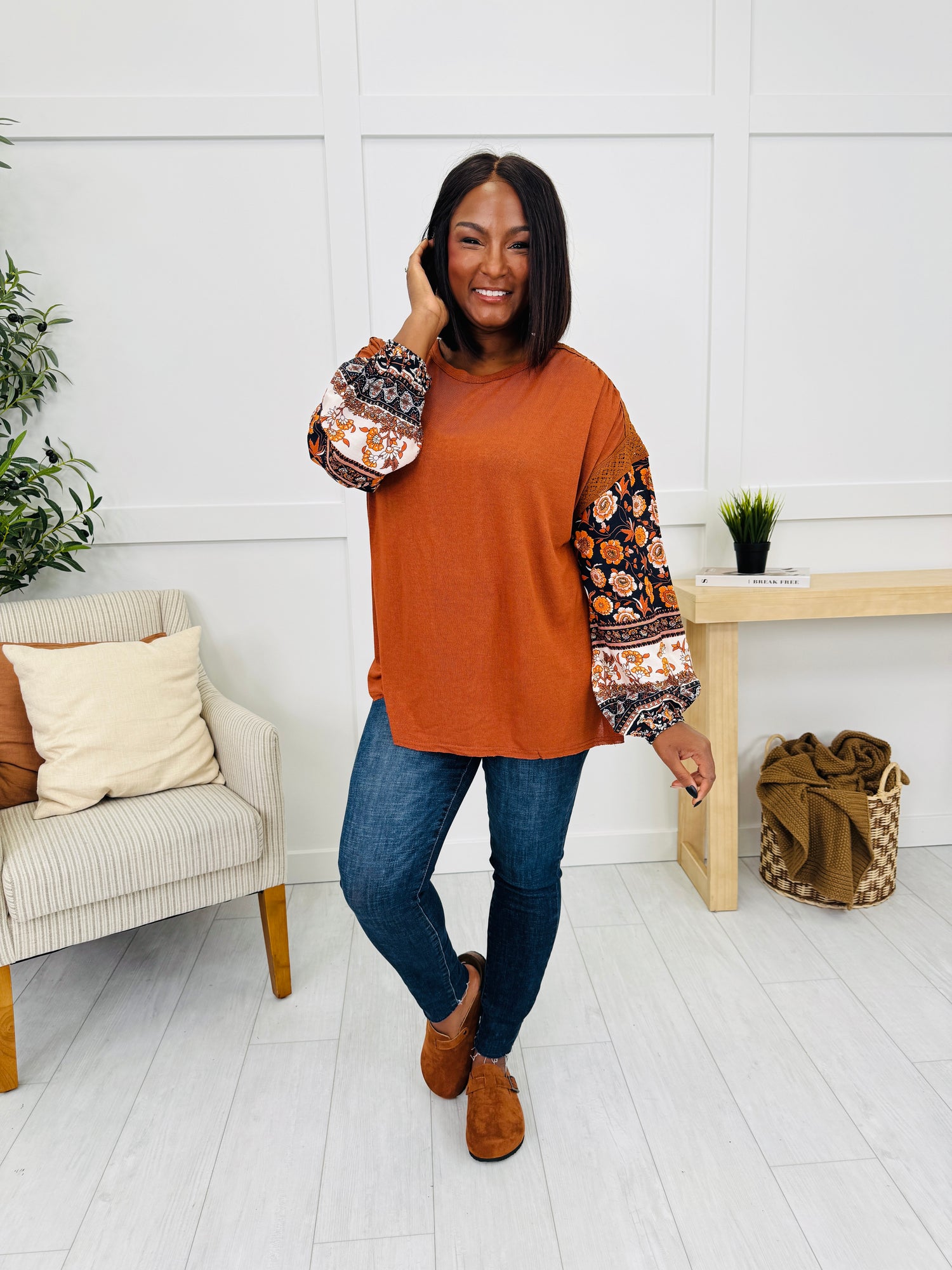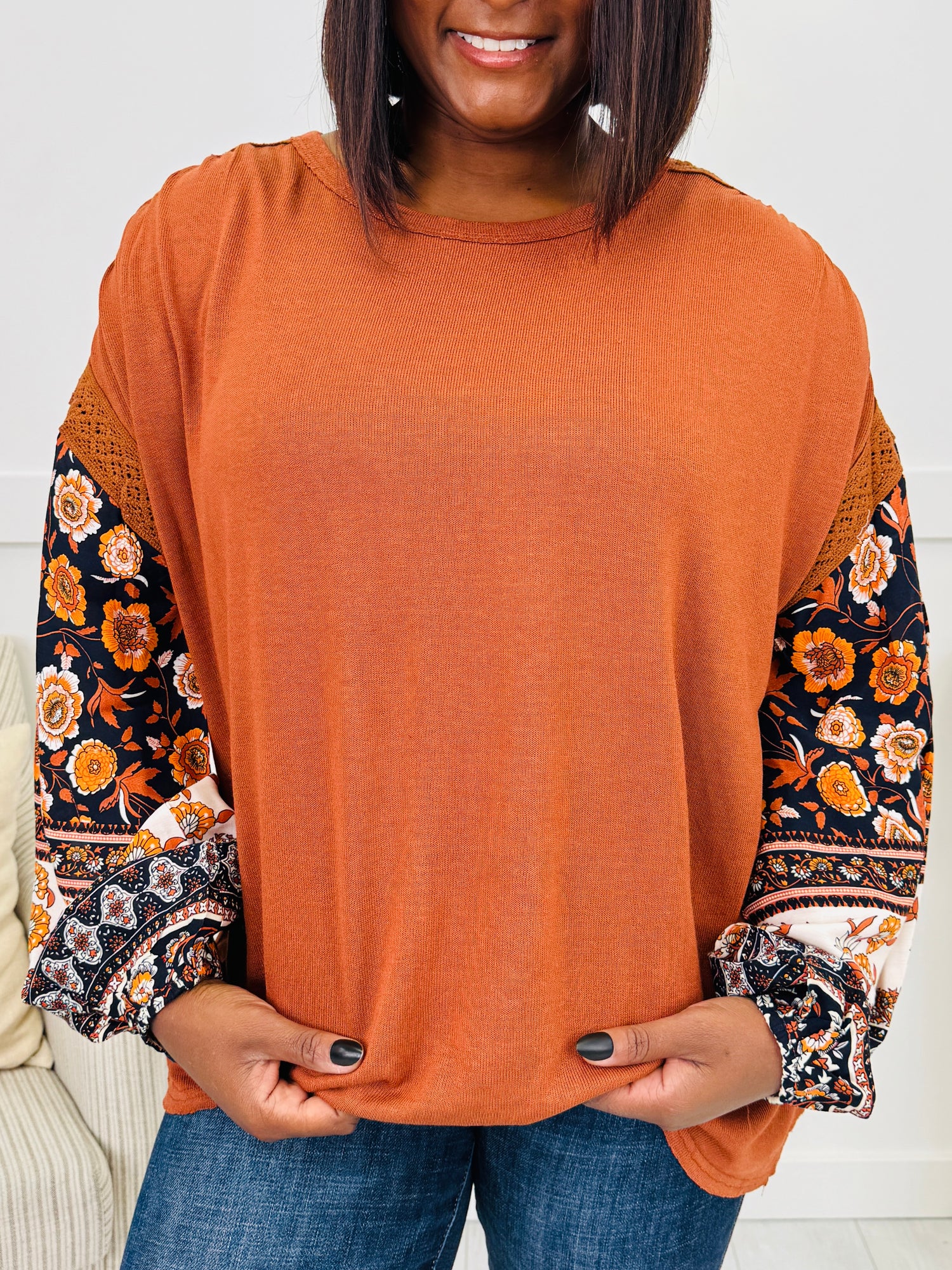 A warm solid knit body sets the stage for those standout mixed-print sleeves—full of florals and border motifs that pop against the contrast background. A crochet-style inset at the upper arm adds texture, while gathered cuffs give the long sleeves a soft, blouson shape. Finished with a simple crew neckline and a laid-back, easy fit that skims the hip, it’s an effortless pull-on piece with plenty of personality.
