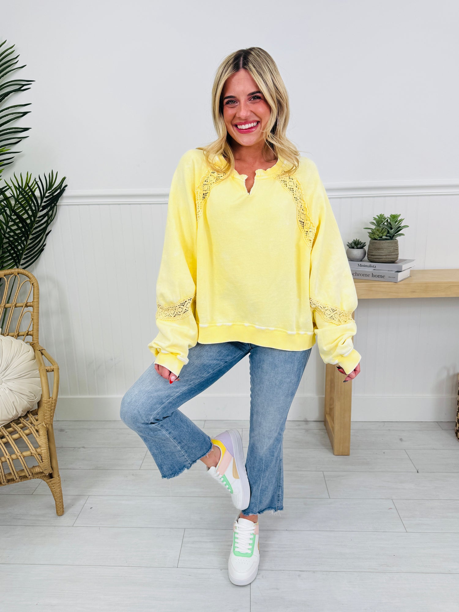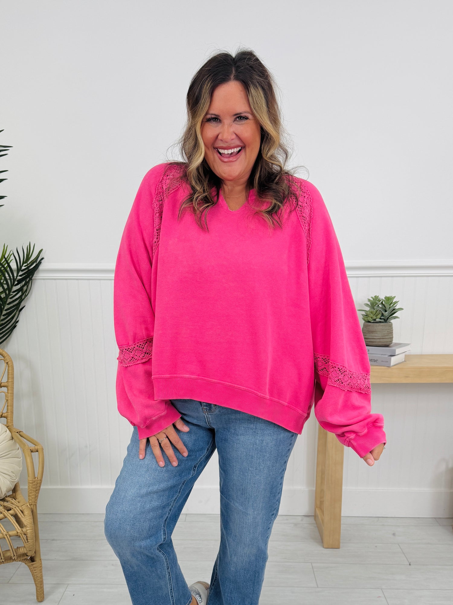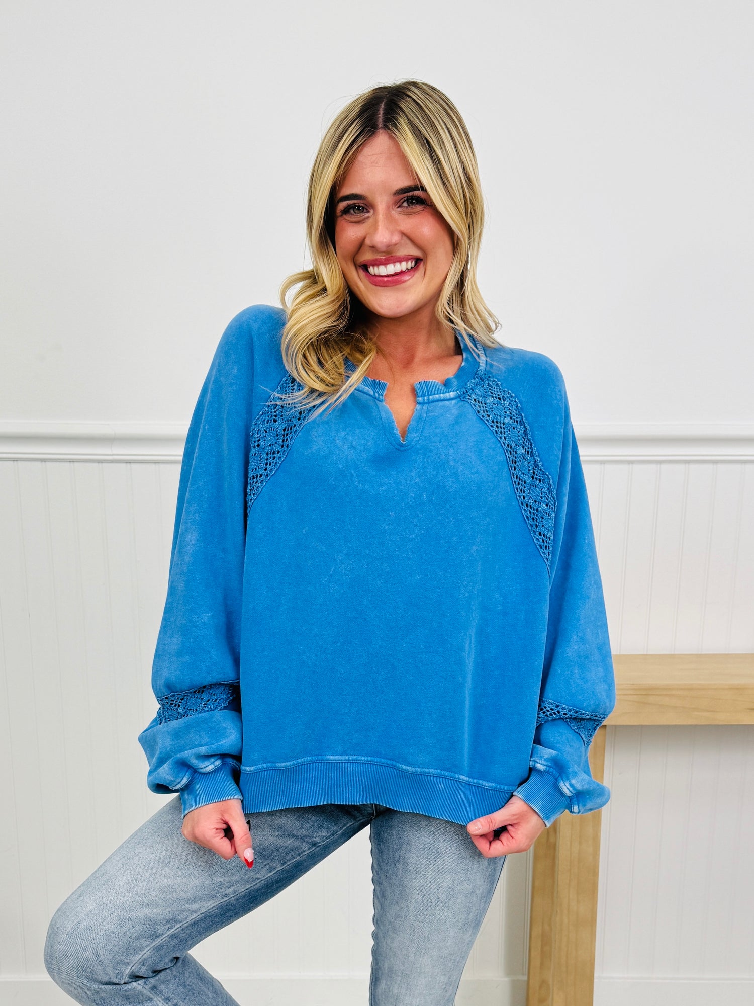 This buttery soft pullover is designed to bring comfort, color, and a little extra happiness to your everyday wardrobe. Featuring a soft, sweatshirt-style feel with trendy crochet detailing along the sleeves, this pullover blends casual comfort with an elevated luxe look and feel. The relaxed fit makes it easy to wear, while the cheerful colors instantly lift your look (and your mood).