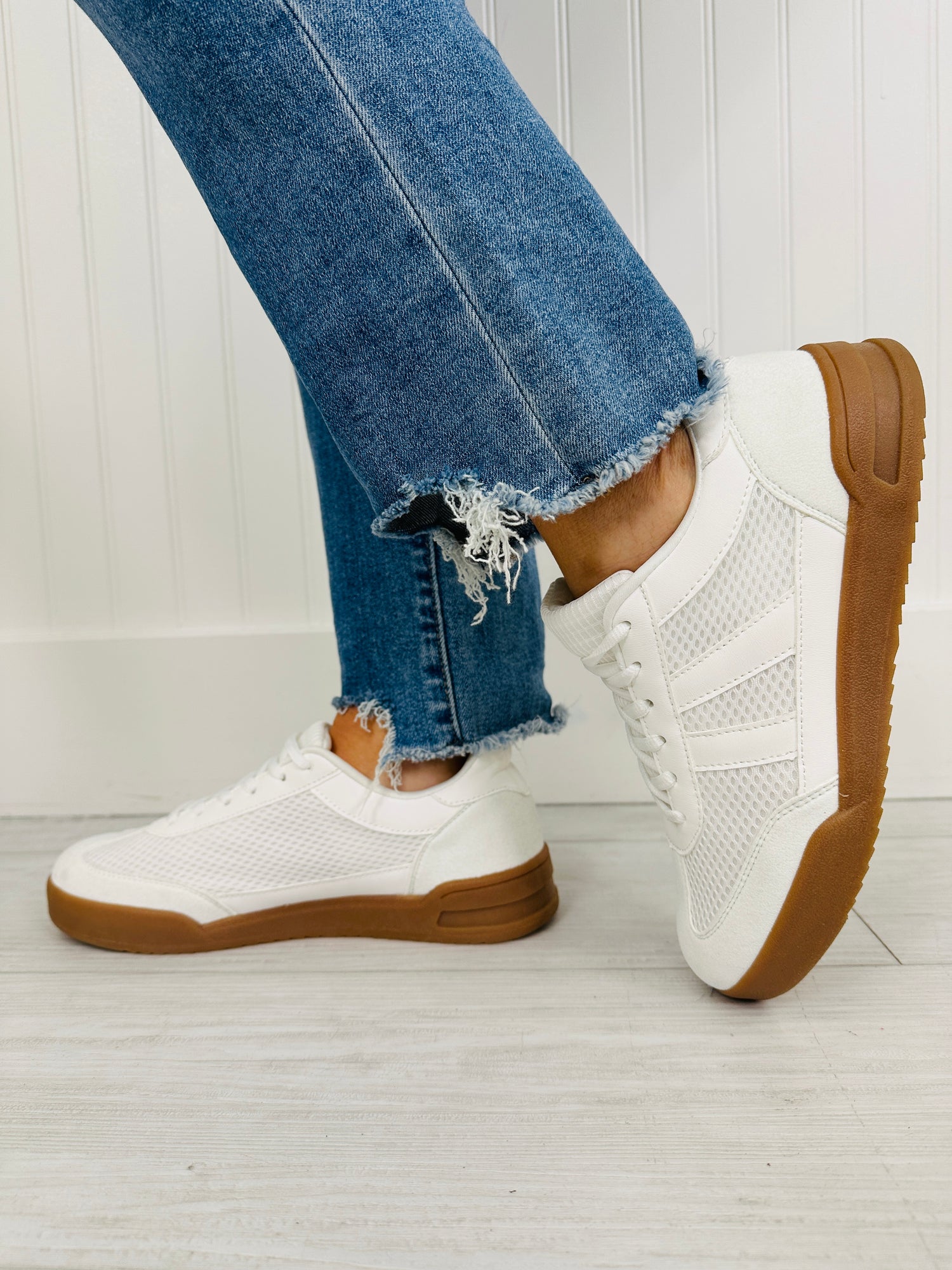 These sleek white sneakers blend a clean white finish with textured panel details for a sporty, elevated look you can wear anywhere. The gum-style sole adds a classic touch while giving the shoe a grounded, everyday feel. Pair them with jeans, joggers, or athleisure for a fresh, effortless vibe.