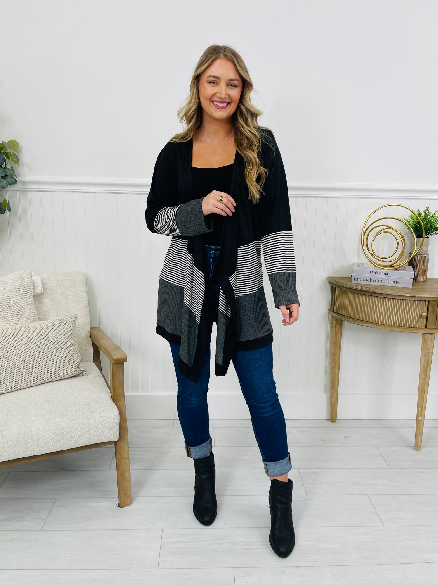 This cardigan blends effortless movement with striking contrast, featuring a flowing open-front design and a bold striped panel. The mixed-material adds subtle texture, giving the piece a dimensional look while keeping the style casual and easy to layer. Finished with a longer silhouette that falls beautifully over denim or leggings, it’s a standout layering piece you’ll reach for again and again.