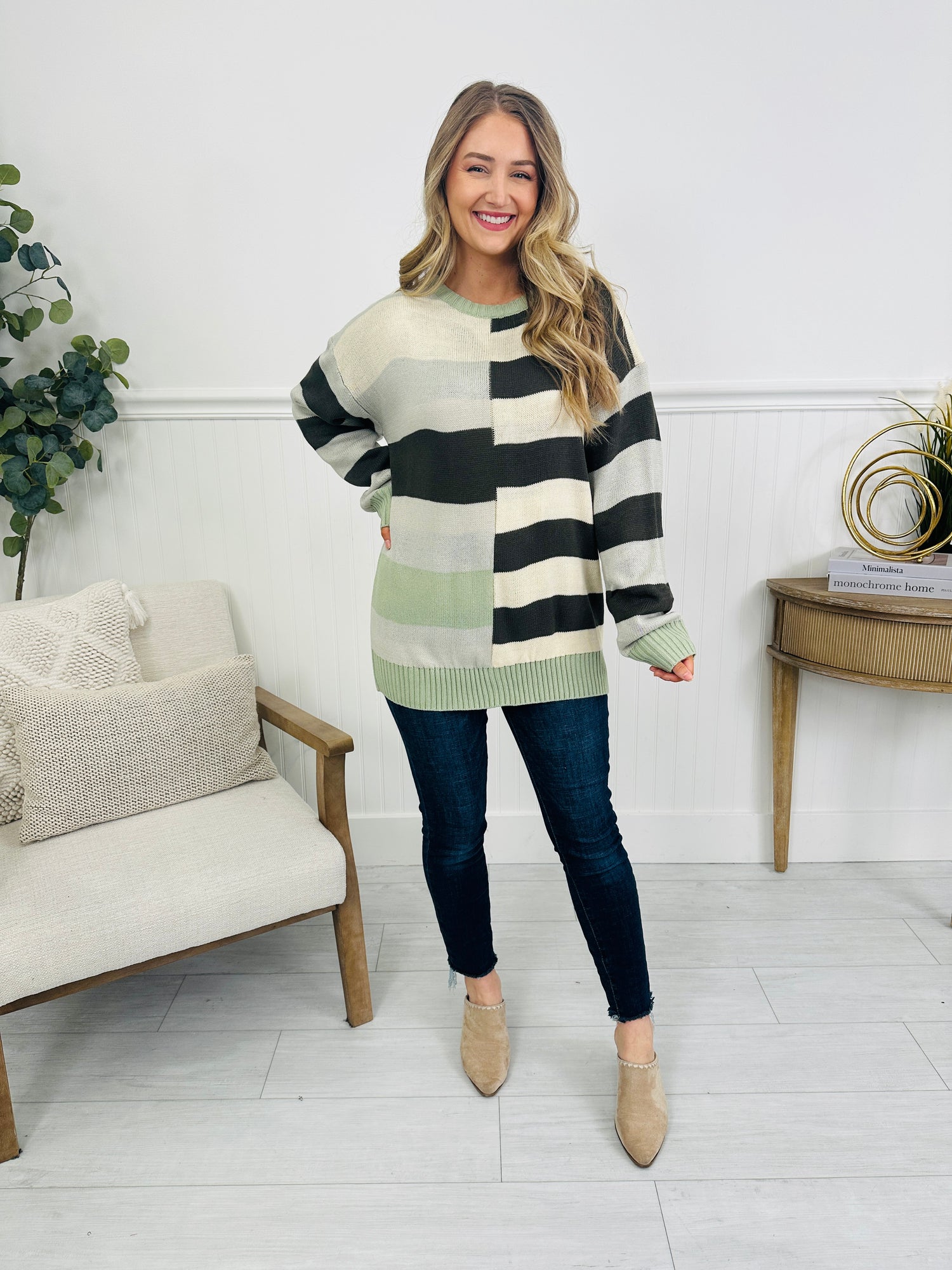 This sweater brings a playful twist to classic stripes with its patchwork-inspired layout and mix of wide and narrow bands. The relaxed, comfy fit makes it an easy throw-on piece you’ll reach for all season, and the banded neckline and trim add a polished finishing touch. Pair it with denim for an effortlessly cozy look that still stands out.