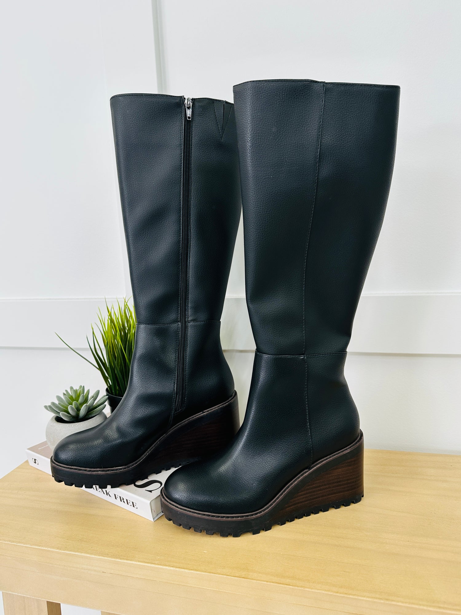 These wedge boots bring chic style with the comfort of a wedge heel that gives just the right amount of lift. The tall boot design pairs beautifully with everything from dresses to skinny jeans, while the smooth faux leather finish keeps the look modern and polished. A side zipper makes them easy to slip on and off, making them a versatile go-to for day or night wear.