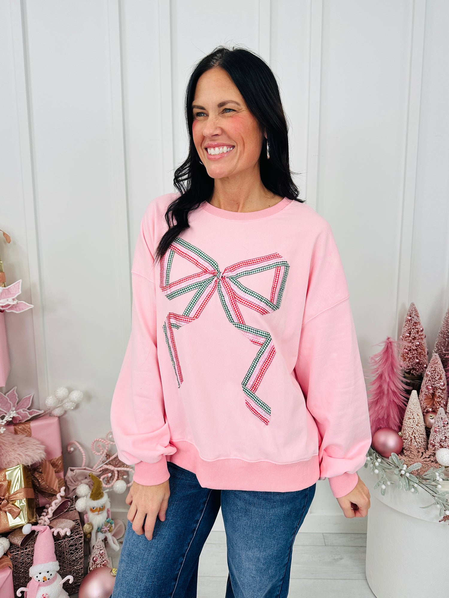 Sweet and festive, this sweatshirt brings instant holiday charm with its statement bow design across the front. The cheerful pink hue adds a playful twist to seasonal style, while the classic pullover fit keeps it comfy and easy to wear. Perfect for pairing with jeans or leggings, this piece blends cozy comfort with a touch of girly holiday fun.