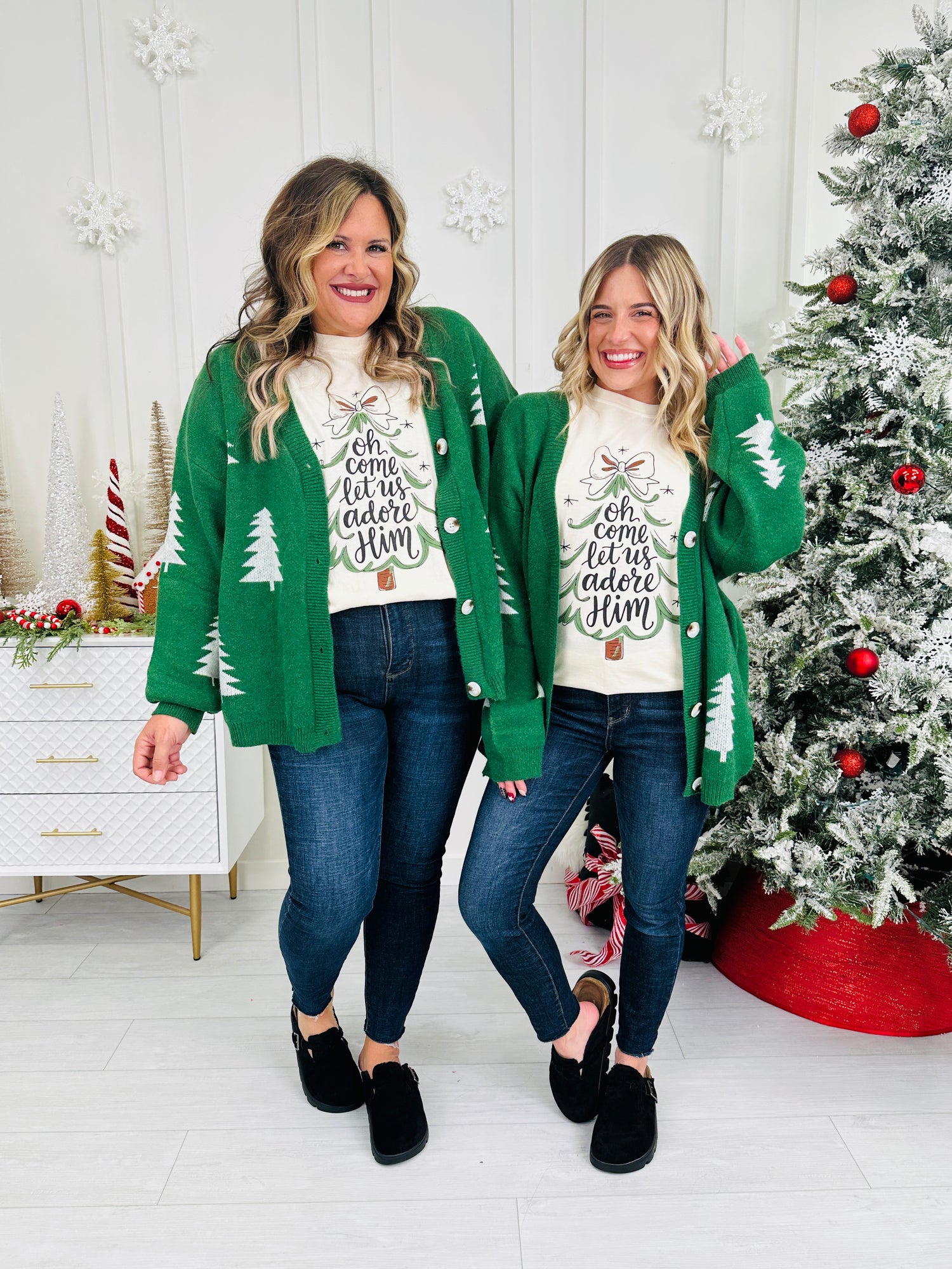 [message]Make this season merry and bright in this new Christmas cardigan that's perfect for dressing up to holiday parties or down with your favorite graphic tee and leggings this holiday season. This cozy cardigan is a festive favorite featuring an adorable tree pattern that instantly spreads holiday cheer. Crafted from a soft, medium-weight knit, it’s perfect for layering over your favorite basics for that cozy, effortless look we all love this time of year.