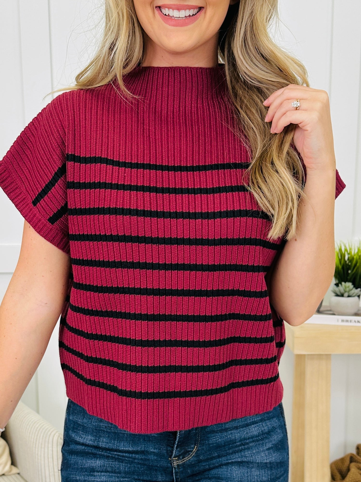 Clean and modern, this knit top features a high mock neckline and an allover cozy material for a polished look. Horizontal stripes add a graphic touch, while the cap sleeves and straight, banded hem keep the silhouette easy to style. Available in several colors, it pairs effortlessly with denim for an elevated everyday outfit.