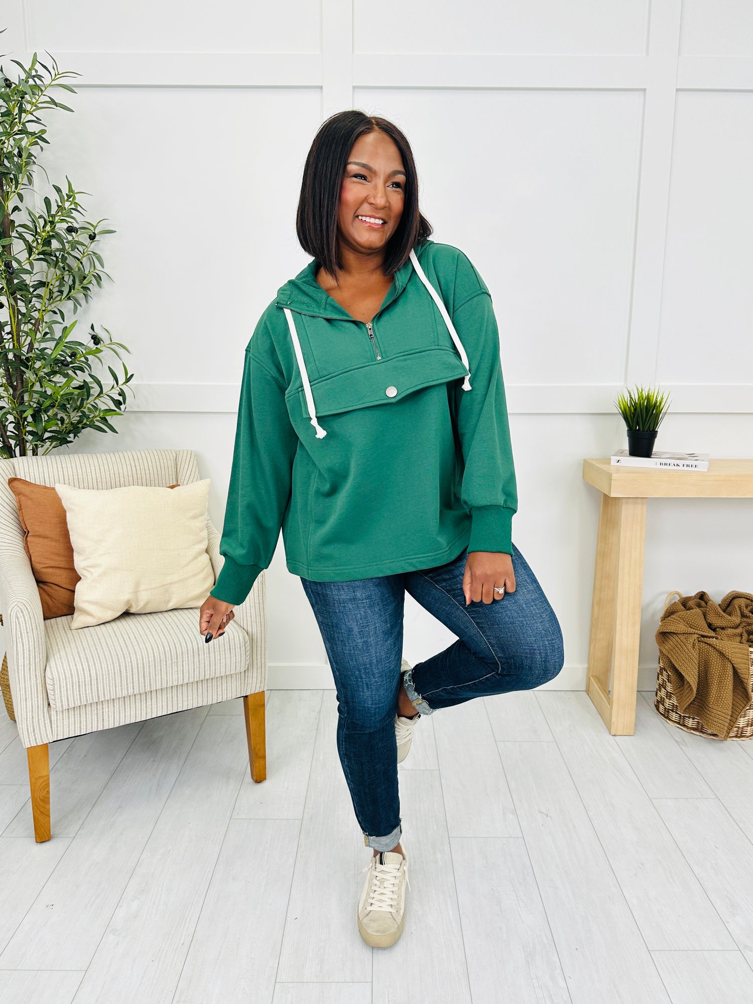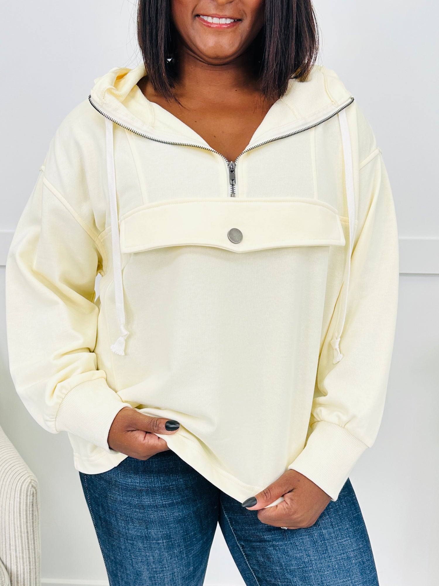 Meet your new go-to for laid-back days — this casual hoodie has all the right details to keep things comfy yet cute. The half zip neckline adds a touch of function, while the drawstring hood detail keeps the look relaxed. Finished with a front snap accent for a pop of style, it’s the perfect throw-on piece that comes in a variety of colors to suit your vibe.
