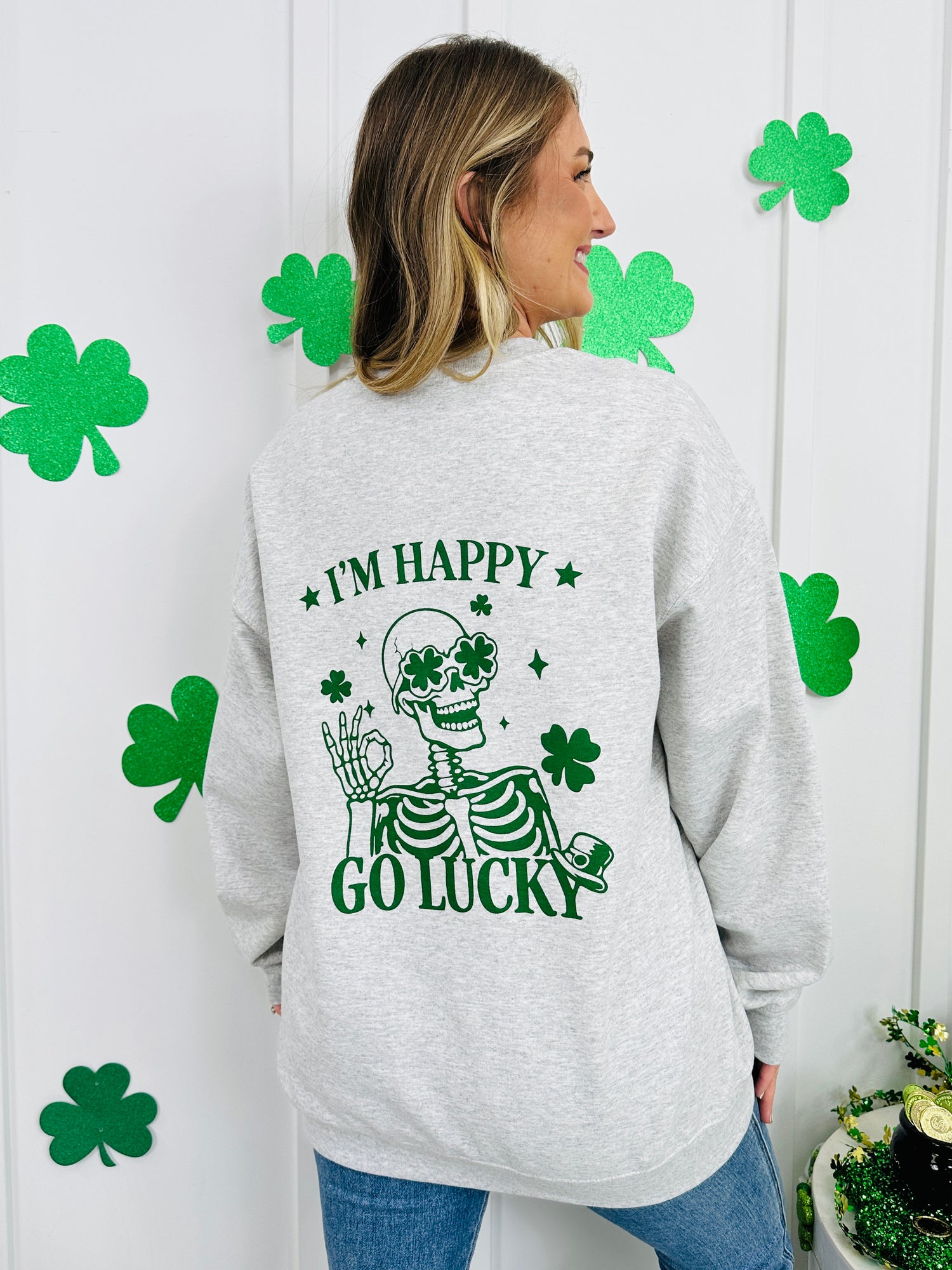Get ready to bring a little lucky charm and a lot of personality to your wardrobe with the I'm Happy Go Lucky sweatshirt — a bold, playful design that’s equal parts cheeky and festive. The large back graphic features a clover-eyed skeleton surrounded by shamrocks, stars, and sparkly details, finished with the fun phrase “I’m Happy, Go Lucky” that instantly steals the spotlight.