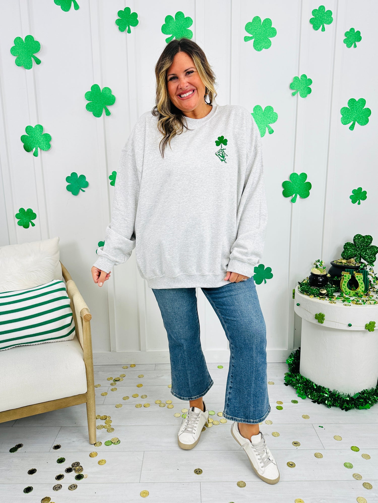 This cozy crewneck is screen printed in-house for long-lasting wear. With its easy, relaxed fit and soft feel, it’s perfect for everything from St. Patrick’s Day celebrations to everyday casual looks. Pair it with jeans, leggings, or joggers for an effortlessly cool outfit that brings the lucky vibes wherever you go.