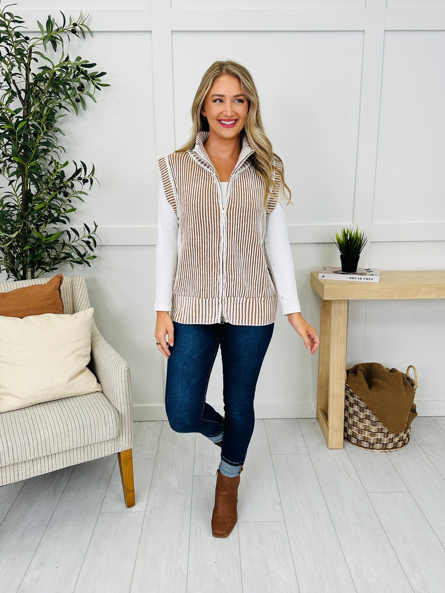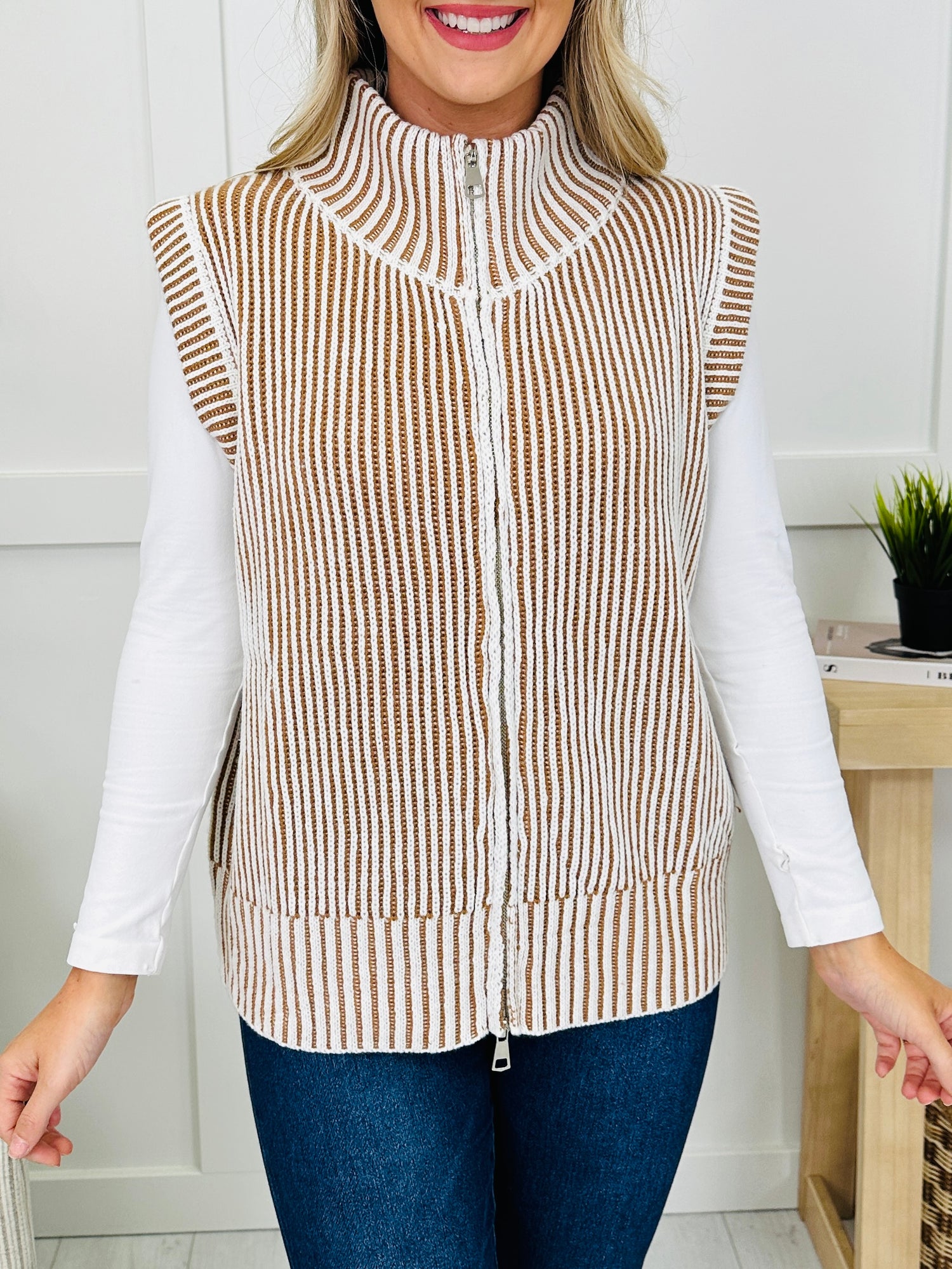 This striped knit vest is a perfect statement piece to layer over your favorite basics. The high collar, sleeveless cut, and zip-up front make it easy to wear open or closed, while the stripes add a touch of texture and style. Whether you pair it with a long sleeve tee or keep it casual with denim, this vest brings an effortlessly polished look.
