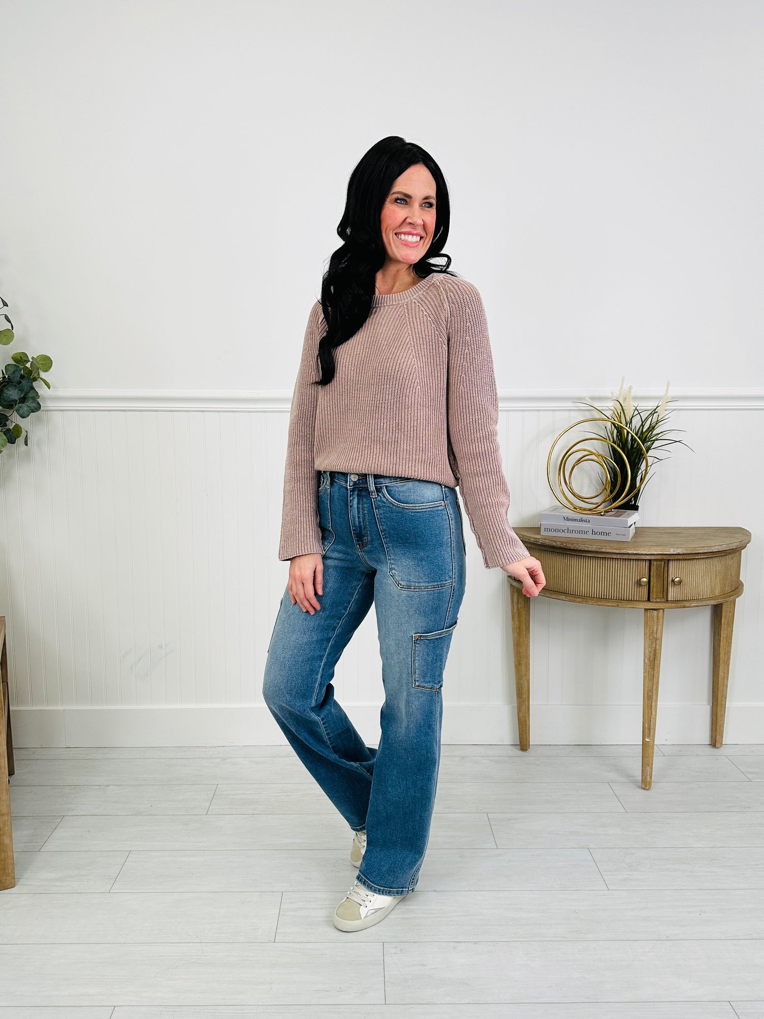 Say hello to your new favorite “cool girl” denim. These straight fit jeans blend laid-back comfort with a trend-forward silhouette—featuring a flattering high rise, a relaxed leg, and cargo pockets that give just the right amount of edge. The medium wash keeps them classic and easy to style, while the clean finish (no distressing) makes them feel polished enough for everyday wear.