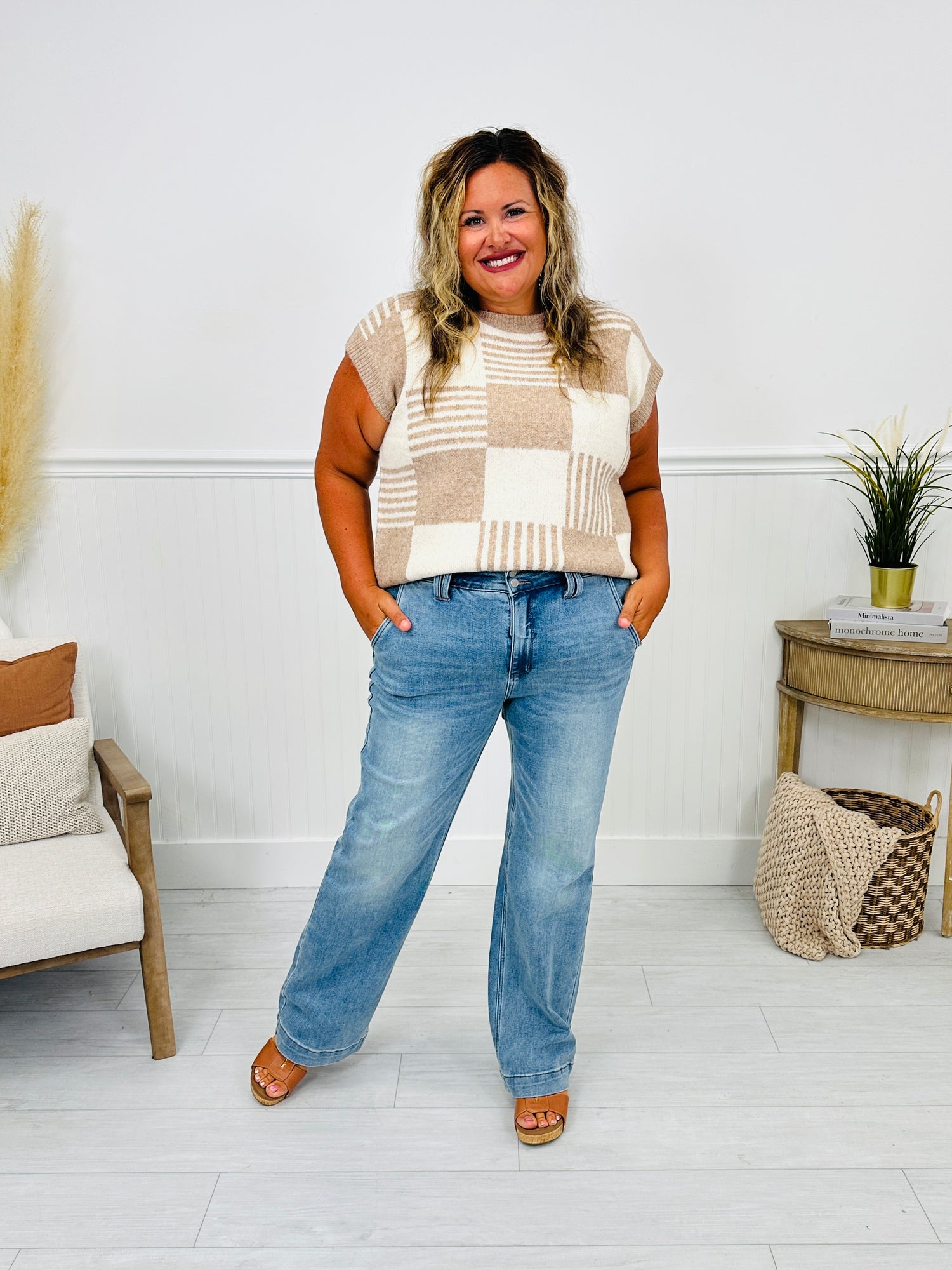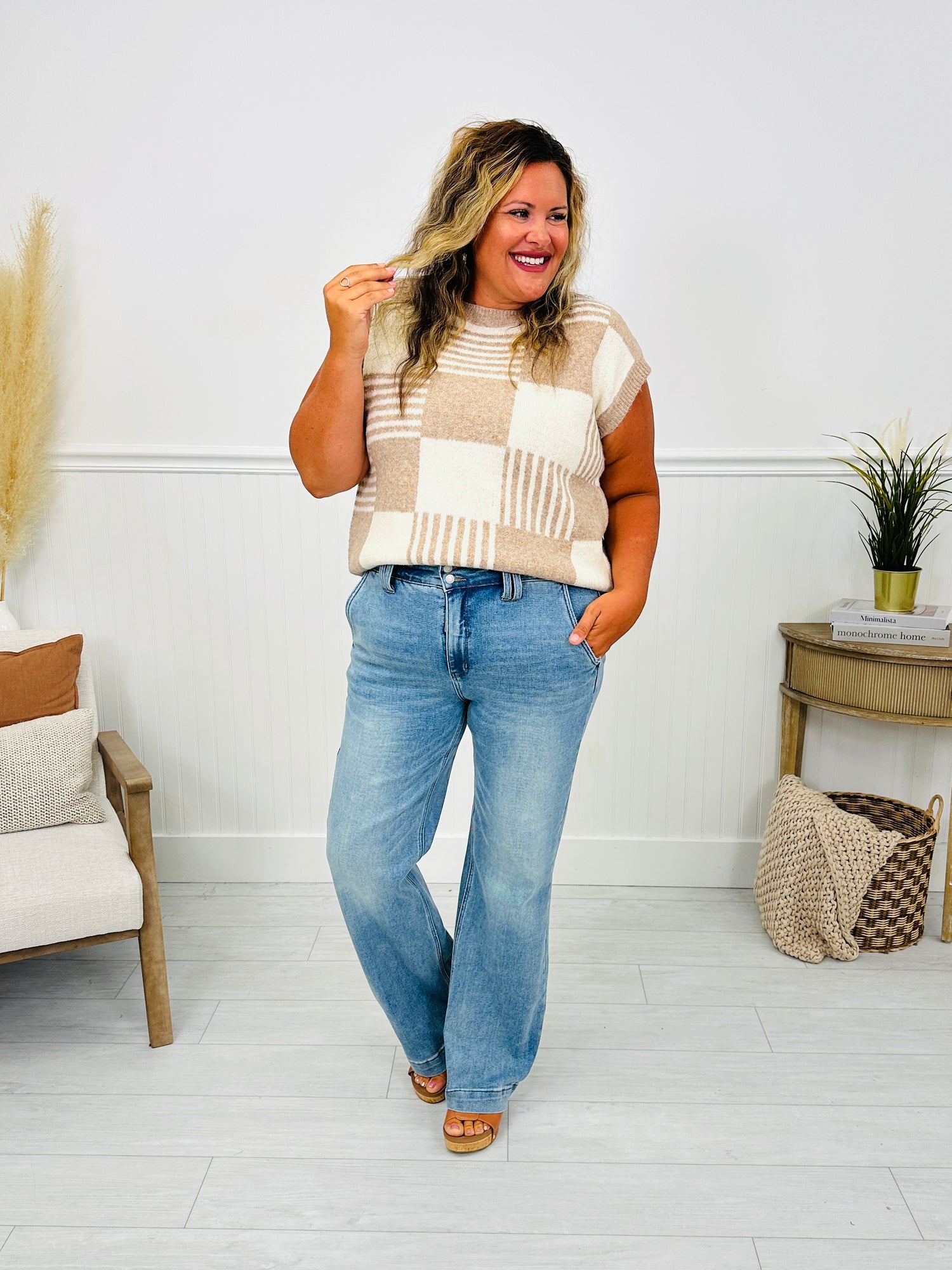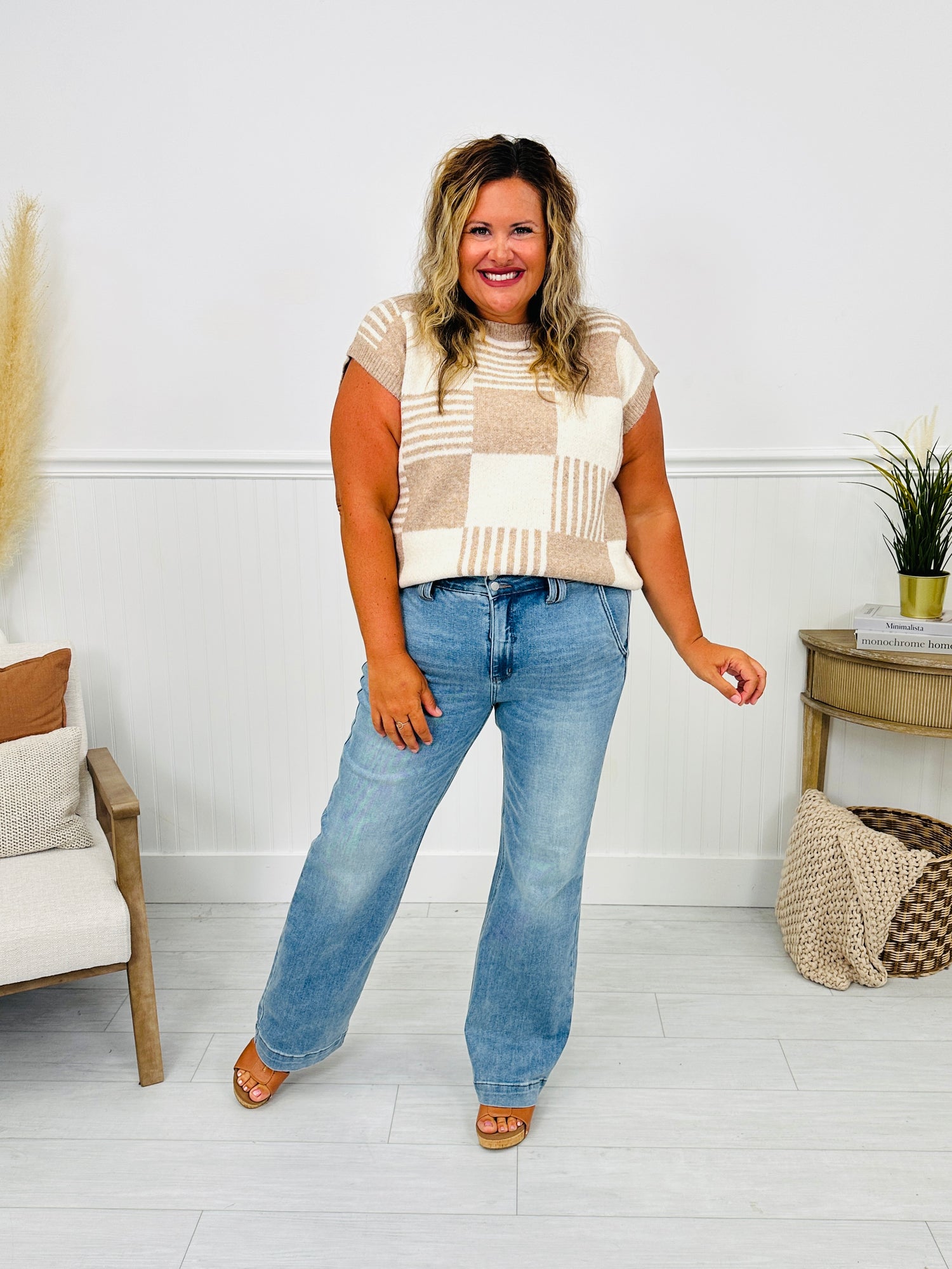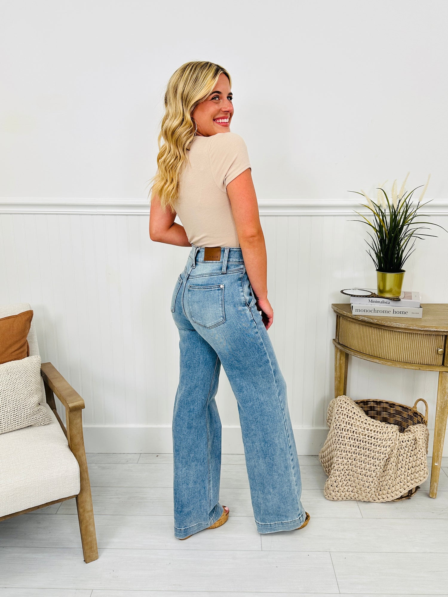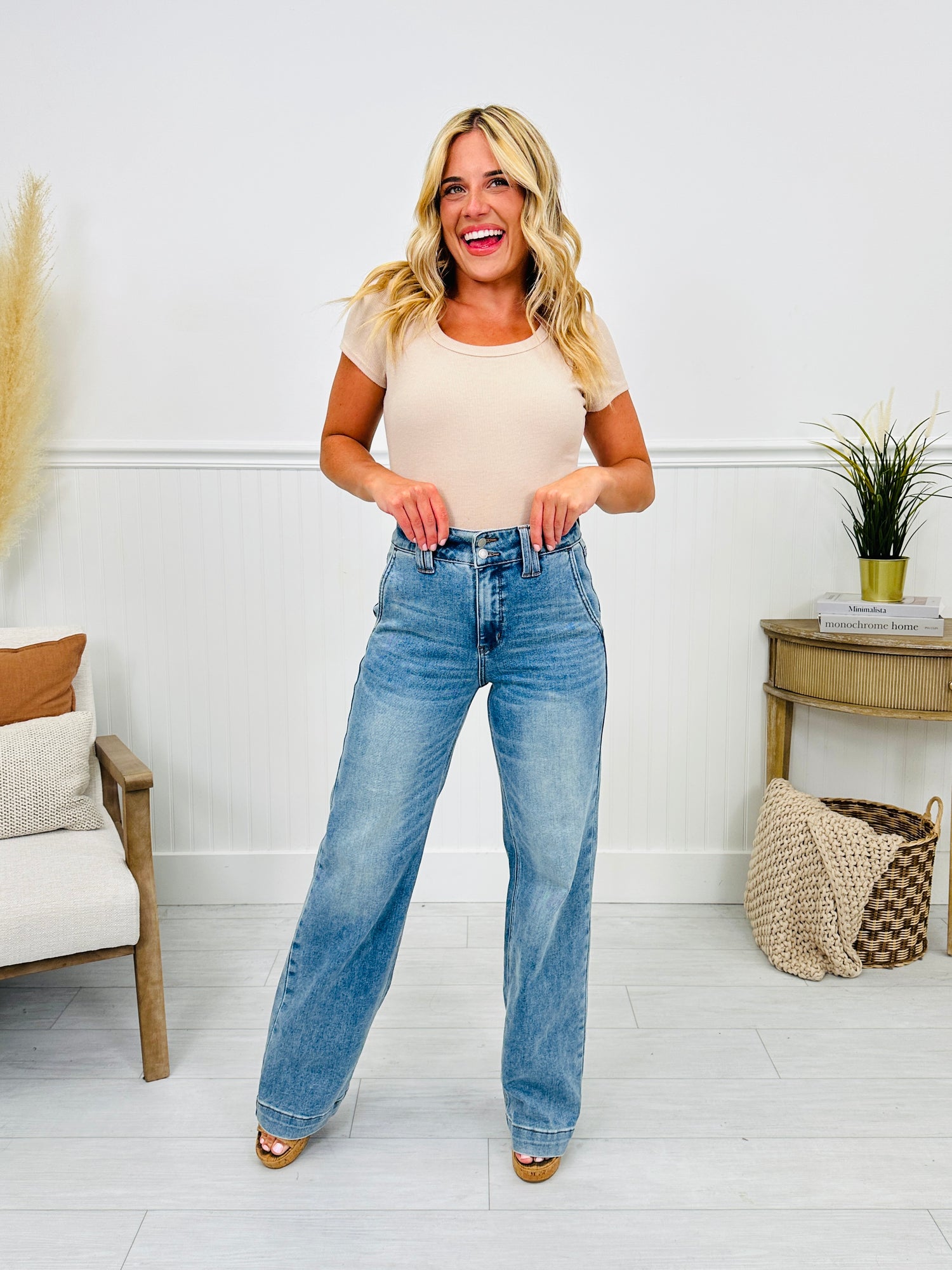 These new Judy Blue Jeans are the perfect jeans to transition into fall! These wide leg trouser style jeans are flattering on every single body type. The high rise sucks you in and the side pockets are slimming on your hips. We love the trendy, double button detail! These jeans are buttery soft and so stretchy! They have zero holes or distressing and the finished hem makes them perfect to wear from work to weekend to everywhere in between. Grab these new Judy Blue Jeans before they are gone!