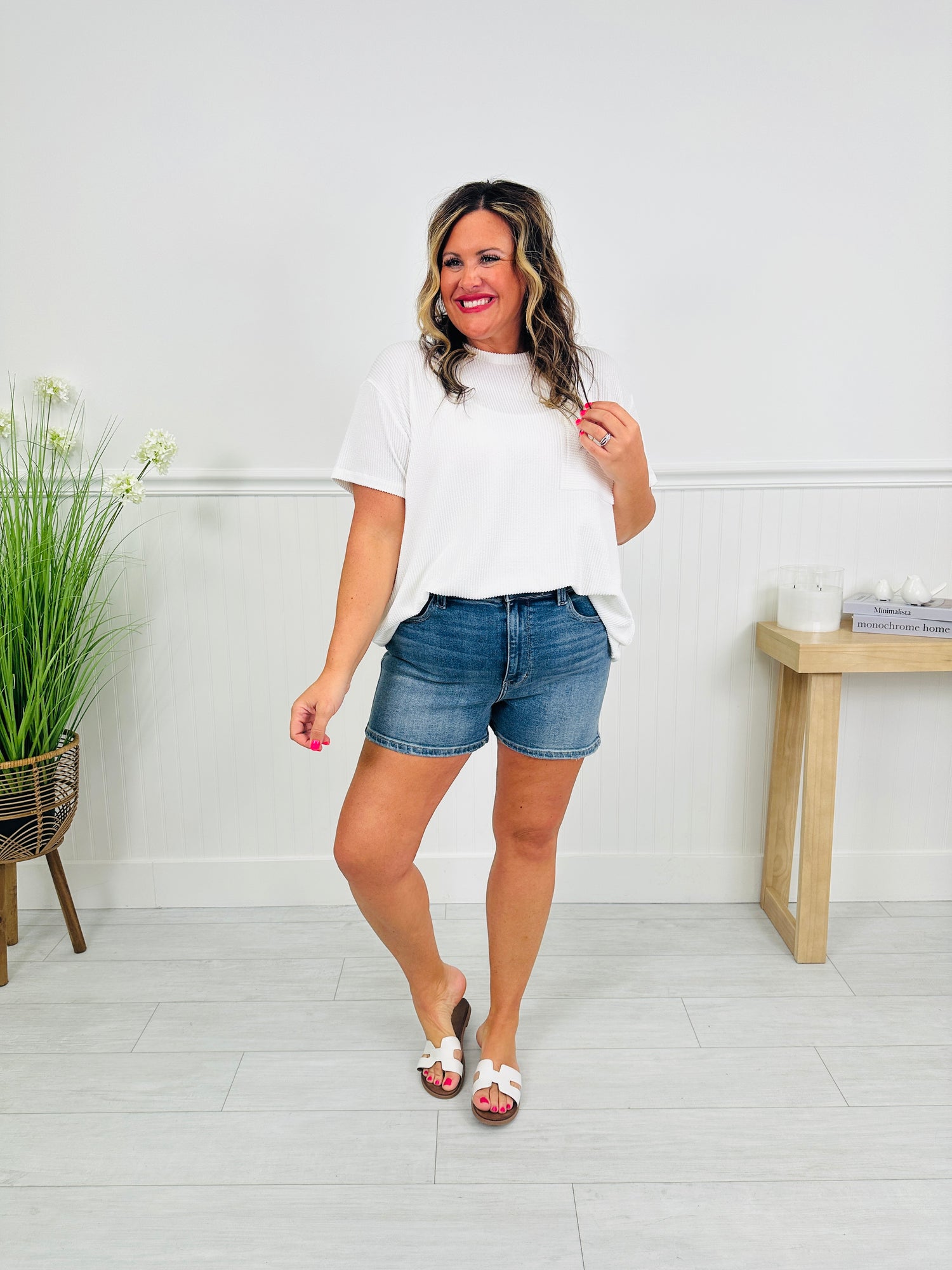 These shorts are the kind of pair you’ll reach for when you want something timeless, flattering, and easy to style. The medium wash denim gives them that fresh, casual feel, while the clean non-distressed design keeps the look polished and versatile. The flattering fading and whiskering gives an added confidence boost and trendy touch without making them feel overly worn, and the utility-inspired front pocket detail gives them a little something extra that sets them apart from a basic pair.