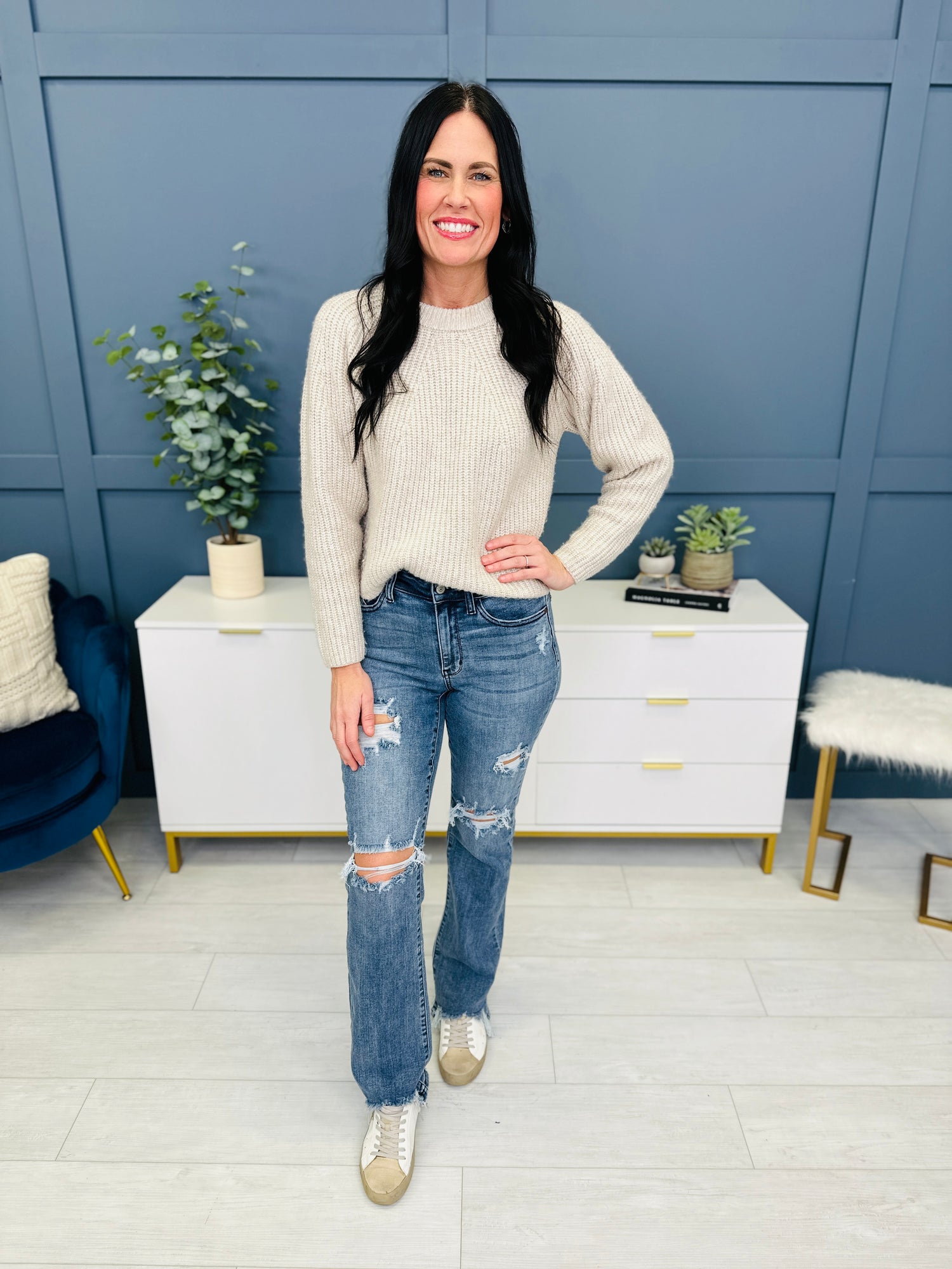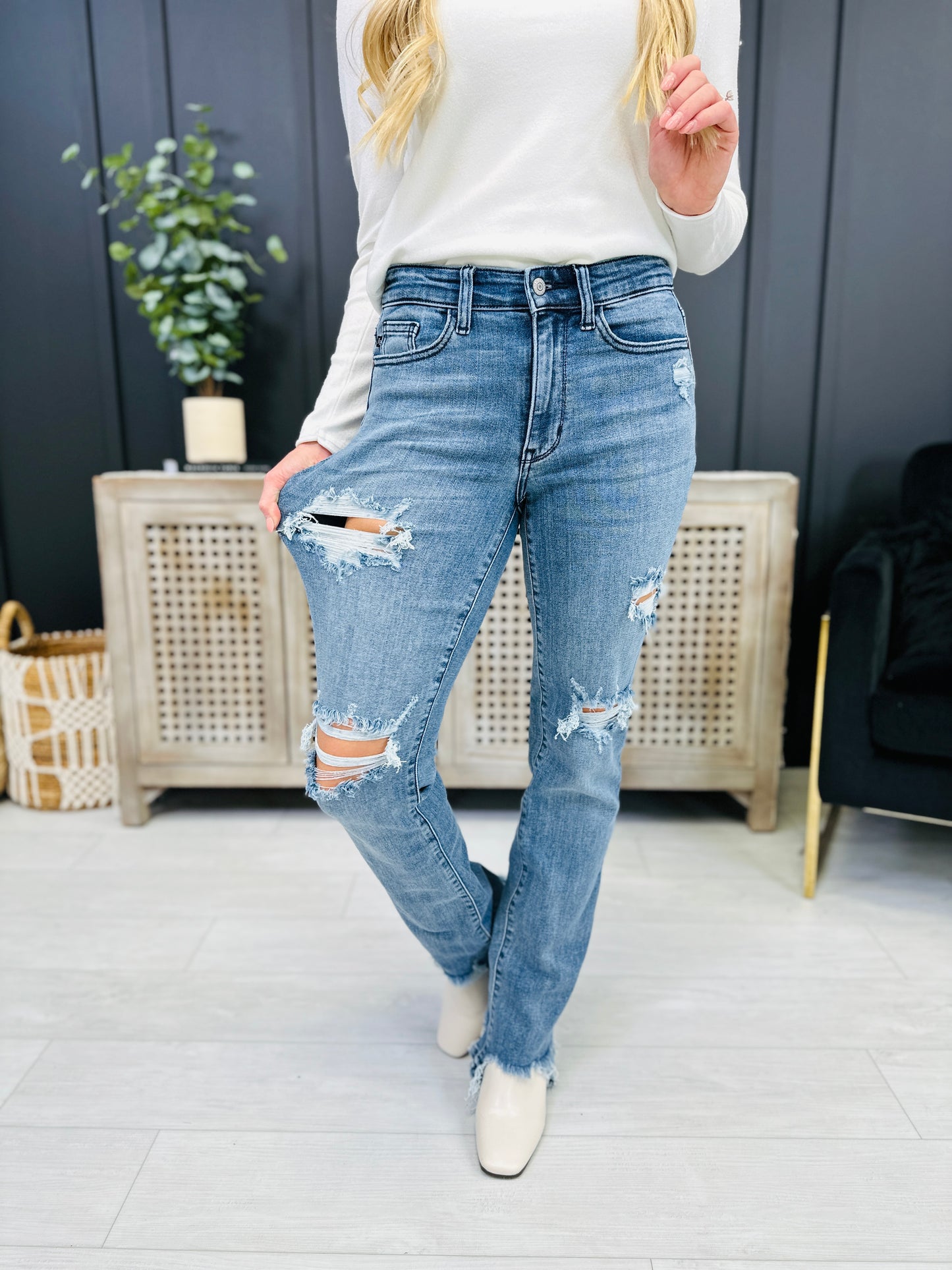 Straight leg jeans are trending and we can't get enough! This pair from Judy Blue is absolute perfection. The straight leg fit means they are more relaxed than a skinny fit but not as loose as a boyfriend jean. They are the perfect in-between!