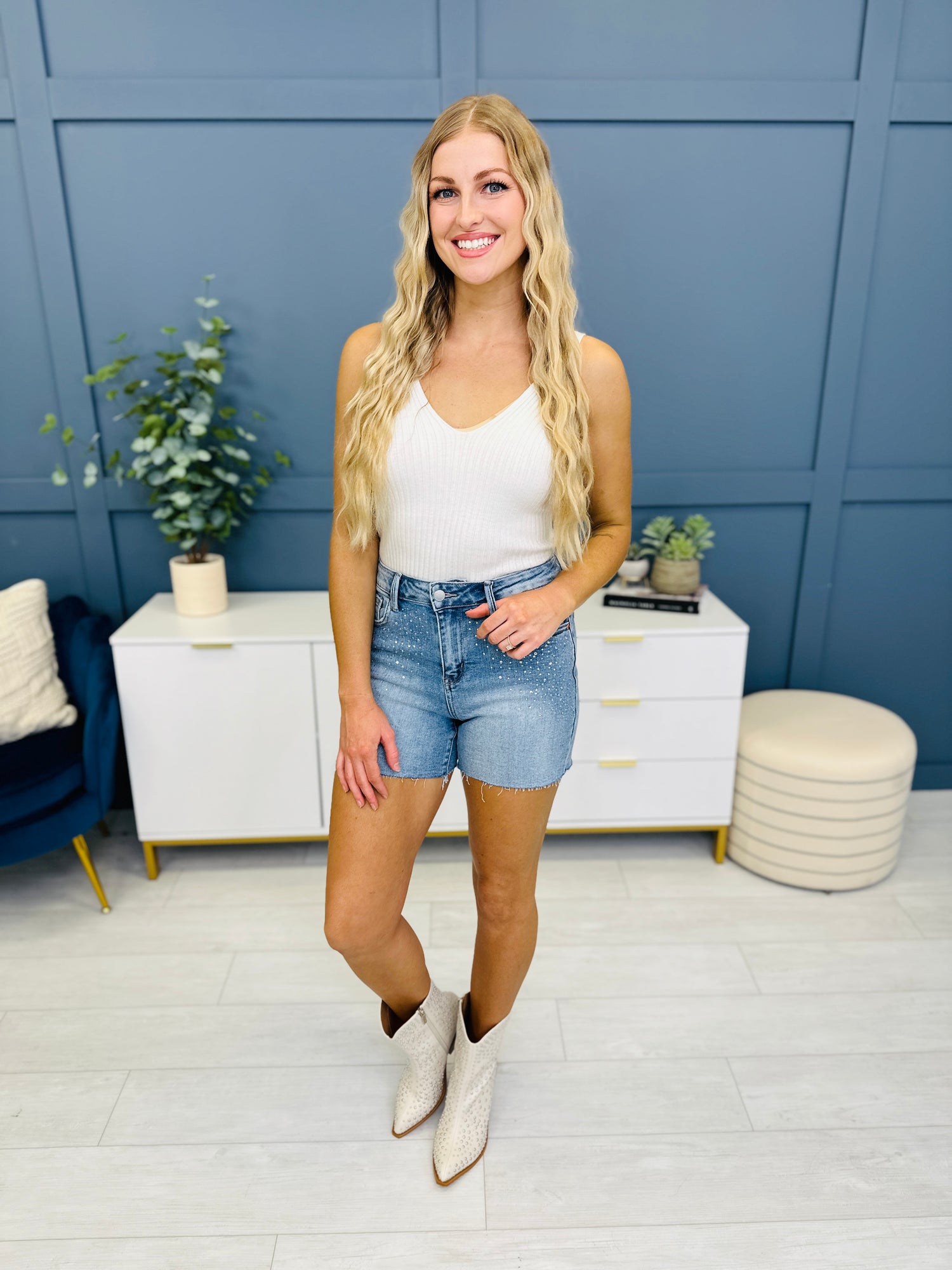 - These shorts feature crystals on the front and butt of the short for an added bling that can be worn everywhere this summer to elevate your look!