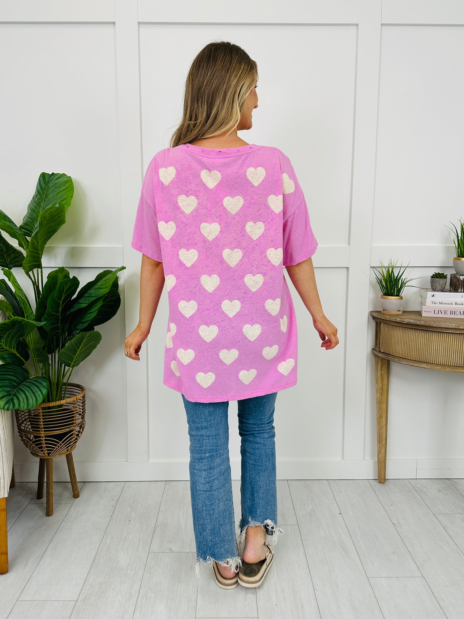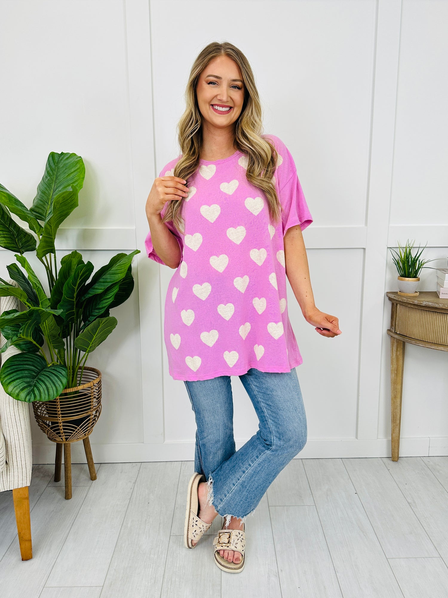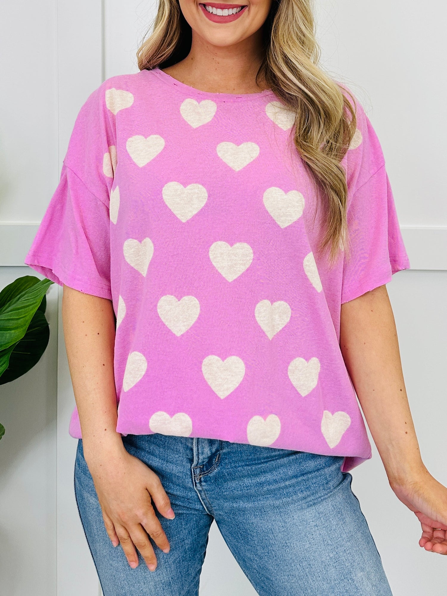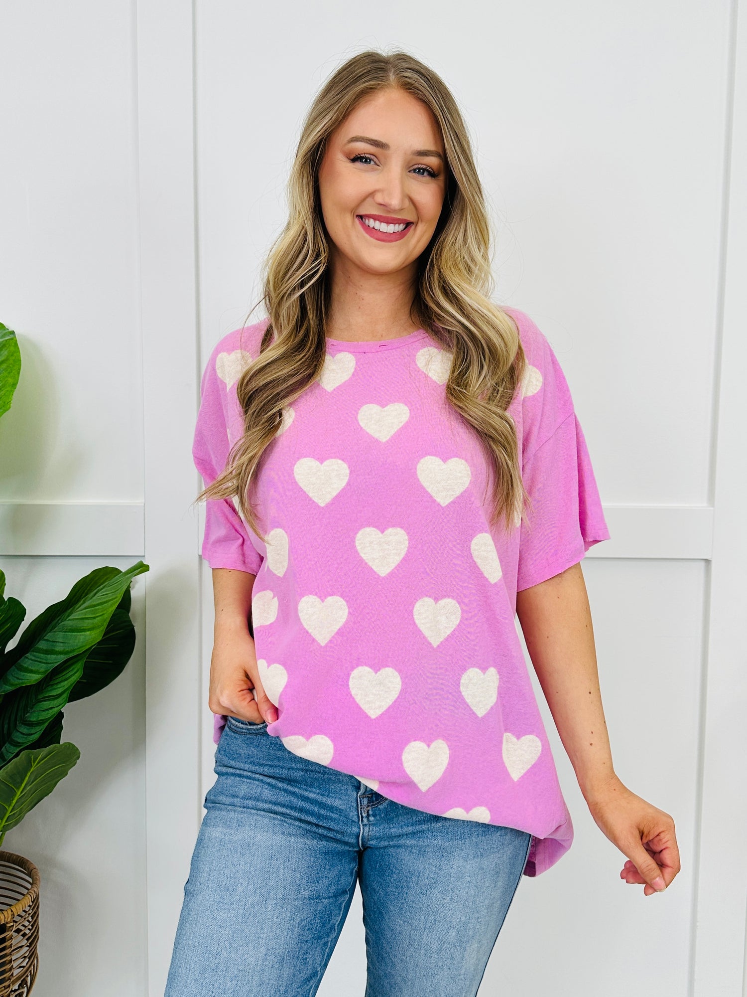 This sweet heart-print top is the kind of easy throw-on piece that instantly makes your outfit feel a little more fun. With its relaxed, easy fit and classic crew neckline, it’s comfy for everyday wear but still cute enough to feel styled. Pair it with your favorite denim or leggings for a simple look that feels cheerful and effortless.