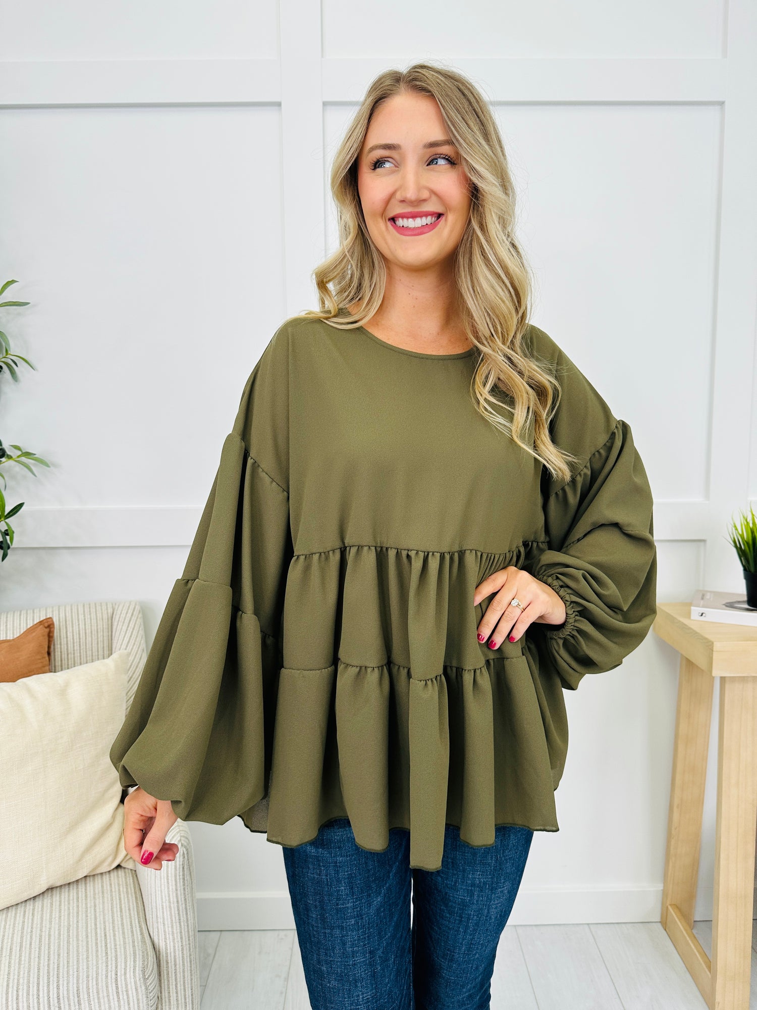This top features a beautifully flowy, tiered design that creates a flattering silhouette, while the balloon sleeves add a touch of drama. Its loose fit ensures comfort, making it perfect for both casual outings and more dressed-up occasions. Available in several colors, this piece effortlessly combines style with ease.