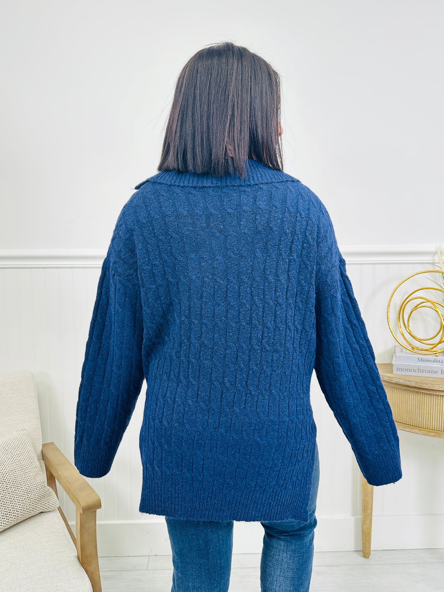 This sweater brings together a soft cable knit design with a split collar neckline for a look that feels classic yet effortlessly cozy. The relaxed yet classic fit gives it that easy, throw-on silhouette that pairs beautifully with denim or leggings. Finished with wide banded cuffs and a ribbed hem, it’s the kind of timeless style you’ll reach for again and again in every season.