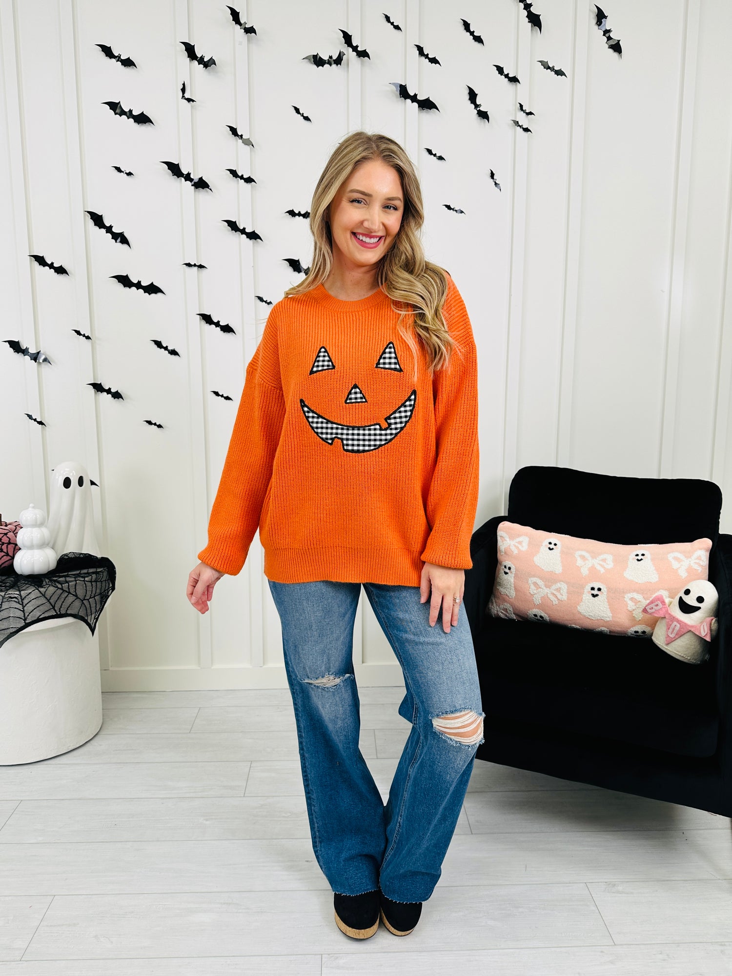 Celebrate spooky season in style with this playful sweater featuring a large jack-o’-lantern face crafted from charming gingham appliqué. Its cheerful festive hue instantly brightens your look while the cozy relaxed fit keeps things comfy all day long. It’s the perfect pick for adding a touch of Halloween fun to your wardrobe!