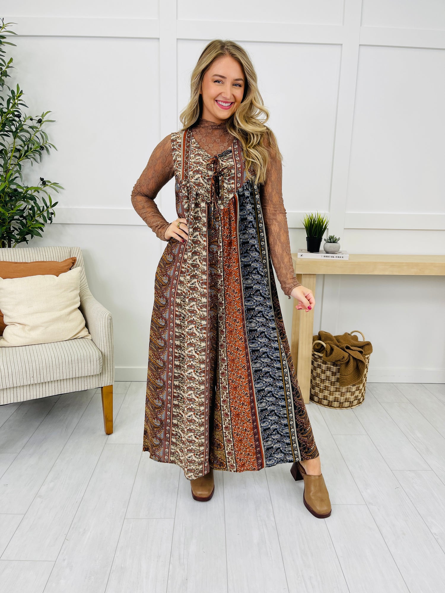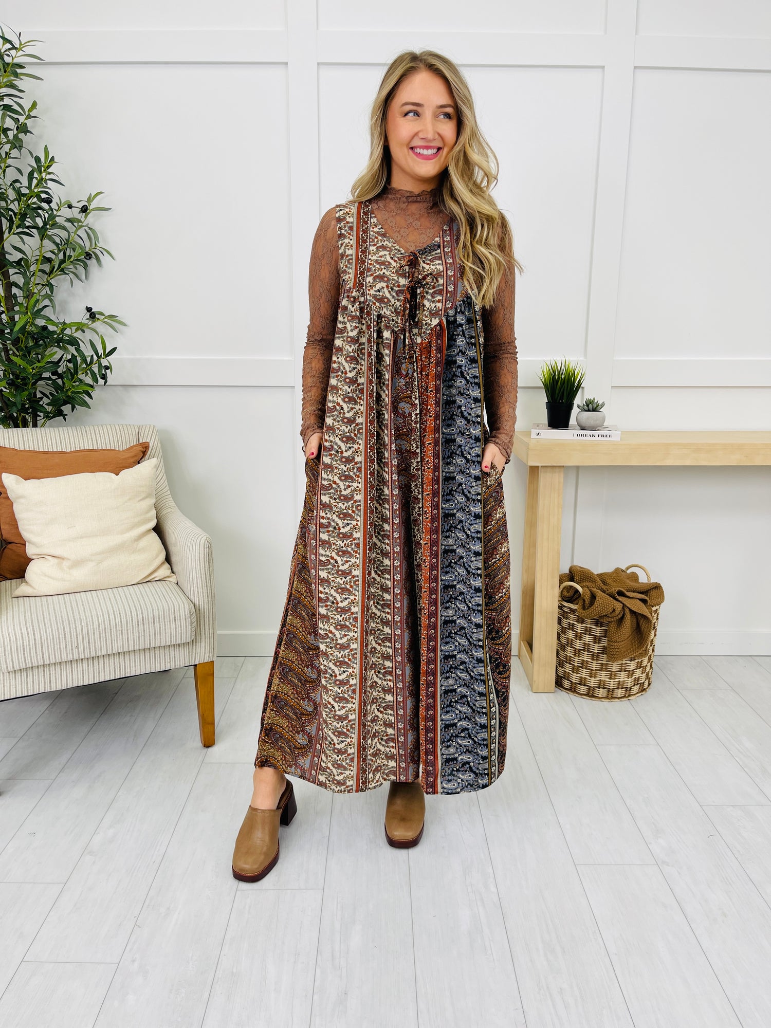 This jumpsuit makes a statement with its bold paisley print accented by deep, rich tones and contrasting patterns throughout. The wide leg silhouette flows effortlessly, giving it a relaxed yet elevated feel. Finished with a playful front tie detail, this piece brings a touch of bohemian charm while keeping things stylish and unique.