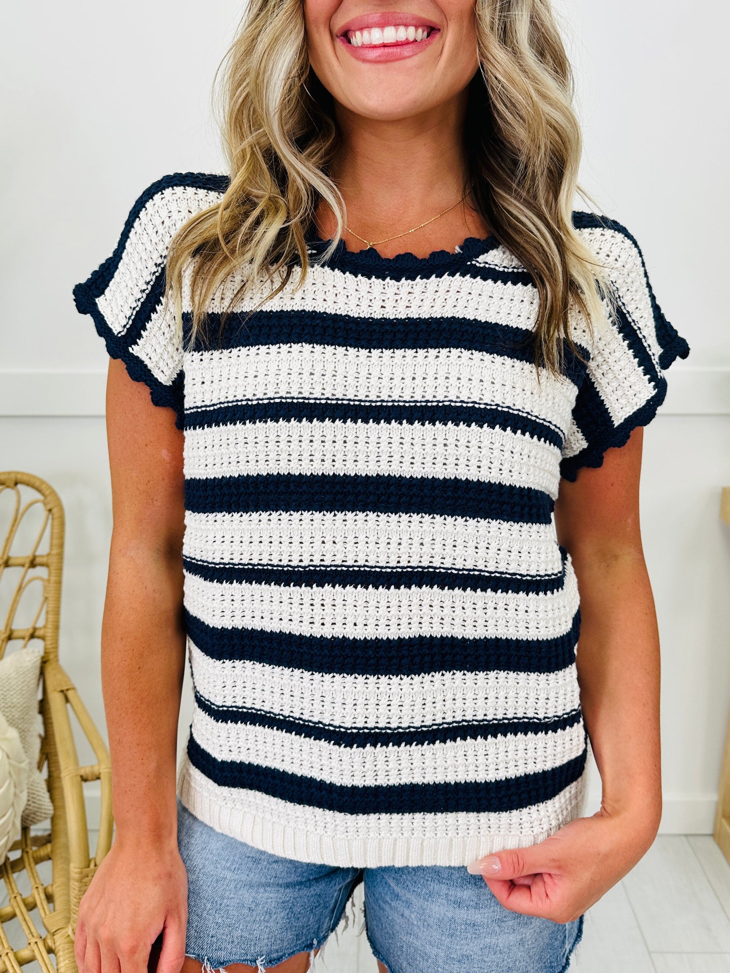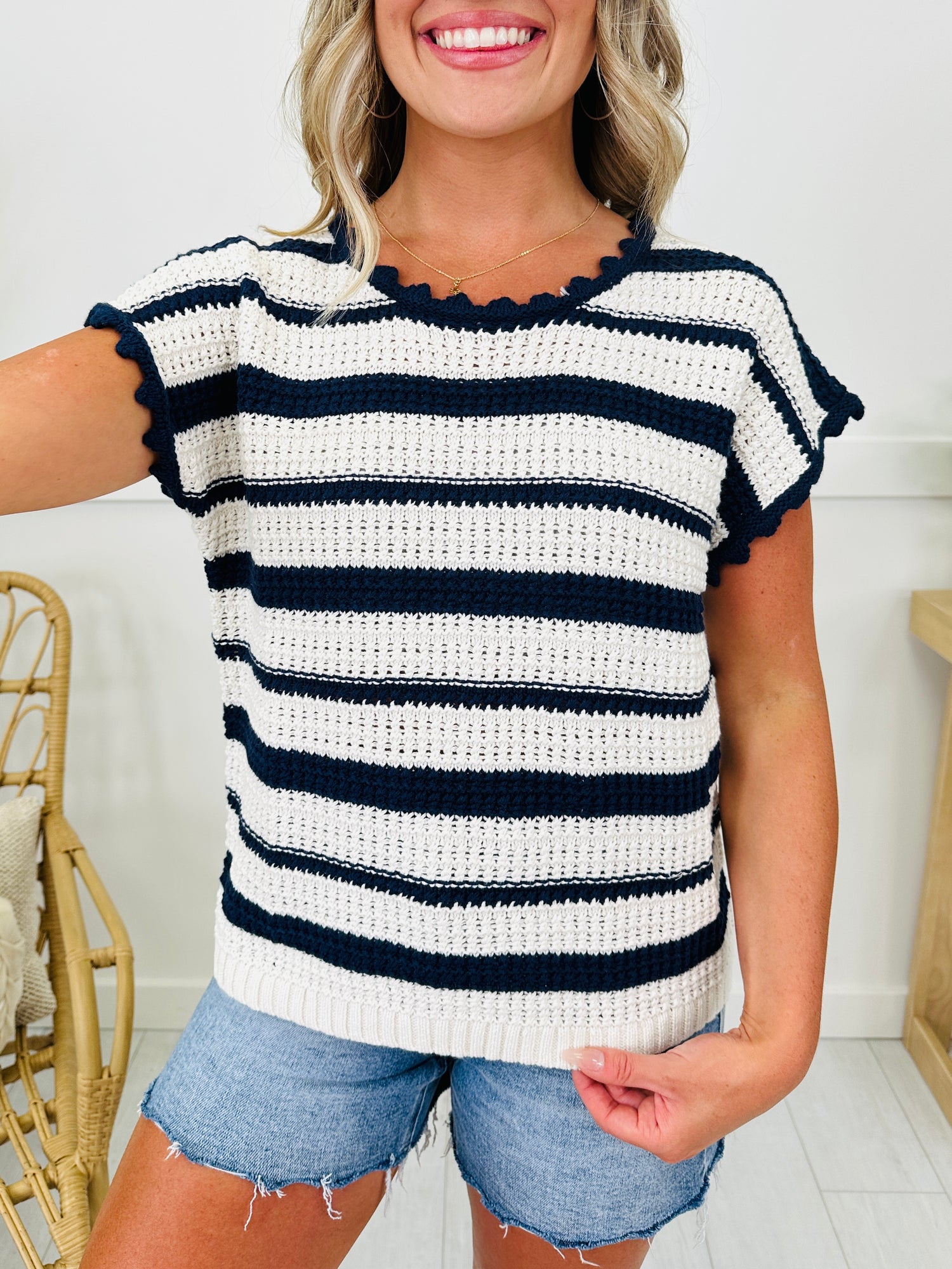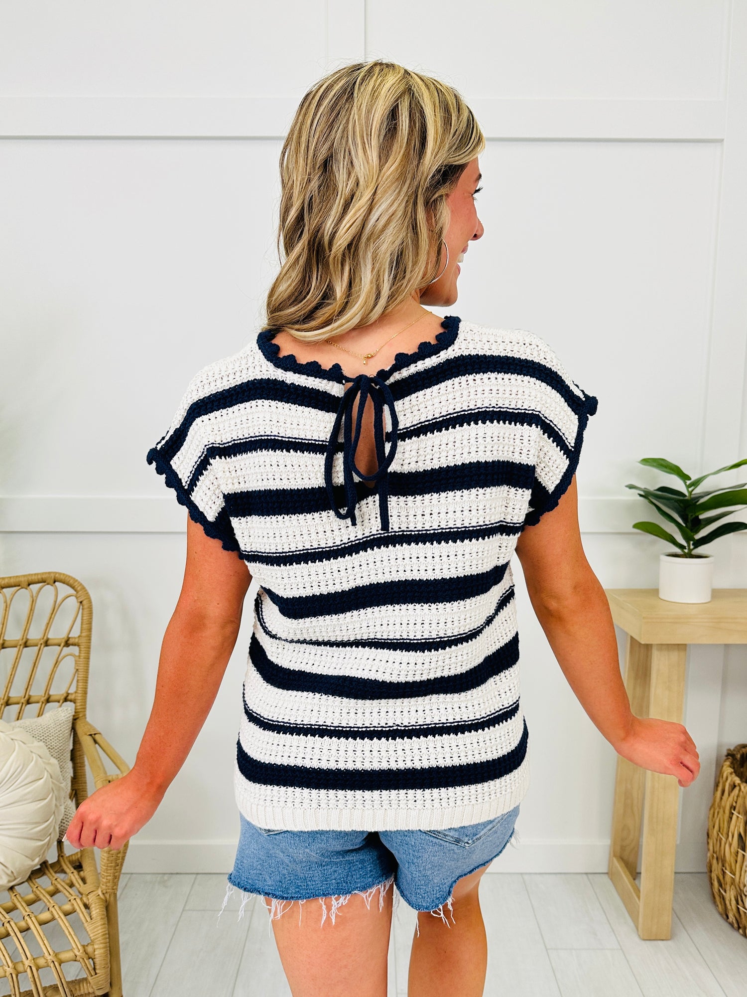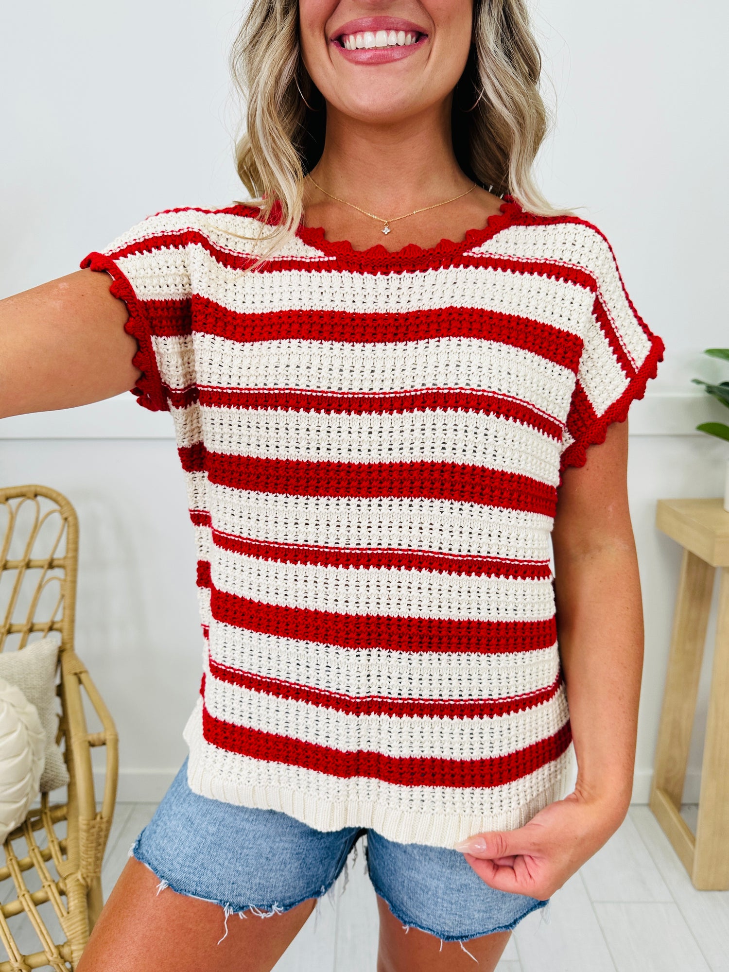 Let Freedom Ring in this new arrival from our Americana Collection. This lightweight knit top is breathable and soft and perfect to wear for Memorial Day, The Fourth of July, and all summer long. We love the cute details on this top including the scalloped neckline and sleeves and the tie in the back. You will look cute and chic all summer in this new arrival!