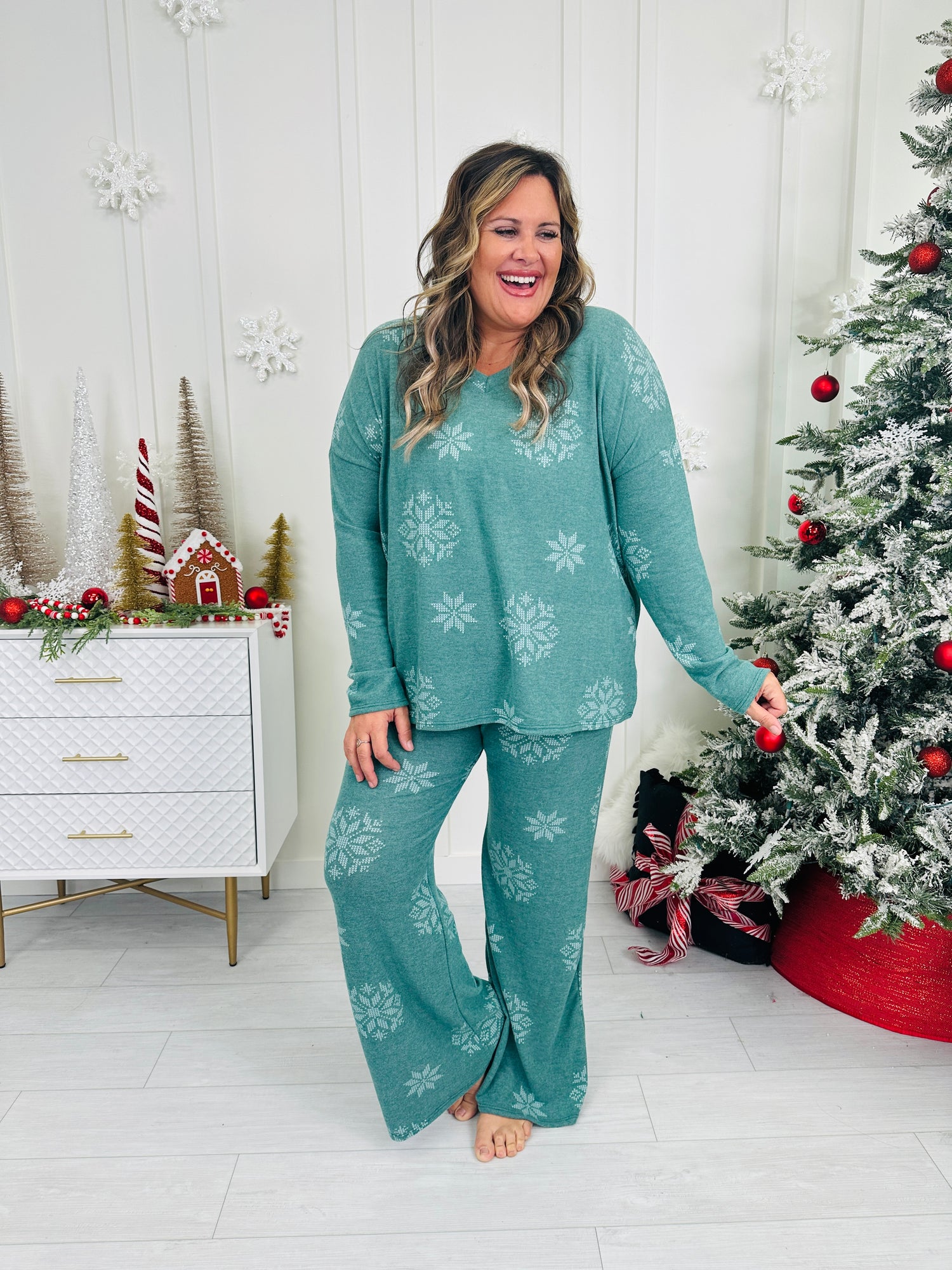 This adorable pajama set brings all the holiday charm with its cheerful snowflake pattern and easy, relaxed silhouette. The matching top and pants create a coordinated look, with both pieces featuring the same festive print for a cute and cozy vibe. With two cheerful color options to choose from, it’s the perfect set for lounging, gifting, or celebrating the season in comfort.